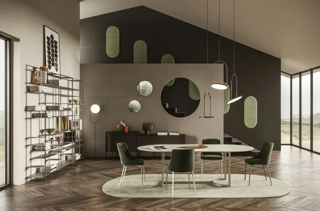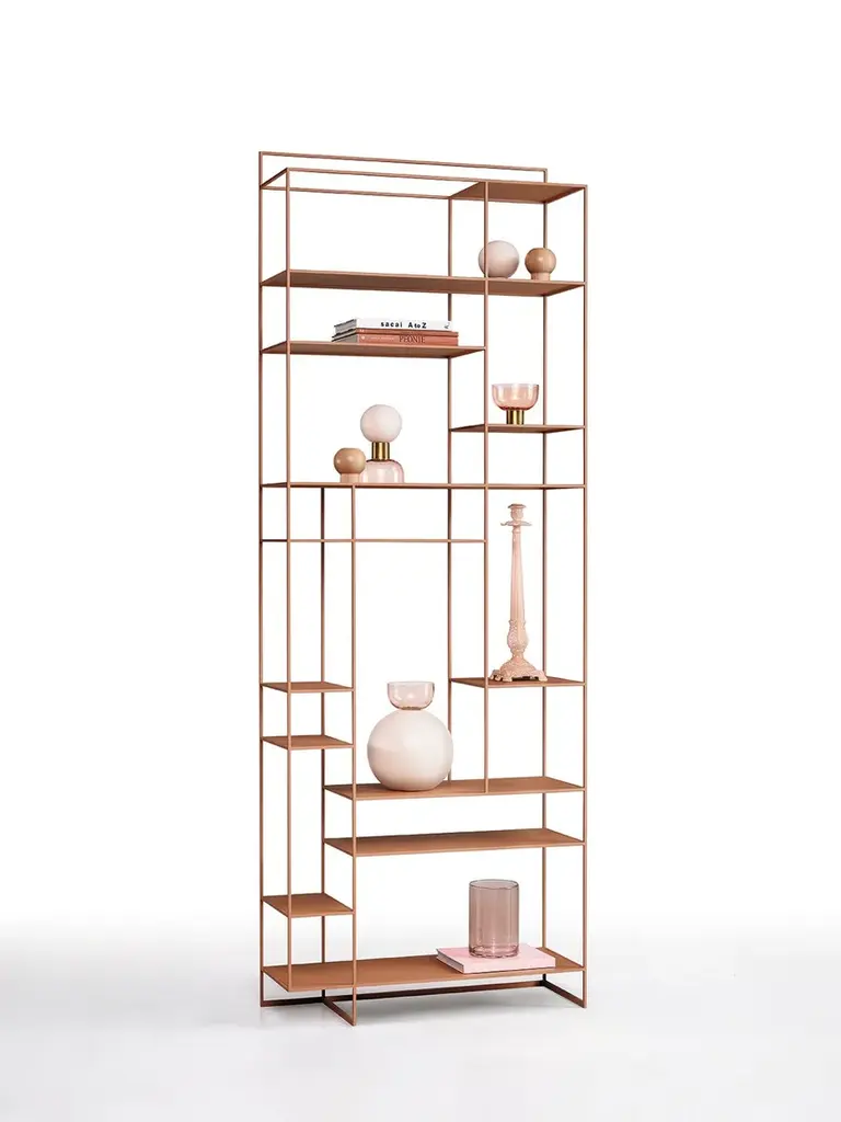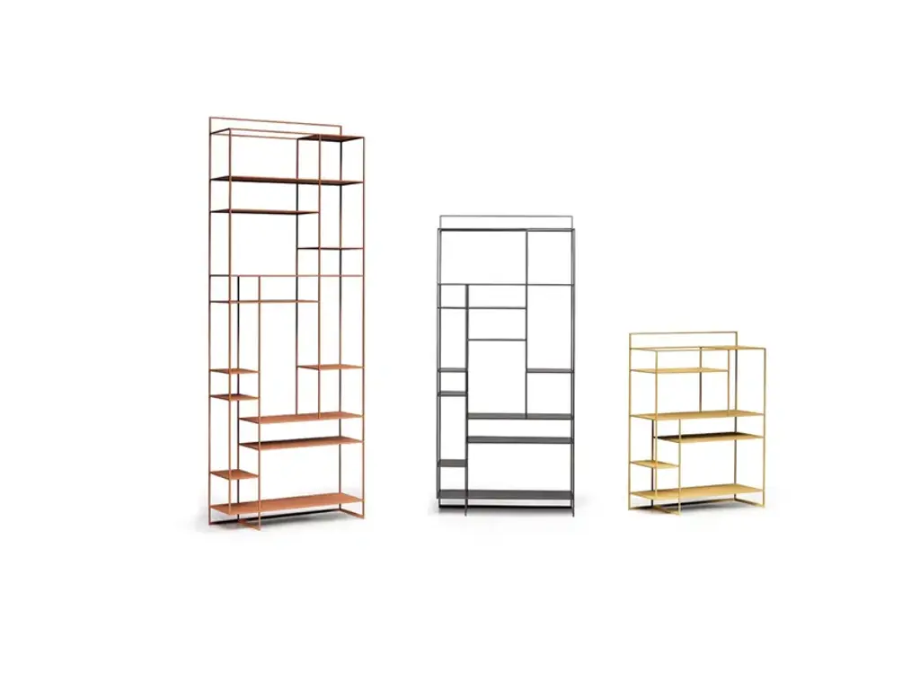 Levia is a painted metal bookcase with minimalist features, where the light figure is combined with a robust soul. Characterized by a geometric play of heights and joints, it reveals an exclusive design and a surprising aesthetic. Levia is a bookcase that comes from a minimalist, almost abstract trait. The fine lines and light figure, which make it extremely versatile, design a painted metal structure that reveals a strong, robust and spacious soul.A geometric game of heights and joints is created by the particular and asymmetrical arrangement of the capacious shelves which, supported by the thin vertical bars of the structure, seem to hang from tapered metal wires. The result is an exclusive and surprising design.