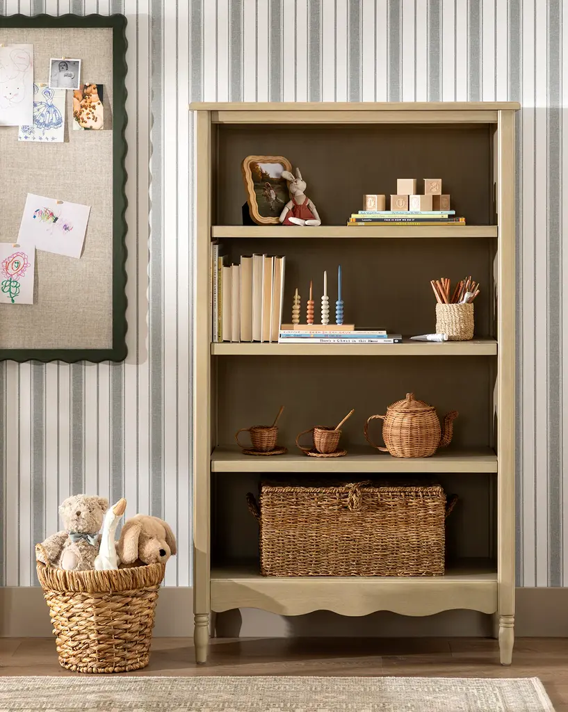 A timeless and charming design in McGee & Co. exclusive finishes. Telling a story of heirloom craftsmanship, the Liberty Bookcase by Namesake features classic molding details. With four open shelves and generous space to display books, toys, and keepsakes, this GREENGUARD Gold Certified piece is created to grow with your family.