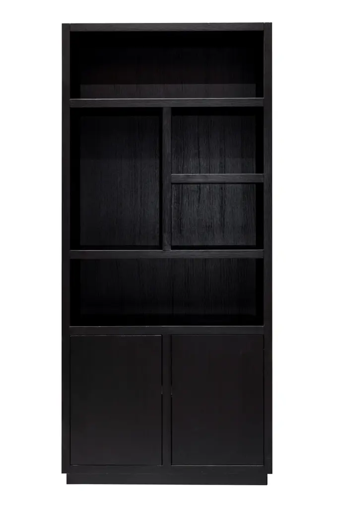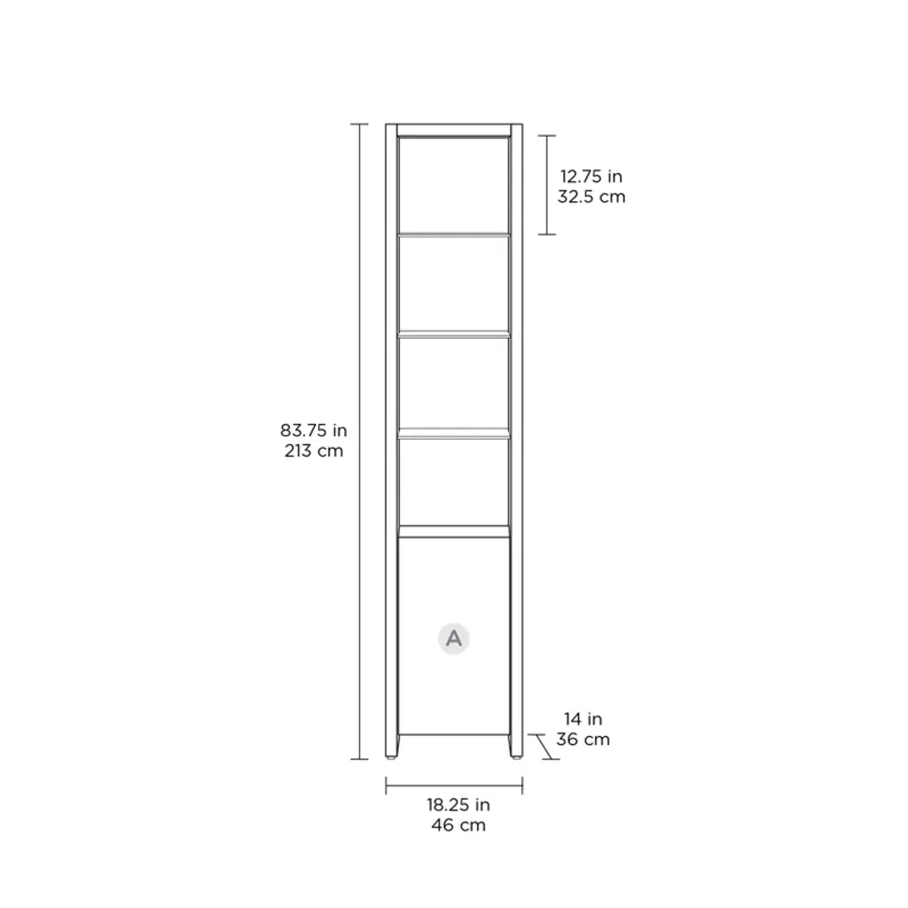 A narrow bookshelf combining open and enclosed storage, perfect on its own or as the foundation for a complete Linea wall system.