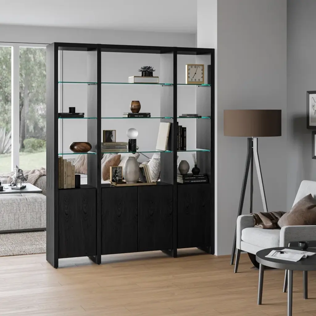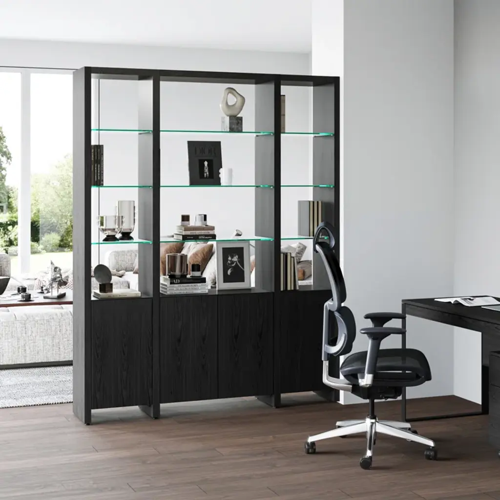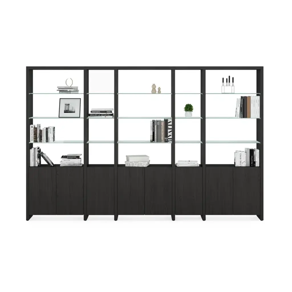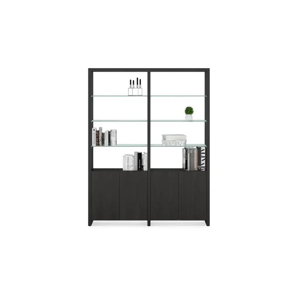 A double bookcase with glass shelves that combines open and enclosed storage, perfect on its own or as the foundation for a complete Linea wall system or room divider.