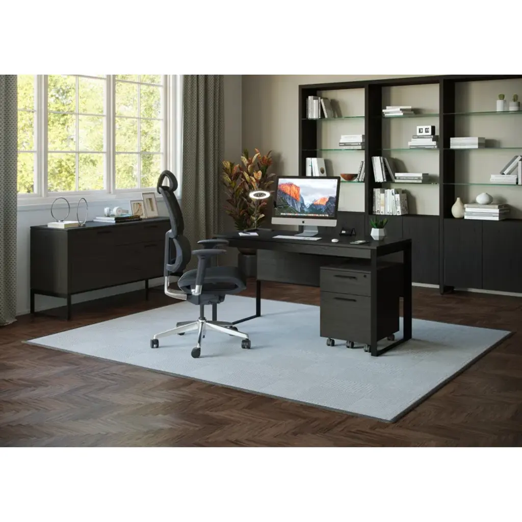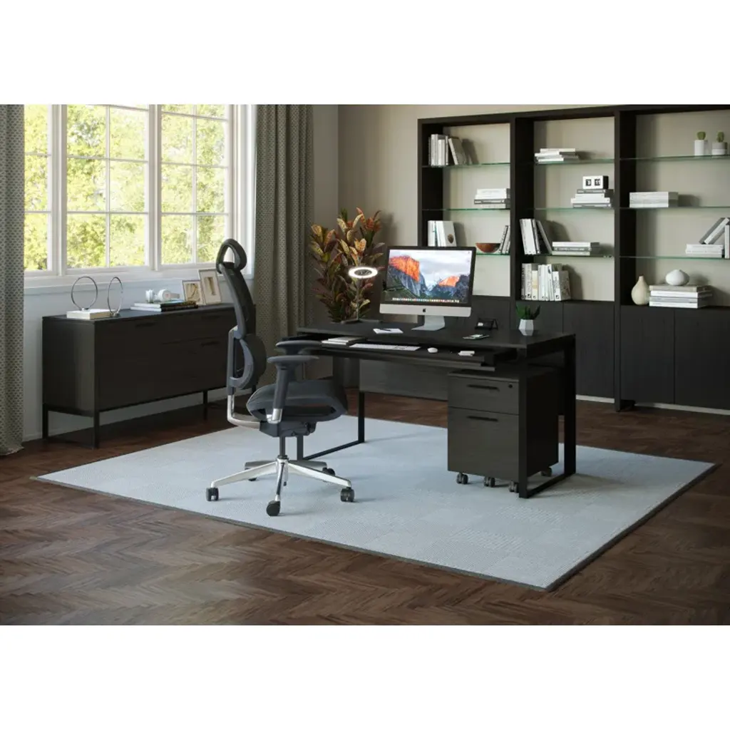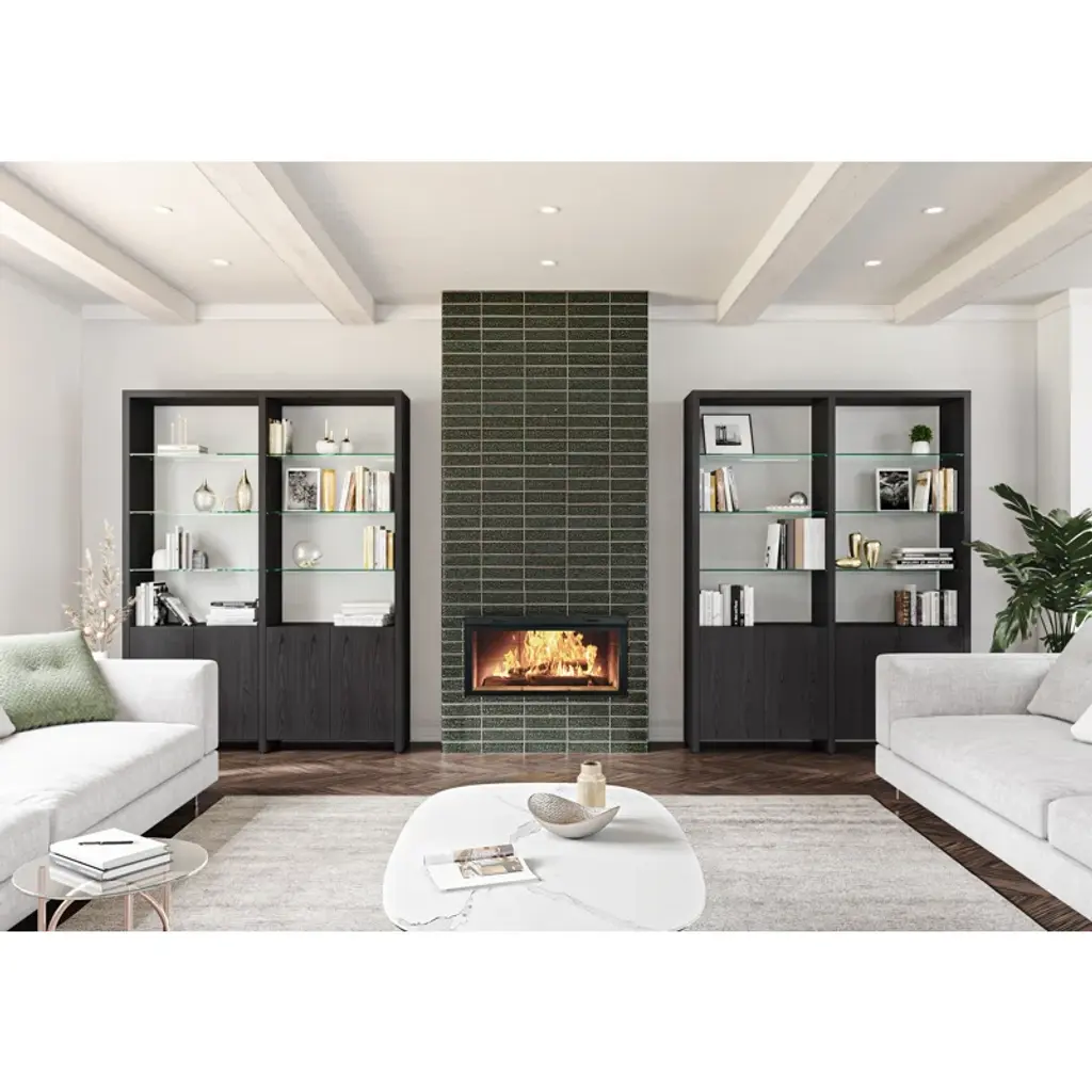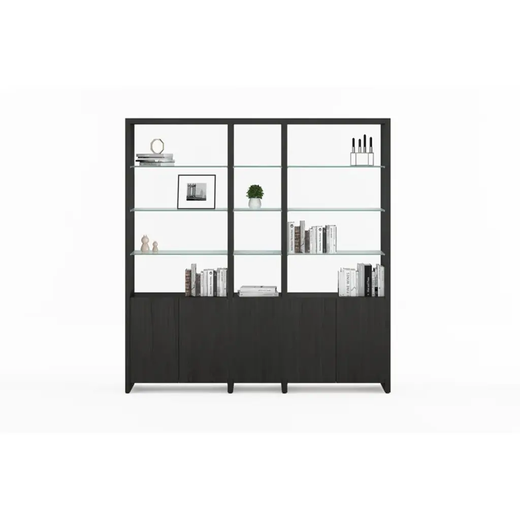 A double bookcase with glass shelves that combines open and enclosed storage, perfect on its own or as the foundation for a complete Linea wall system or room divider.