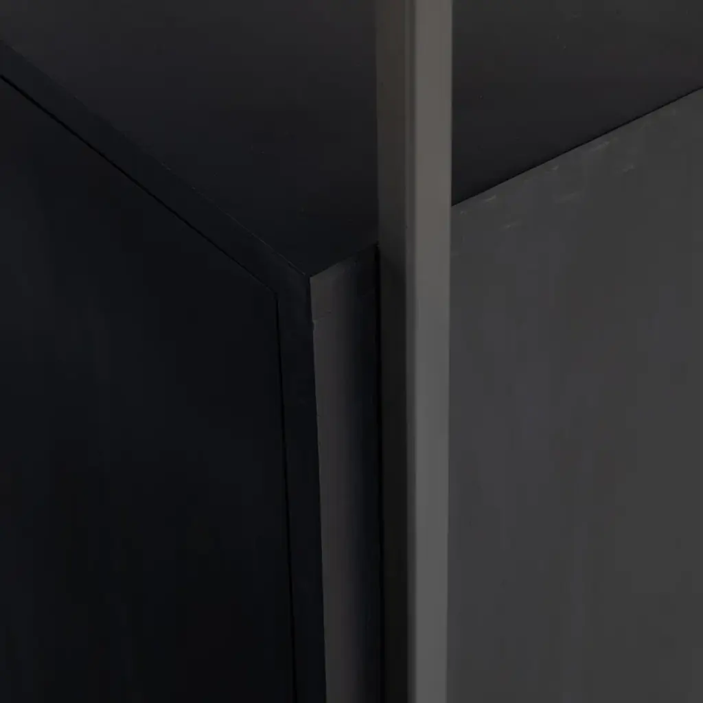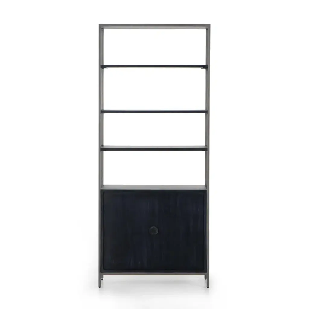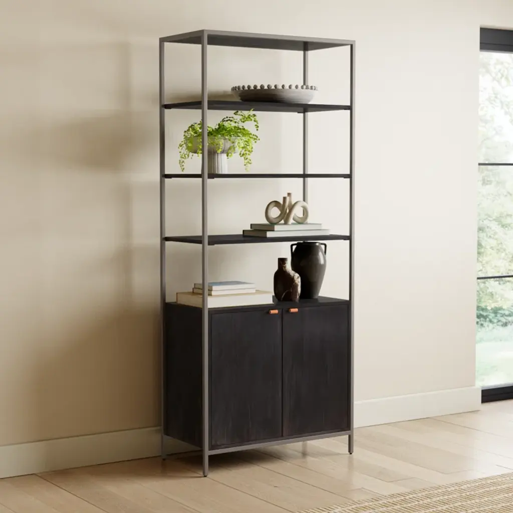 Inspired by clean midcentury design, solid poplar, and raw iron fuse to offer storage and display space for favorite books and treasures. Metal-secured leather pulls add a textural element of surprise. Great alone or doubled and paired with a matching media console.
