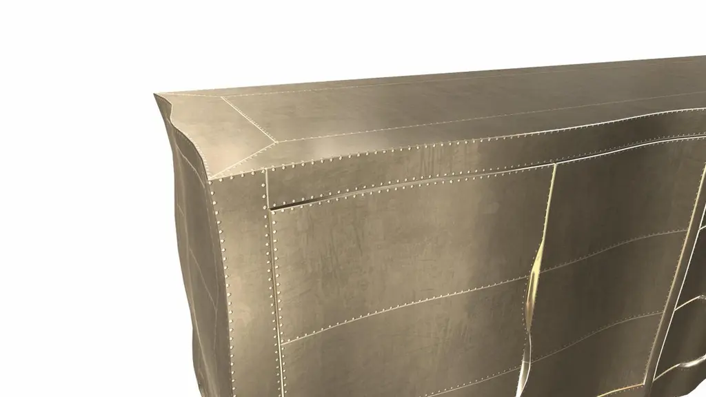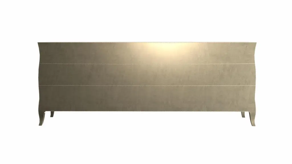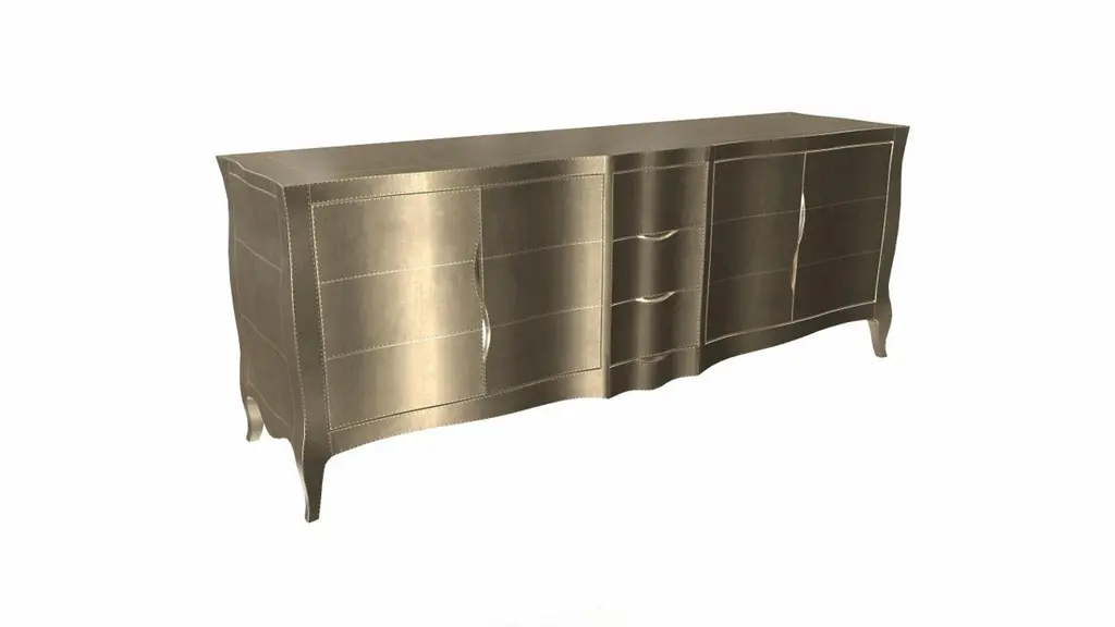 Louise Credenza from our Louise Collection. The renowned designer Paul Mathieu chose the name “Louise Credenza” when he created his more feminine version of Louis XV (1730-1760) furniture. The characteristic cabriole leg, curving outward at the knee and inward towards the foot in an "S" shape was born during this period. It is during the same era that English furniture makers produced the Queen Anne and Chippendale styles.Crafted with utmost care and attention to detail, these Louise Credenza are made to order and are available in twelve metal clad finishes, ensuring that you can choose the perfect one to match your individual style and taste. The use of high-quality materials and expert craftsmanship ensure that each Art Deco Louise Credenza is not only beautiful but also a true piece of Art.The curved legs and side arms of this Art Deco Louise Credenza are hand carved from solid pieces of teak. Pattern makers trace and cut complex forms that will cover the chair in a skin of copper, white bronze, brass or antiqued white bronze The metal finishes will tarnish over time. Regular non-abrasive household metal polishes can be used to restore the original luster.Overall, if you're looking for a piece of furniture that combines luxury, comfort, and style, then the Art Deco Louise Credenza is an excellent choice. With its distinctive curved profile and multiple finish options, this Chair set is sure to elevate the look of any room it is placed in, and be a beloved addition to your home for years to come.The images shown in this listing are shot in different lighting conditions and/or are 3D illustrations. We encourage our customers to please request a sample or a full sample set of 12 finishes so that they can experience the finish first hand. Louise Credenza Art Deco Bookcases in Smooth Brass by Paul Mathieu for Stephanie OdegardSize- 78"L x 21"W x 30"HMaterials - Brass, Metal sheet, Teak, Wood, MetalTechniques: Hand-Crafted, Hand-Carved, Metal Work, Wood Work, Metal Wrapping, PolishedPlease note that moisture in air, sudden change in temperature and natural movement of wood over time causes the metal to wrinkle or bubble up. We use well seasoned, reclaimed teak and high quality marine grade MDF (wherever technically possible) to avoid and delay the mentioned changes. However a perfect stability of metal cannot be guaranteed. Please note that our smooth finish metal clad pieces will have some unavoidable tool marks. This is proof that everything is done by hand. The smooth finish will not come out like a machine made perfect surface and the master Artisan will do their best to make it look as good/clean/stable/perfect as he possibly can.The antique white bronze finish is hand done by using an acidic chemical over the white bronze finish to recreate a natural patination. Like with the natural patination of silver, copper, or brass, the final result and color uniformity of the patina cannot be guaranteed. The goal of this finish is to achieve rainbow-like shades with dull, shiny, cloudy, and streaky patches to give an illusion of antiquing. Please note:None of our metal clad pieces are treated with a protective “finish” thus enabling the items to age naturally over time. We will of course polish them well before we pack them. a) Copper oxidizes faster than the other metals. In six to twelve months it will most likely lose its shine and will gradually turn to different shades of brown and/or green/blue. This aging process and its effect is referred to as verdigris. After a year the piece should not change much more. Copper does not rust, but does require periodic cleaning in order to retain its original shine if that the preferred option. ('BRASSO' or any known copper polish can be used to polish copper).b) Brass retains its shine for far longer than others, but will tarnish if not cleaned on occasion. ('BRASSO' is made to polish brass).c) White bronze, has the least tendency to show age or tarnish. If kept in a controlled climate, this metal will hold its shine for years. It can be cleaned with a cleanser and polished with a cloth. d) The antiqued white bronze finish will react with the natural elements the fastest in the beginning but it too will stop reacting and will settle down in a stable state like copper after 6-12 months. Since it is already antiqued and looked like it is tarnished, as described in an earlier message, this fast reaction will not change the over all look. In that way this surface is most forgiving. The images shown in this listing are shot in different lighting conditions and/or are 3D illustrations. We encourage our customers to please request a sample or a full sample set of 12 finishes so that they can experience the finish first hand.