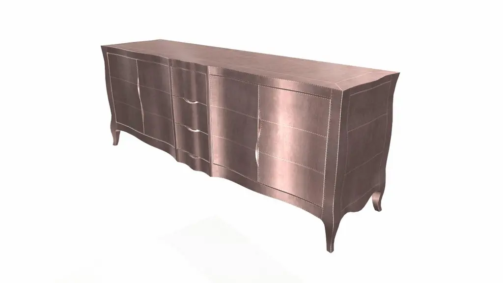 Louise Credenza from our Louise Collection. The renowned designer Paul Mathieu chose the name “Louise Credenza” when he created his more feminine version of Louis XV (1730-1760) furniture. The characteristic cabriole leg, curving outward at the knee and inward towards the foot in an "S" shape was born during this period. It is during the same era that English furniture makers produced the Queen Anne and Chippendale styles.Crafted with utmost care and attention to detail, these Louise Credenza are made to order and are available in twelve metal clad finishes, ensuring that you can choose the perfect one to match your individual style and taste. The use of high-quality materials and expert craftsmanship ensure that each Art Deco Louise Credenza is not only beautiful but also a true piece of Art.The curved legs and side arms of this Art Deco Louise Credenza are hand carved from solid pieces of teak. Pattern makers trace and cut complex forms that will cover the chair in a skin of copper, white bronze, brass or antiqued white bronze The metal finishes will tarnish over time. Regular non-abrasive household metal polishes can be used to restore the original luster.Overall, if you're looking for a piece of furniture that combines luxury, comfort, and style, then the Art Deco Louise Credenza is an excellent choice. With its distinctive curved profile and multiple finish options, this Chair set is sure to elevate the look of any room it is placed in, and be a beloved addition to your home for years to come.The images shown in this listing are shot in different lighting conditions and/or are 3D illustrations. We encourage our customers to please request a sample or a full sample set of 12 finishes so that they can experience the finish first hand. Louise Credenza Art Deco Bookcases in Smooth Copper by Paul Mathieu for Stephanie OdegardSize- 78"L x 21"W x 30"HMaterials - Copper, Metal sheet, Teak, Wood, MetalTechniques: Hand-Crafted, Hand-Carved, Metal Work, Wood Work, Metal Wrapping, PolishedPlease note that moisture in air, sudden change in temperature and natural movement of wood over time causes the metal to wrinkle or bubble up. We use well seasoned, reclaimed teak and high quality marine grade MDF (wherever technically possible) to avoid and delay the mentioned changes. However a perfect stability of metal cannot be guaranteed. Please note that our smooth finish metal clad pieces will have some unavoidable tool marks. This is proof that everything is done by hand. The smooth finish will not come out like a machine made perfect surface and the master Artisan will do their best to make it look as good/clean/stable/perfect as he possibly can.The antique white bronze finish is hand done by using an acidic chemical over the white bronze finish to recreate a natural patination. Like with the natural patination of silver, copper, or brass, the final result and color uniformity of the patina cannot be guaranteed. The goal of this finish is to achieve rainbow-like shades with dull, shiny, cloudy, and streaky patches to give an illusion of antiquing. Please note:None of our metal clad pieces are treated with a protective “finish” thus enabling the items to age naturally over time. We will of course polish them well before we pack them. a) Copper oxidizes faster than the other metals. In six to twelve months it will most likely lose its shine and will gradually turn to different shades of brown and/or green/blue. This aging process and its effect is referred to as verdigris. After a year the piece should not change much more. Copper does not rust, but does require periodic cleaning in order to retain its original shine if that the preferred option. ('BRASSO' or any known copper polish can be used to polish copper).b) Brass retains its shine for far longer than others, but will tarnish if not cleaned on occasion. ('BRASSO' is made to polish brass).c) White bronze, has the least tendency to show age or tarnish. If kept in a controlled climate, this metal will hold its shine for years. It can be cleaned with a cleanser and polished with a cloth. d) The antiqued white bronze finish will react with the natural elements the fastest in the beginning but it too will stop reacting and will settle down in a stable state like copper after 6-12 months. Since it is already antiqued and looked like it is tarnished, as described in an earlier message, this fast reaction will not change the over all look. In that way this surface is most forgiving. The images shown in this listing are shot in different lighting conditions and/or are 3D illustrations. We encourage our customers to please request a sample or a full sample set of 12 finishes so that they can experience the finish first hand.