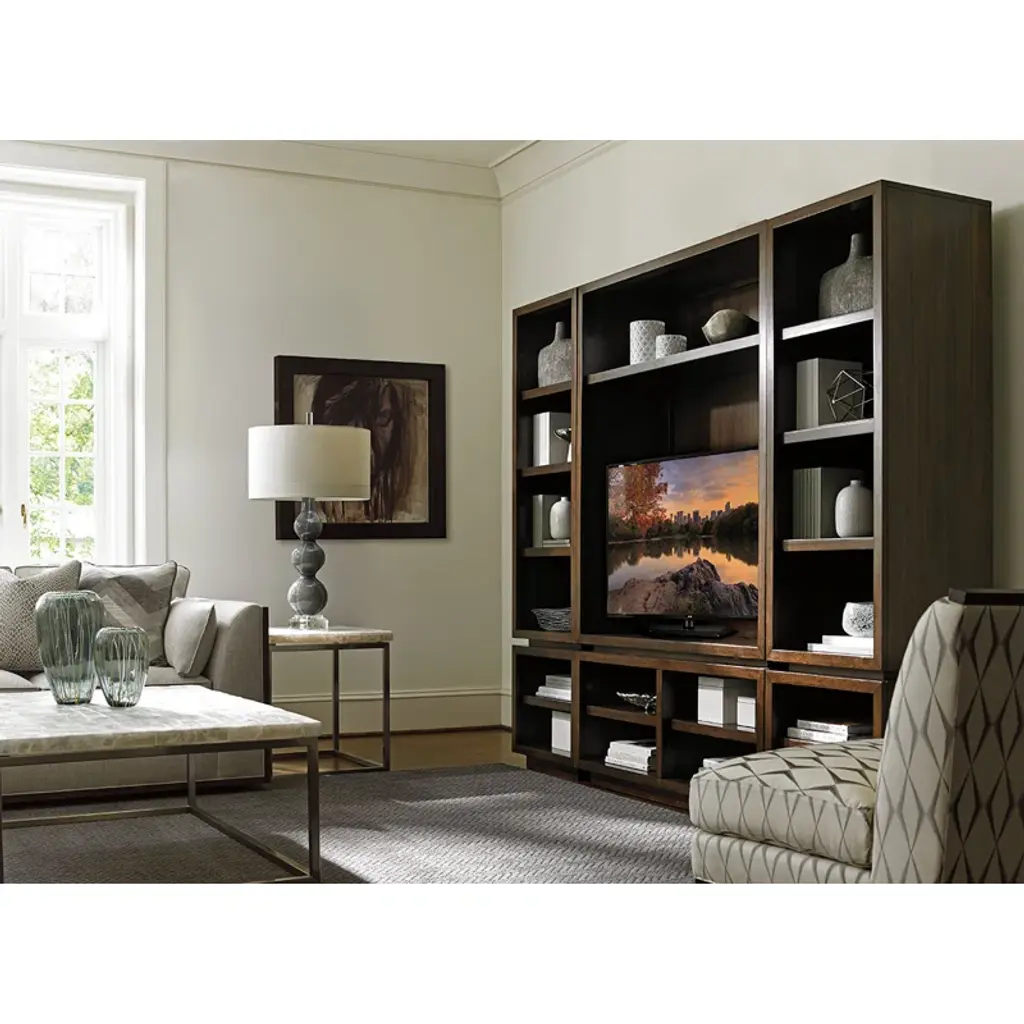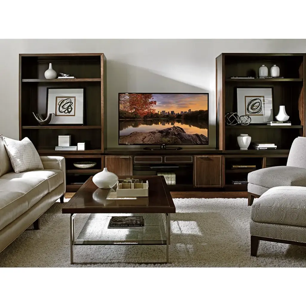 Bookcases are not limited to books. Many of us enjoy celebrating our love for art, displaying unique pieces acquired via our travels, or showcasing collectibles. With this in mind, we offer the bunching bookcases. With the plinth base and straight sides, there are numerous configurations including next to the media console. The top shelf is stationary to ensure proper stability and the remaining four shelves are adjustable or removable. Grommets in the base ensure media cords are out of sight.