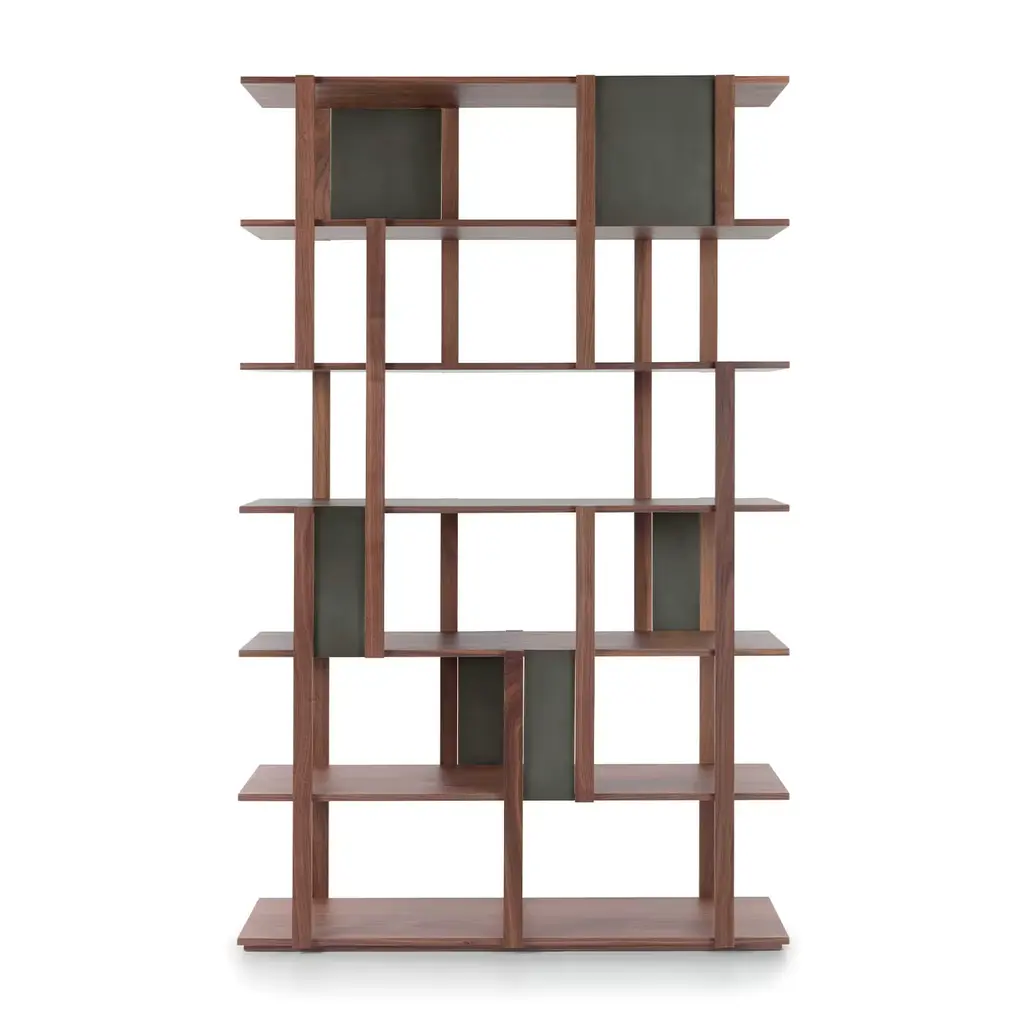 In this freestanding, modular double-sided bookcase, the essence of wood meets the elegance of metal details adorning the structure and shelves veneered in Canaletto walnut. Upon request, it can be enriched with the addition of metal inserts painted in titanium, bronze, or patinated brass tones, creating a fascinating alternation of full and empty areas. Position it at the center of the room, as an open partition, or lean it against a wall. Please consult the Concierge for customization options.