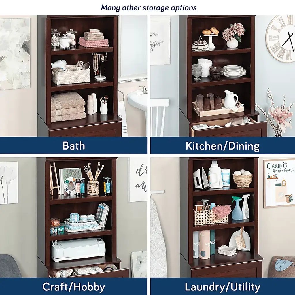 The Mazehut brown bookcase has two adjustable shelves to add versatile display options. Two spacious drawers feature metal runners and safety stops. Quick and easy assembly with slide-on moldings and T-lock drawer system. Customer assembly is required.