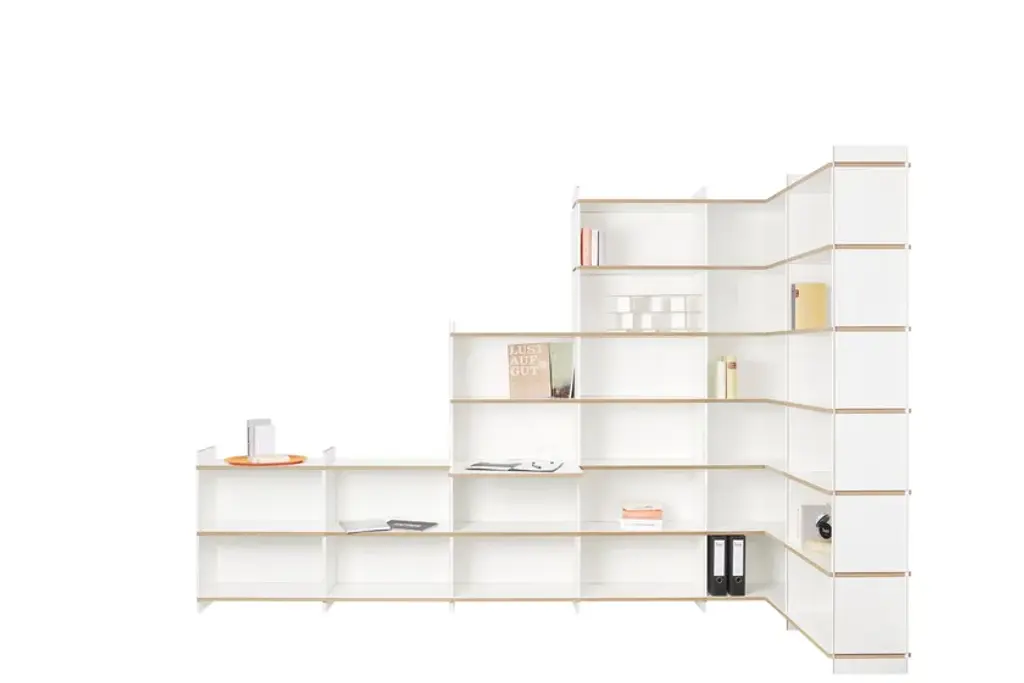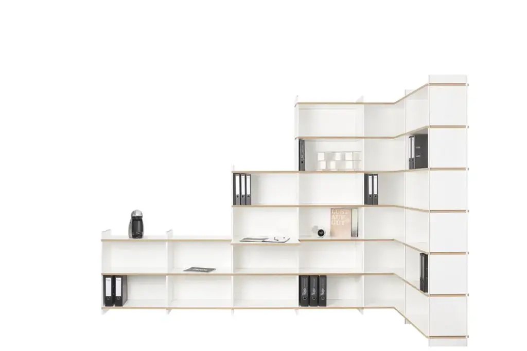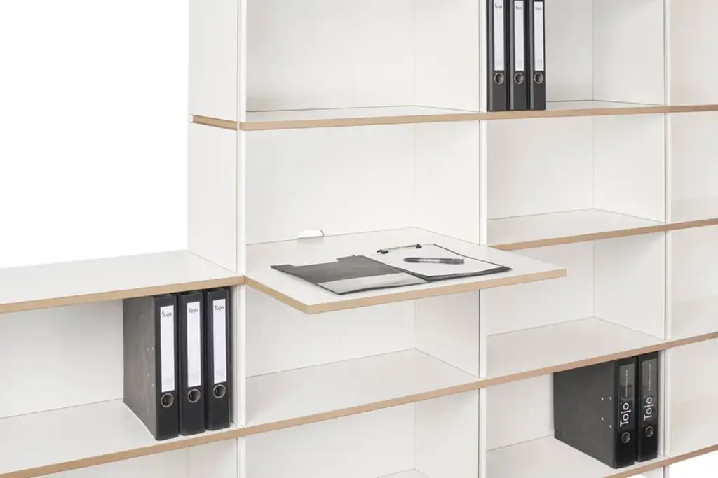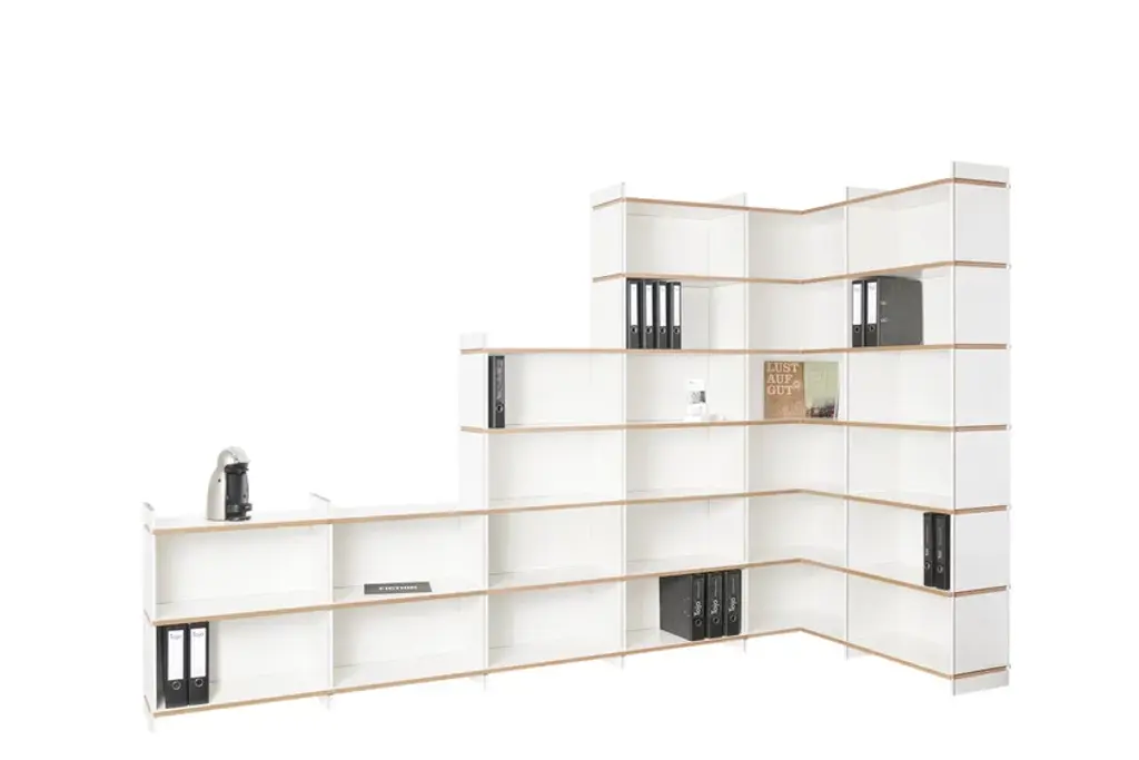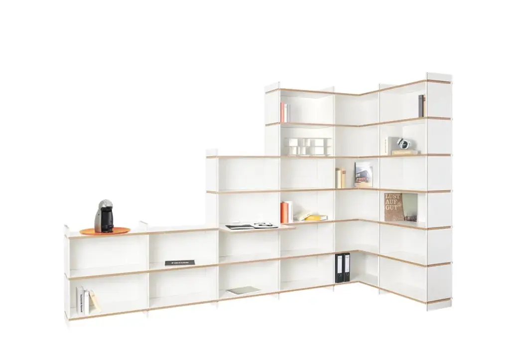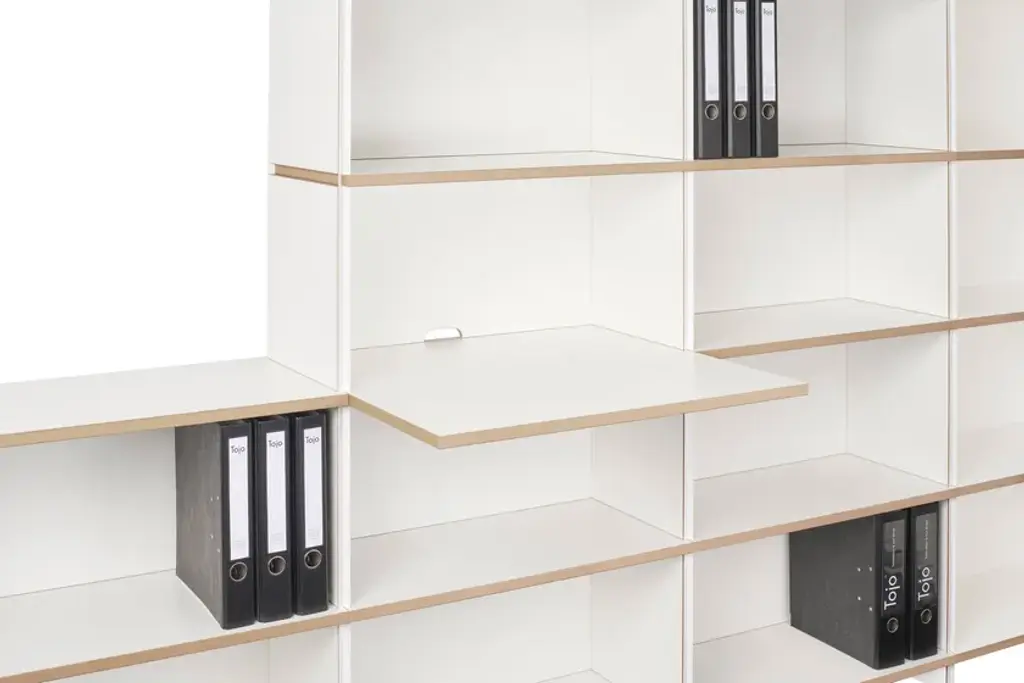Mehrfach is an individual shelving system, which can be built without additional connecting means in a variety of forms. The system is available in three heights. Whether as a soloist, sideboard, room divider, or as an endlessly connected shelf. Mehrfach can be customized without effort, any room situation, individually and uniquely. Tools are not needed. With the extension to the Tojo-mehrfach eckmodul the shelf can be build over the corner. Right and left, the shelf can be expanded or supplemented as desired with the three different height modules. With the shelf extension schreibboden) there is another element suitable for the shelving system. Wonderful use as a small, integrated writing secretary with cable passage in the back wall. Useful to put down a folder in which something is to look up.