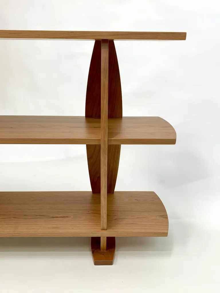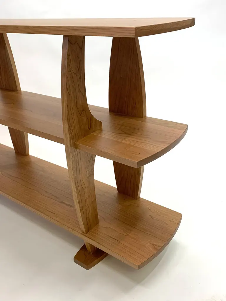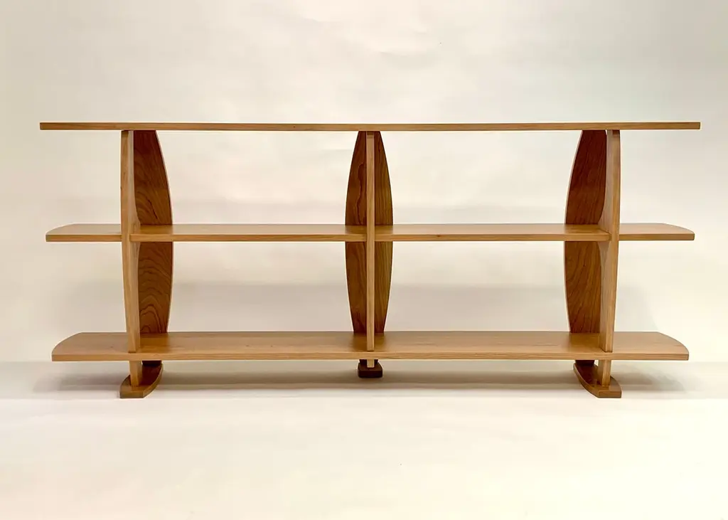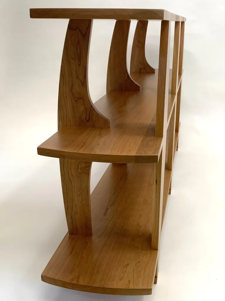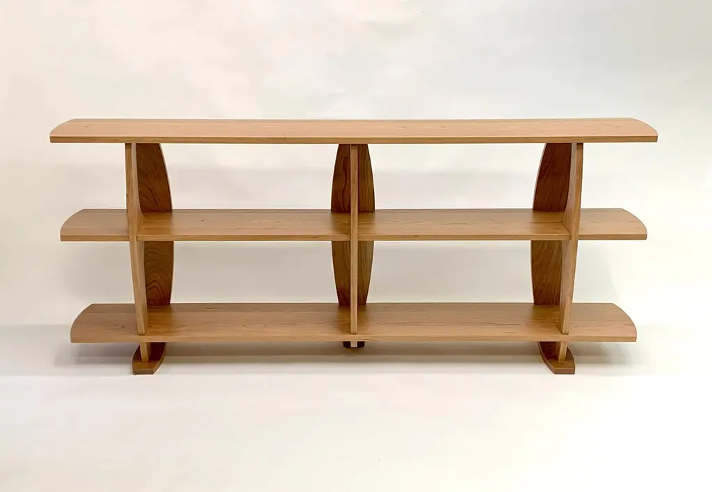 Inspired by mid-century modernism, Floe is made from solid hardwood using real joinery. With its low profile, Floe will fit nicely under a window by the wall, or against the back of a sofa in the middle of the room. Please inquire if you are interested in obtaining Floe made from a wood species different from what is currently available.The story behind Floe:A few years ago James needed a low-profile bookcase to fit under a pair of tall windows. He wanted to use as little material as possible for the upright members, while still providing strength, and realized this meant orienting the vertical pieces at 90 degrees to each other. And minimizing material meant that the vertical pieces would be narrower at the top and bottom and fatter in the middle. It turns out that the visual result of these engineering constraints is pleasing to the eye. That first bookcase needed to be so short that there was no room for legs. These got added in later iterations.