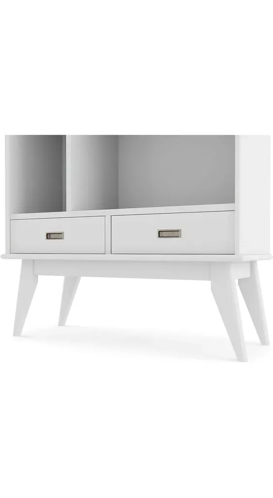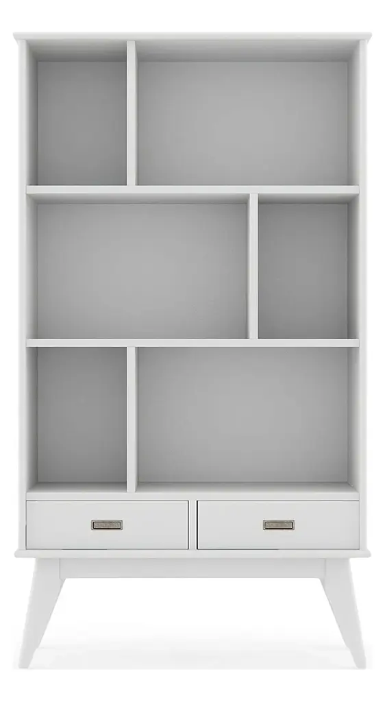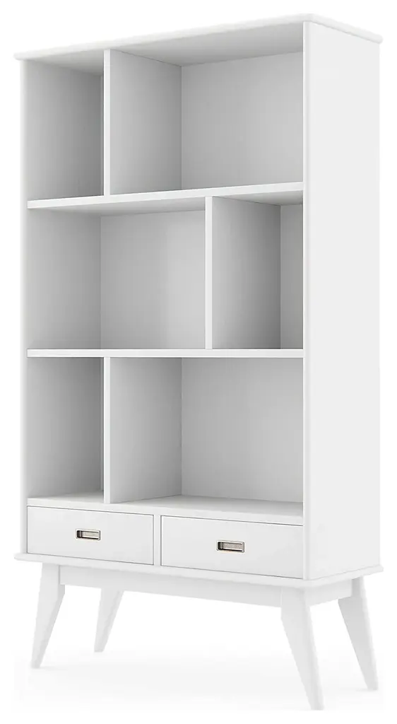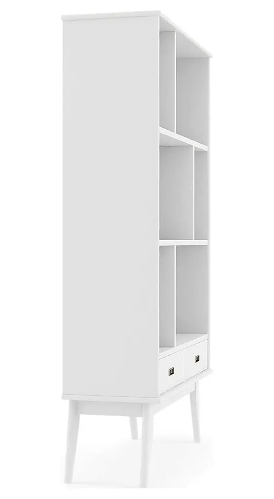 Mid Century Modern Bookcase With 6 Open Compartments And 2 Storage Drawers, White