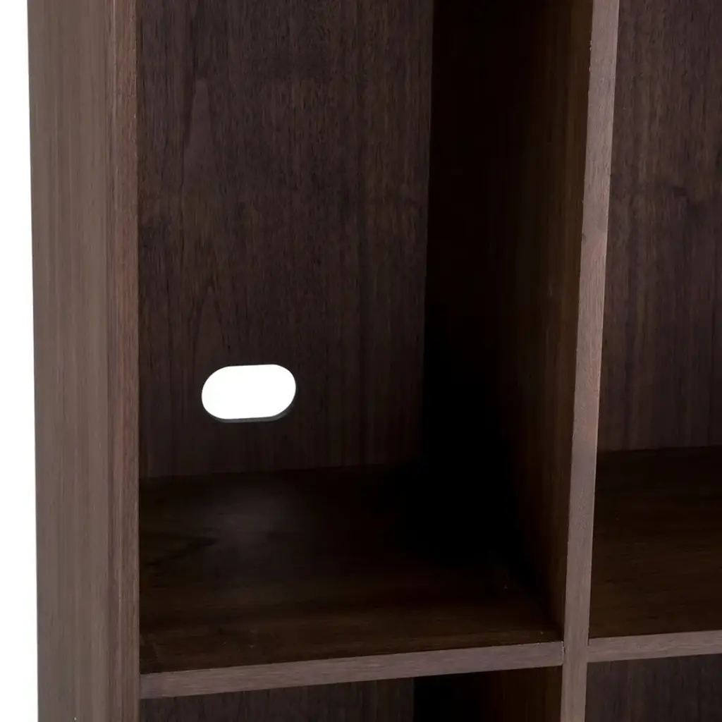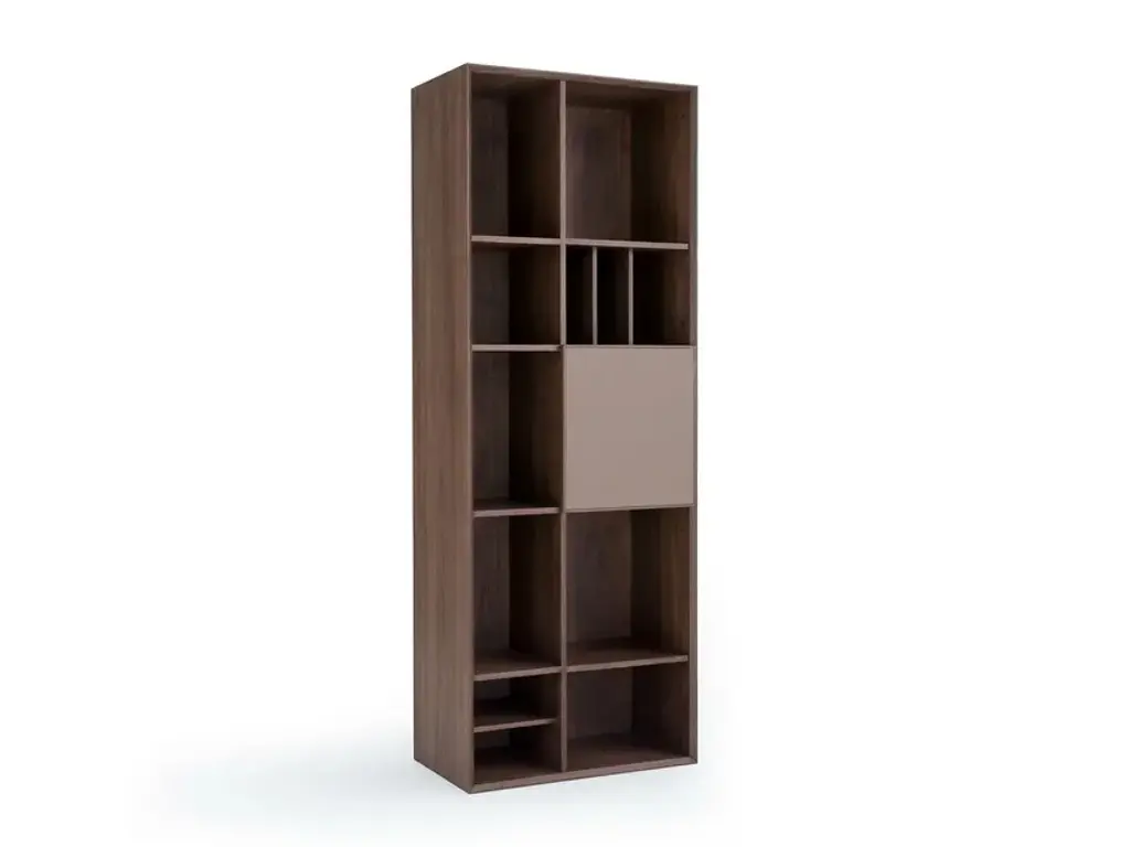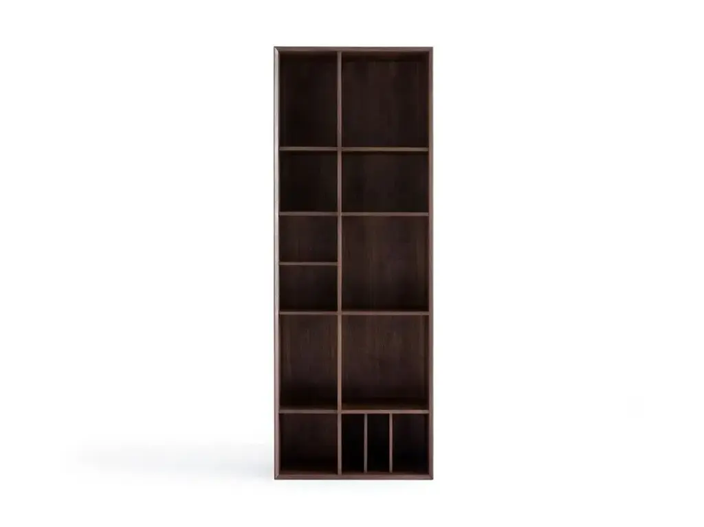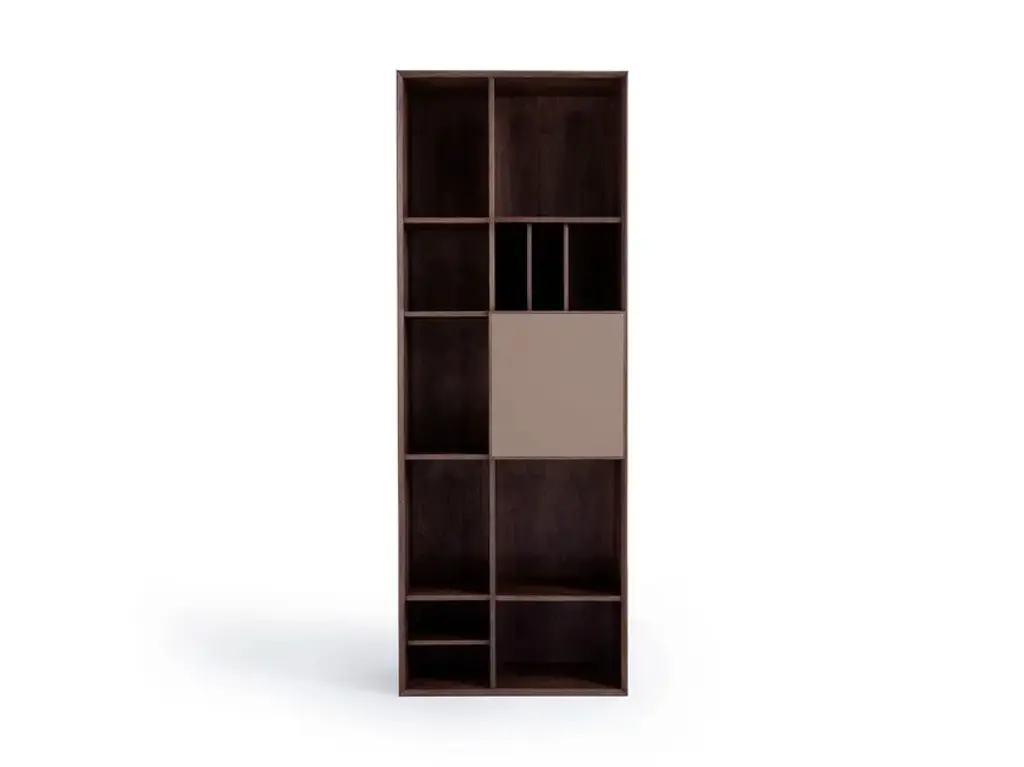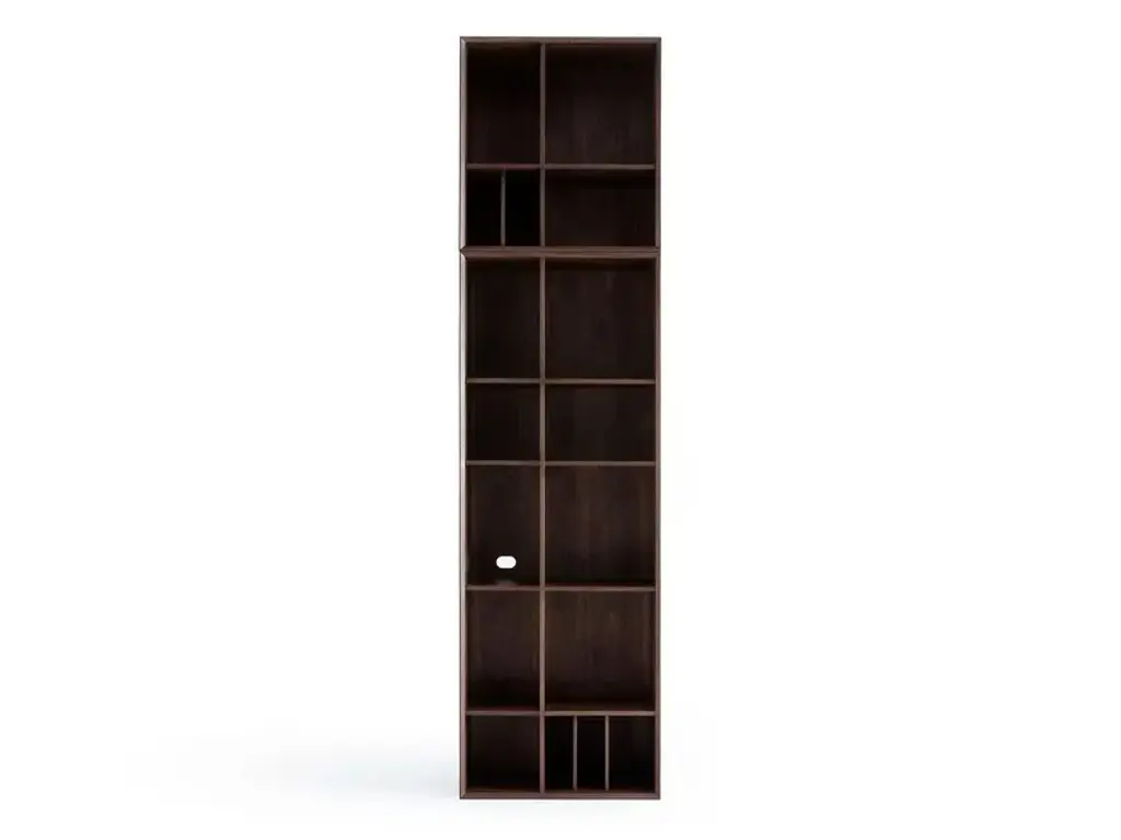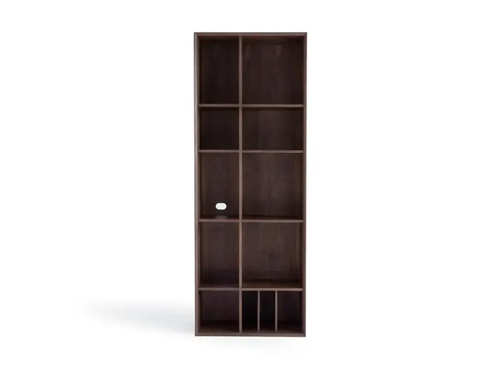 Taken from the Mikube modular storage system, this wall-mounted element is designed to be used on its own or with other modules from the range, to create a XXL bookcase, for example The bookcase is made of MDF veneered with FSC® walnut, its edges have a 45° cut. Available version with 1 door upholstered in genuine Italian leather (cowhide, corrected grain, aniline finish, chrome-tanned), soft closing.Made of MDF with FSC® walnut veneer, nitrocellulose finish1 grommet insert (hidden behind a removable shelf)Fixed shelvesWall fastening required for safety
