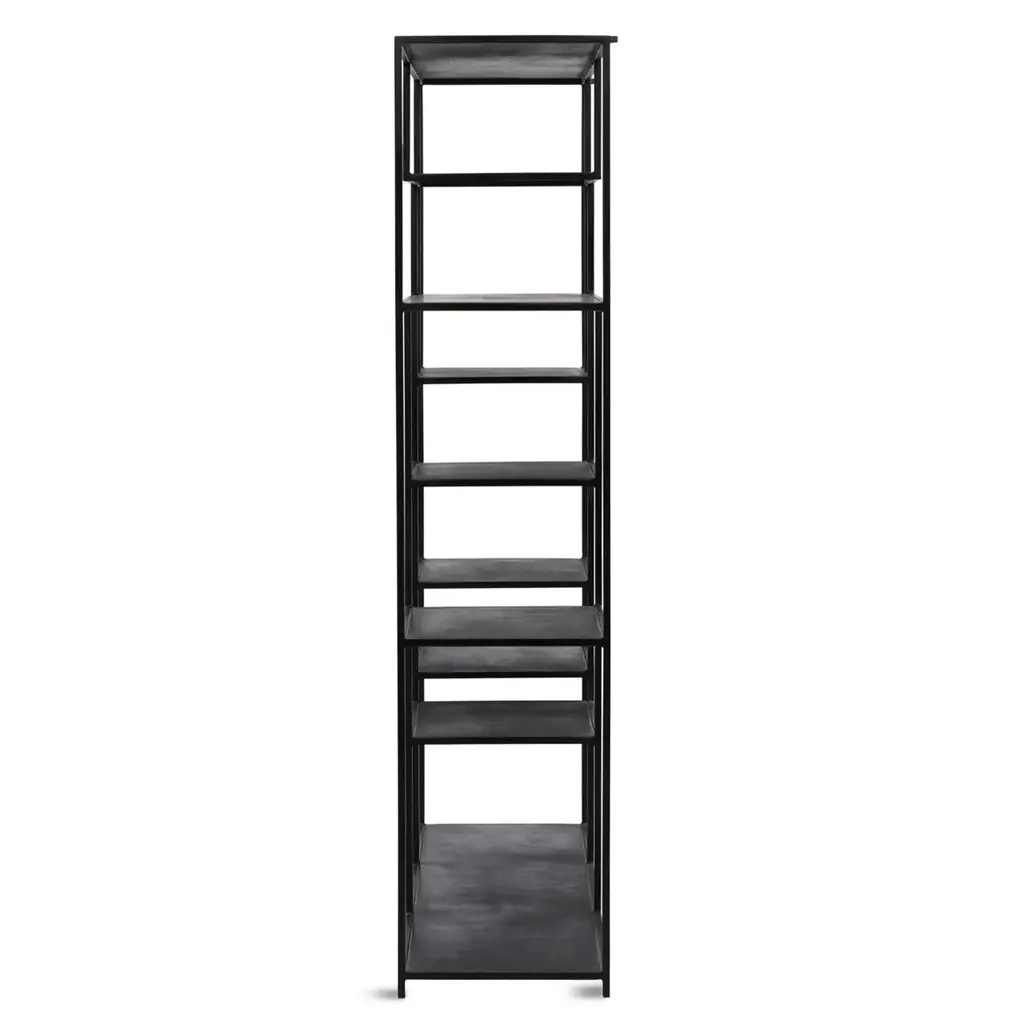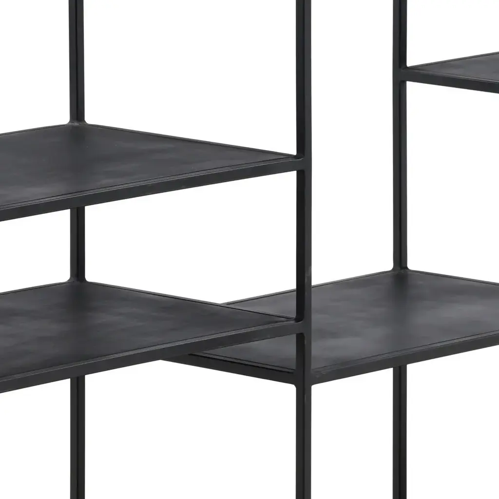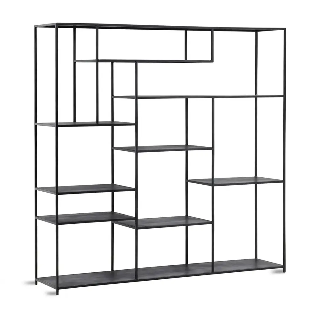 Modern black iron large square bookcase / display shelves. Varying sizes of shelves make for a dynamic and interesting piece. Weighs approx. 130 lbs.
