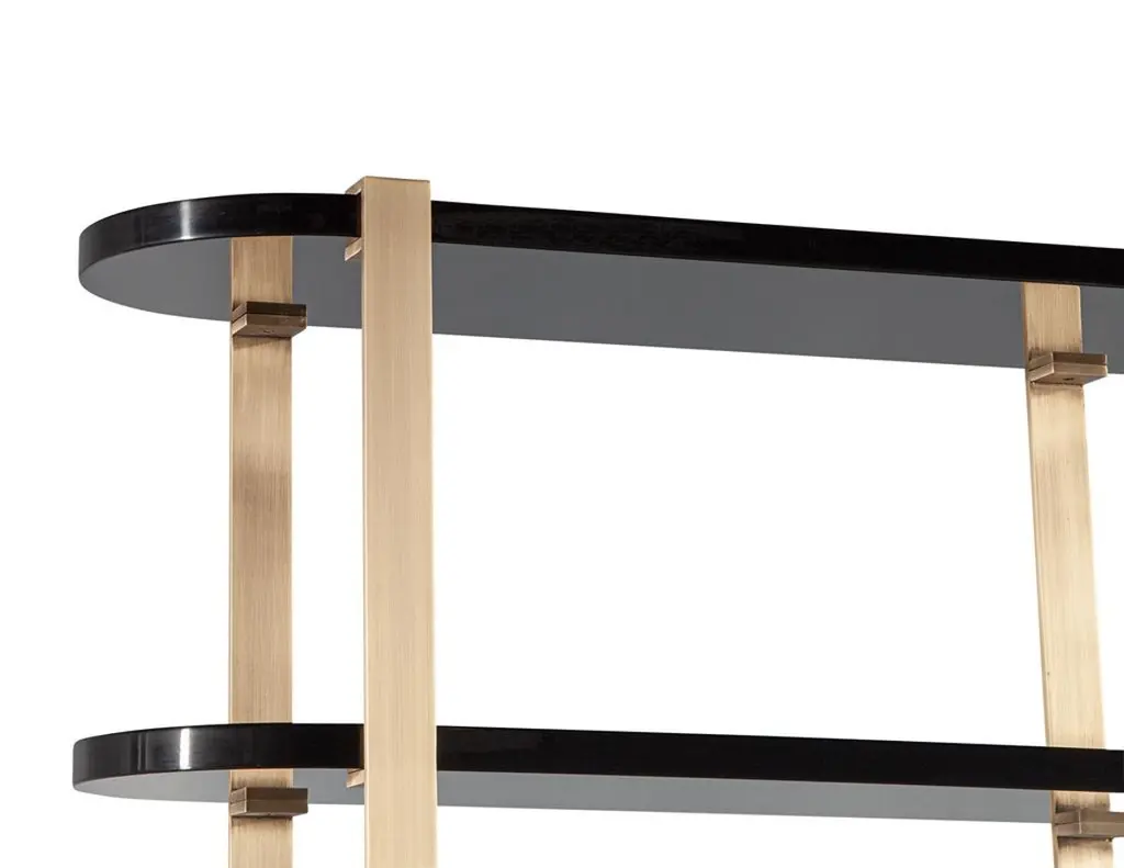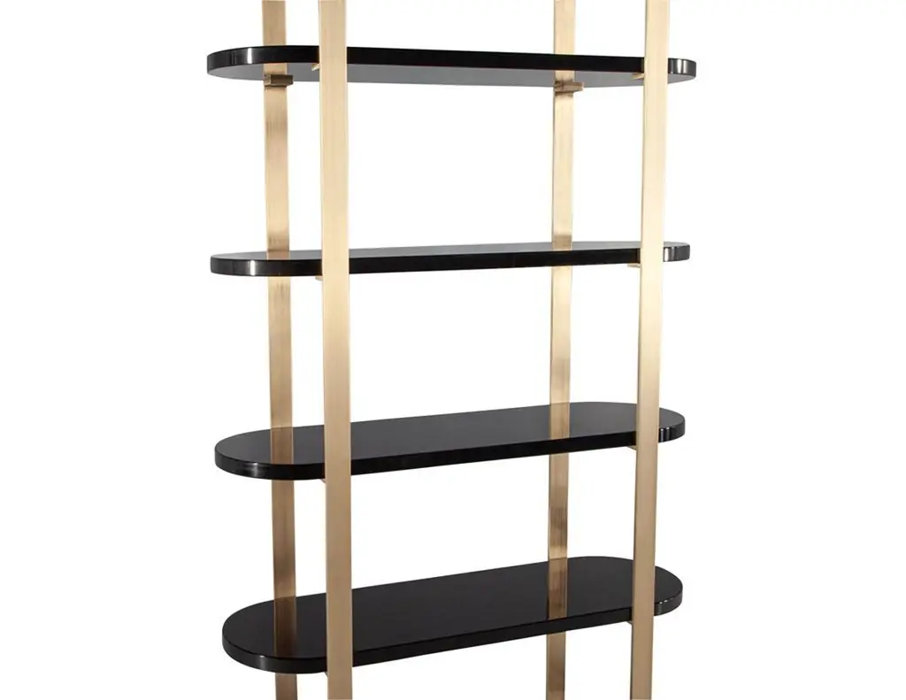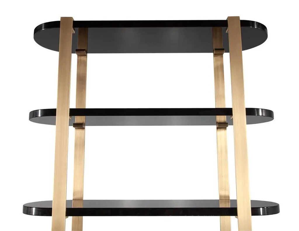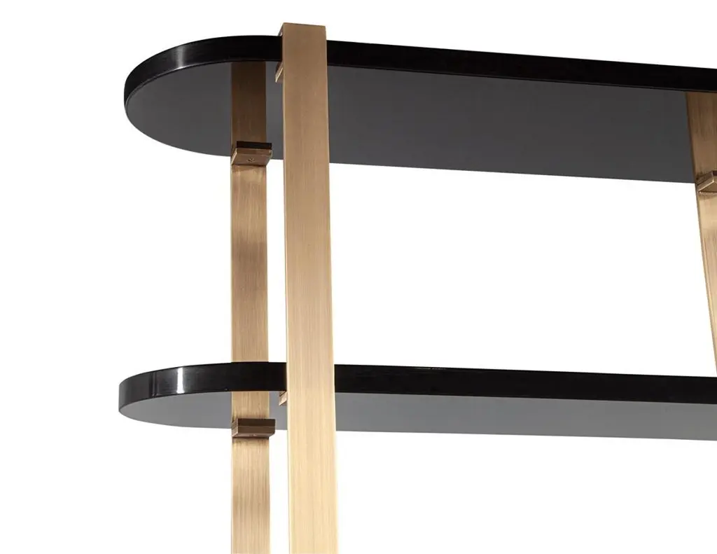Indulge in the epitome of modern sophistication with our exclusive black bookcase cabinet, a masterpiece handcrafted in Canada. This striking piece boasts an alluring blend of high-gloss black lacquered rounded shelves and a substantial solid metal brass plated frame. Each shelf is meticulously hand-polished to create an immaculate, lustrous surface that reflects light effortlessly. The sleek design and rounded corners lend a contemporary touch, while the generous size provides ample space to showcase your treasured books and decorative accents. The sturdy brass frame ensures exceptional stability and durability, making this cabinet a timeless investment. Its modern styling and sleek lines seamlessly complement any décor, adding a touch of elegance and sophistication to your living space.Due to this items size and weight, complimentary shipping services are dock to dock only to a mover/receiver contracted by the customer. Shipping directly to a residential location is not included or possible.
