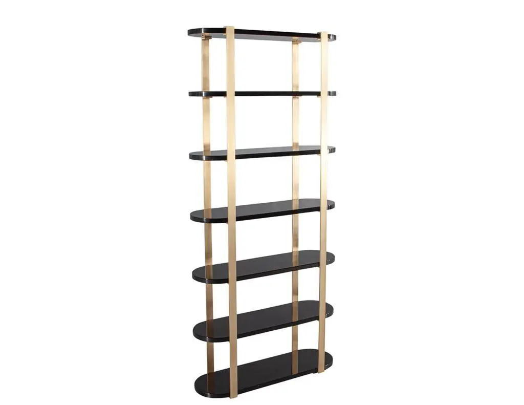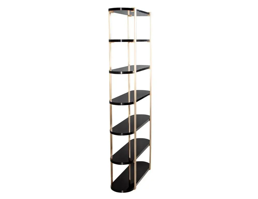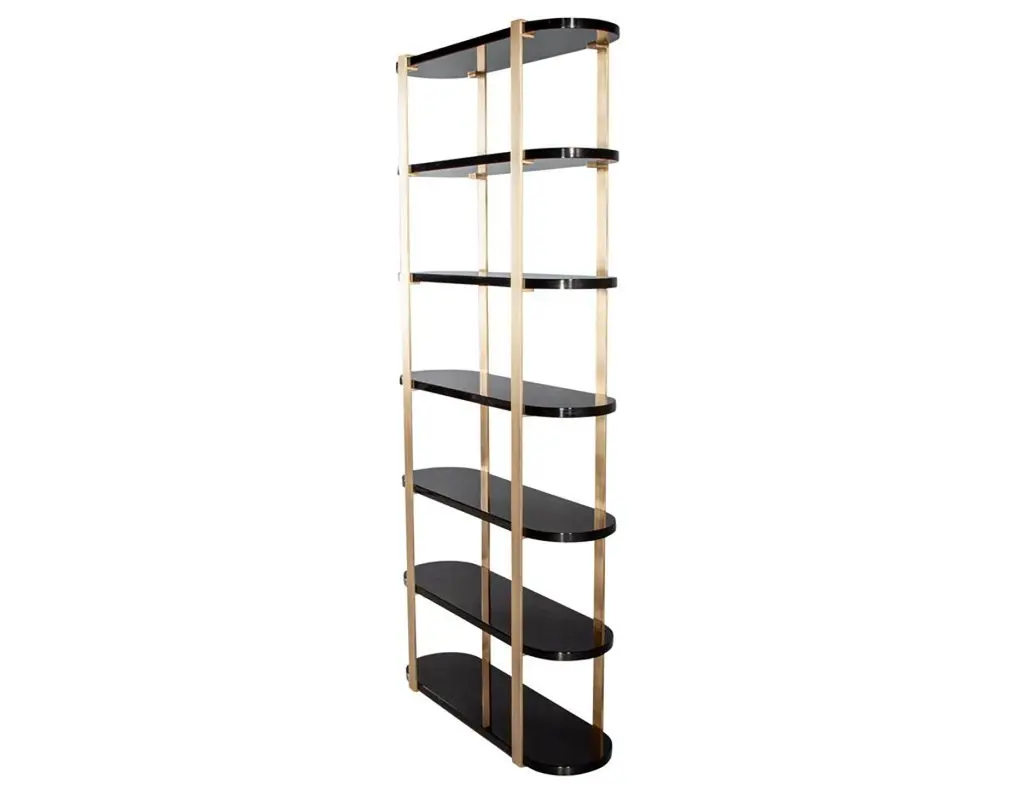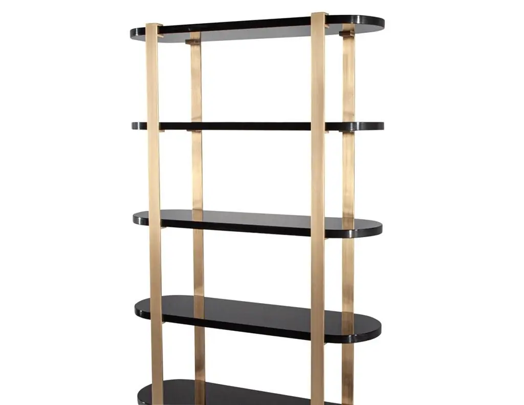 Indulge in the epitome of modern sophistication with our exclusive black bookcase cabinet, a masterpiece handcrafted in Canada. This striking piece boasts an alluring blend of high-gloss black lacquered rounded shelves and a substantial solid metal brass plated frame. Each shelf is meticulously hand-polished to create an immaculate, lustrous surface that reflects light effortlessly. The sleek design and rounded corners lend a contemporary touch, while the generous size provides ample space to showcase your treasured books and decorative accents. The sturdy brass frame ensures exceptional stability and durability, making this cabinet a timeless investment. Its modern styling and sleek lines seamlessly complement any décor, adding a touch of elegance and sophistication to your living space.Due to this items size and weight, complimentary shipping services are dock to dock only to a mover/receiver contracted by the customer. Shipping directly to a residential location is not included or possible.