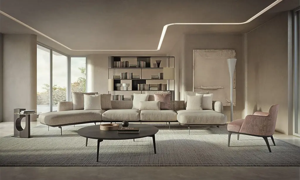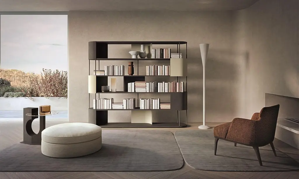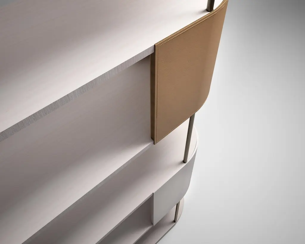 "Gae" modular bookcase is inspired by the volumes of Piazza Gae Aulenti in Milan. The materials used for the compositions are precious woods such as light Tay, Dark Tay, Canaletto Walnut, leather and metal. Different modular solutions can be studied using the various elements such as the shelves, curved element and metal support. The metal elements available in gold-bronze finish and lead finish. It can also be used as a furnishing element in the center of the room.