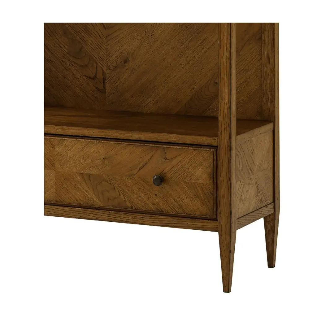 A Modern herringbone parquetry bookcase in our dark oak Dusk finish with three veneered shelves and a herringbone parquetry design on the bottom drawer. It sits on tapered legs with Verde Bronze finished knobs. A beautiful functional piece for storage and displaying treasures. Dimensions: 46" W x 16" D x 89" H