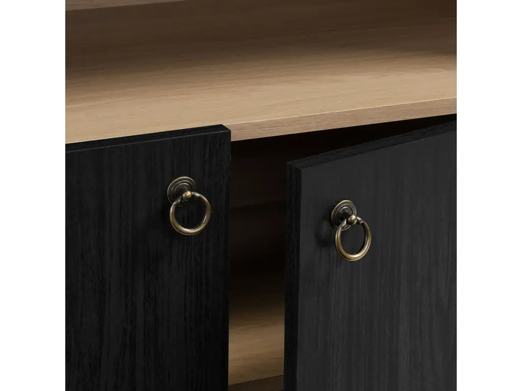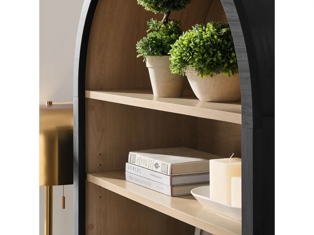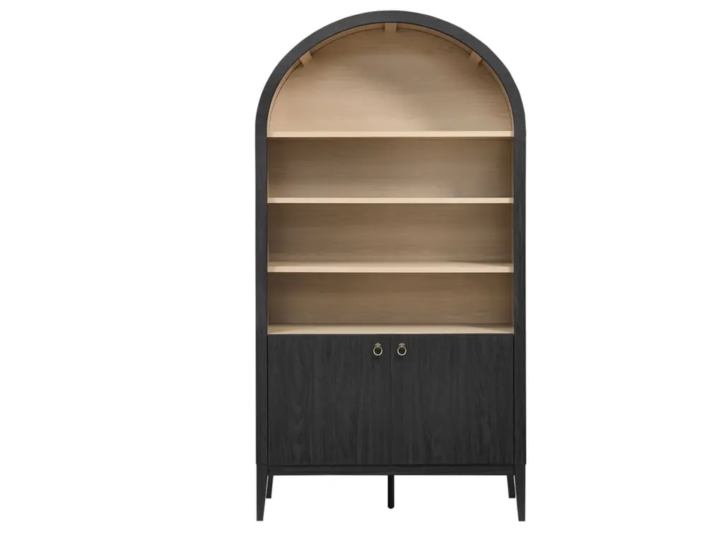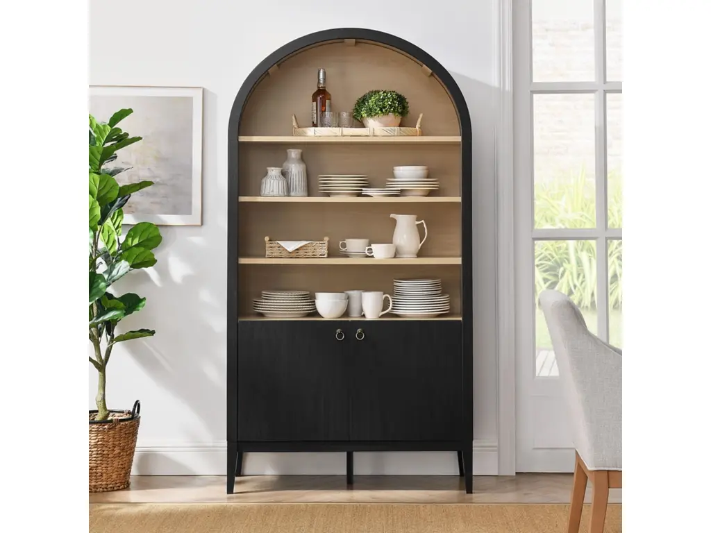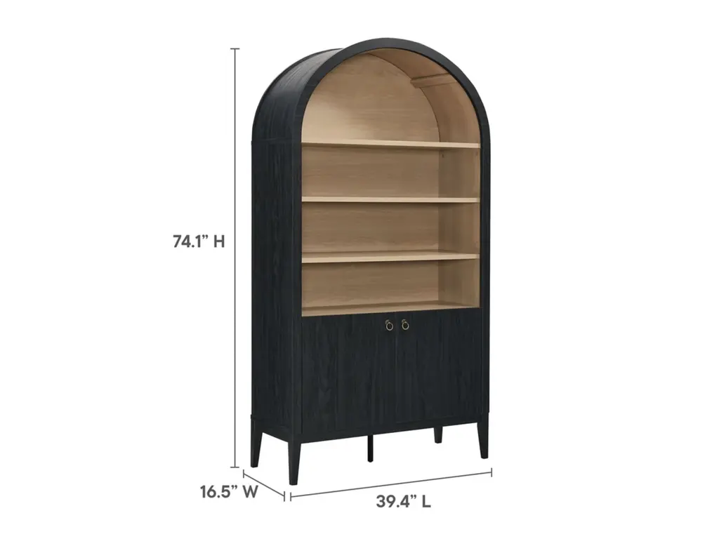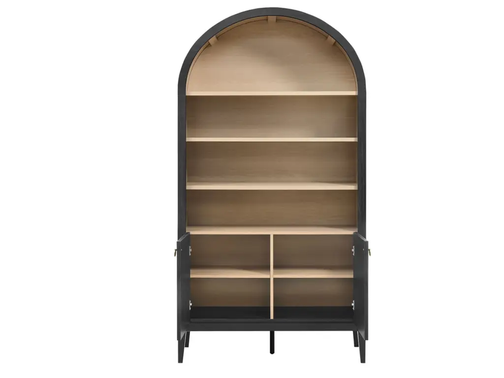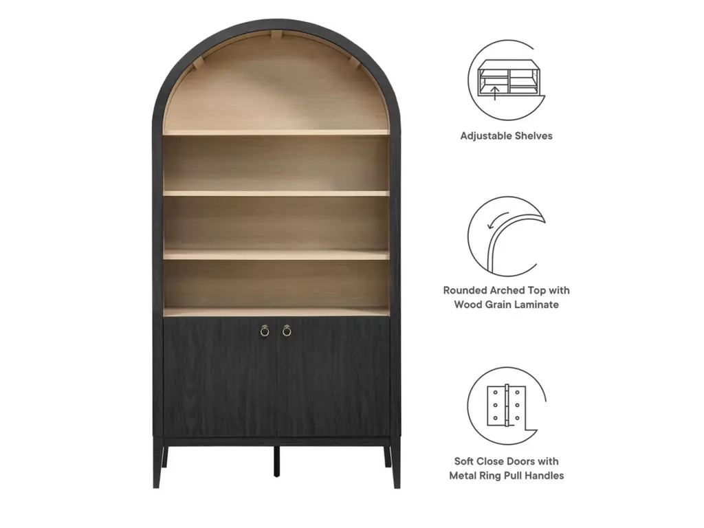 The Nolan Display Cabinet combines functional storage versatility with charming modern farmhouse style. Crafted with a beautiful wood grain laminate, the chic design flaunts subtle edge trimming and an elegantly rounded, arched top shelf. Supported by tapered wood legs, the Nolan tall storage cabinet combines open shelving with concealed storage. The upper section includes two adjustable shelves flanked between two fixed shelves, perfect for displaying decor and books. The lower section is enclosed by two solid doors, which open to reveal two adjustable shelves inside, creating four compartments for additional storage. Complete with soft-close hinges and metal ring pull handles with a brushed gold finish, this wood storage cabinet is as stylish as it is practical. Perfect for your living room, hallway, or dining area, this arched bookcase effortlessly adds an air of sophistication and vintage allure to your home. To protect your flooring, the Nolan Wide Storage Cabinet comes equipped with non-marking foot pads. Assembly required. Weight Capacity of each shelf: 44 lbs.