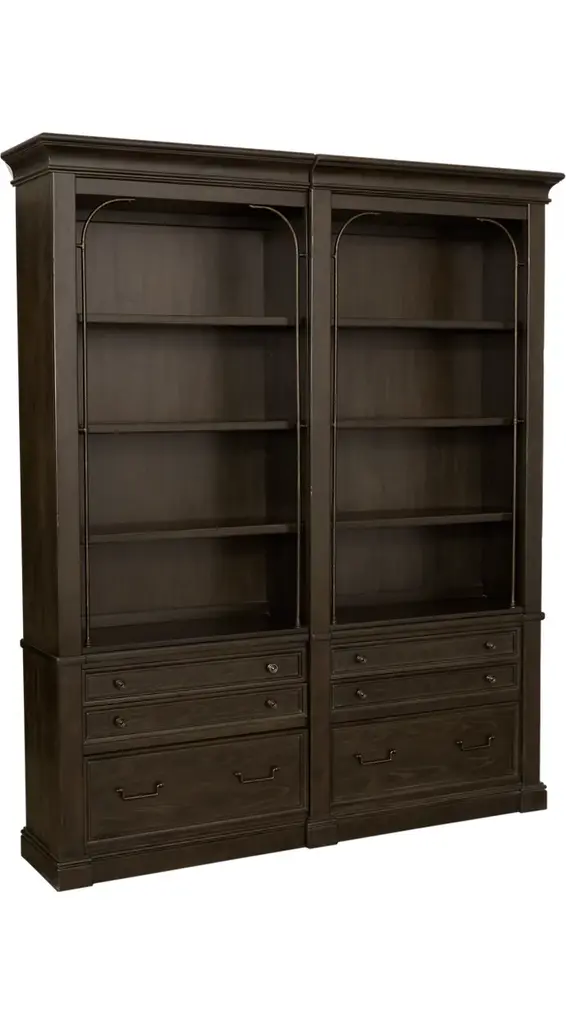 Showcase your books, framed photos and mementos in grand style with our Montgomery bookcase wall. Crafted with hardwood solids and white oak veneers, this bookcase wall features traditional details such as crown molding and wood planked back panels, but with an updated feel that can be seen in its distressed brown finish and knob hardware in a satin brass finish. This bookcase wall includes a bunching bookcase, an outside corner bookcase and an inside corner filler that are available in a variety of configurations to fit your home office or living room space. The bunching bookcase features two drawers and three adjustable wood shelves, while the outside corner bookcase has four adjustable wood shelves and one fixed wood shelf.