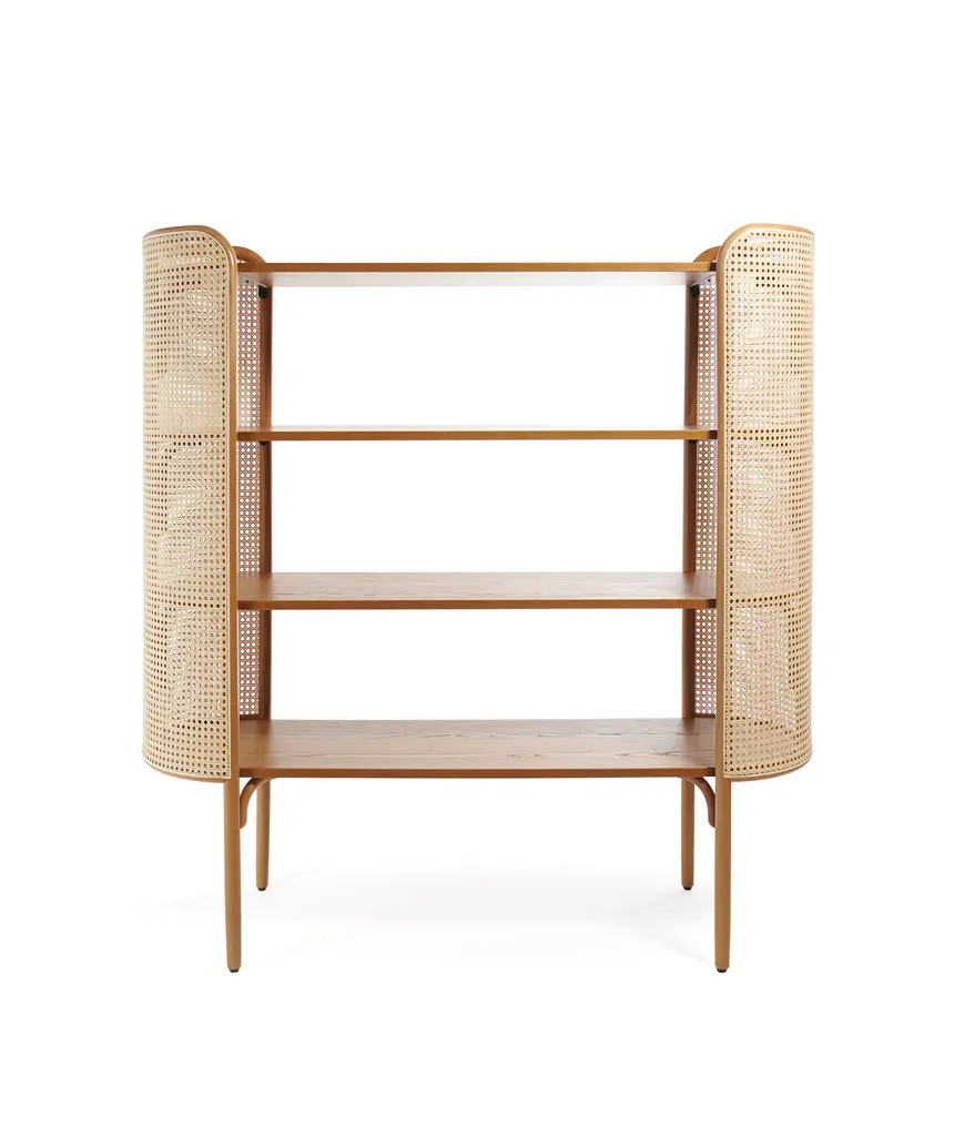 An elegant piece for a living room, dining area, bedroom, or home office, the MOS Bookcase beautifully solves a variety of storage needs. Its steam-bent wood frame is exquisitely crafted using time-tested techniques and both ends are wrapped in woven cane shells that allow interior contents to be dappled with light.