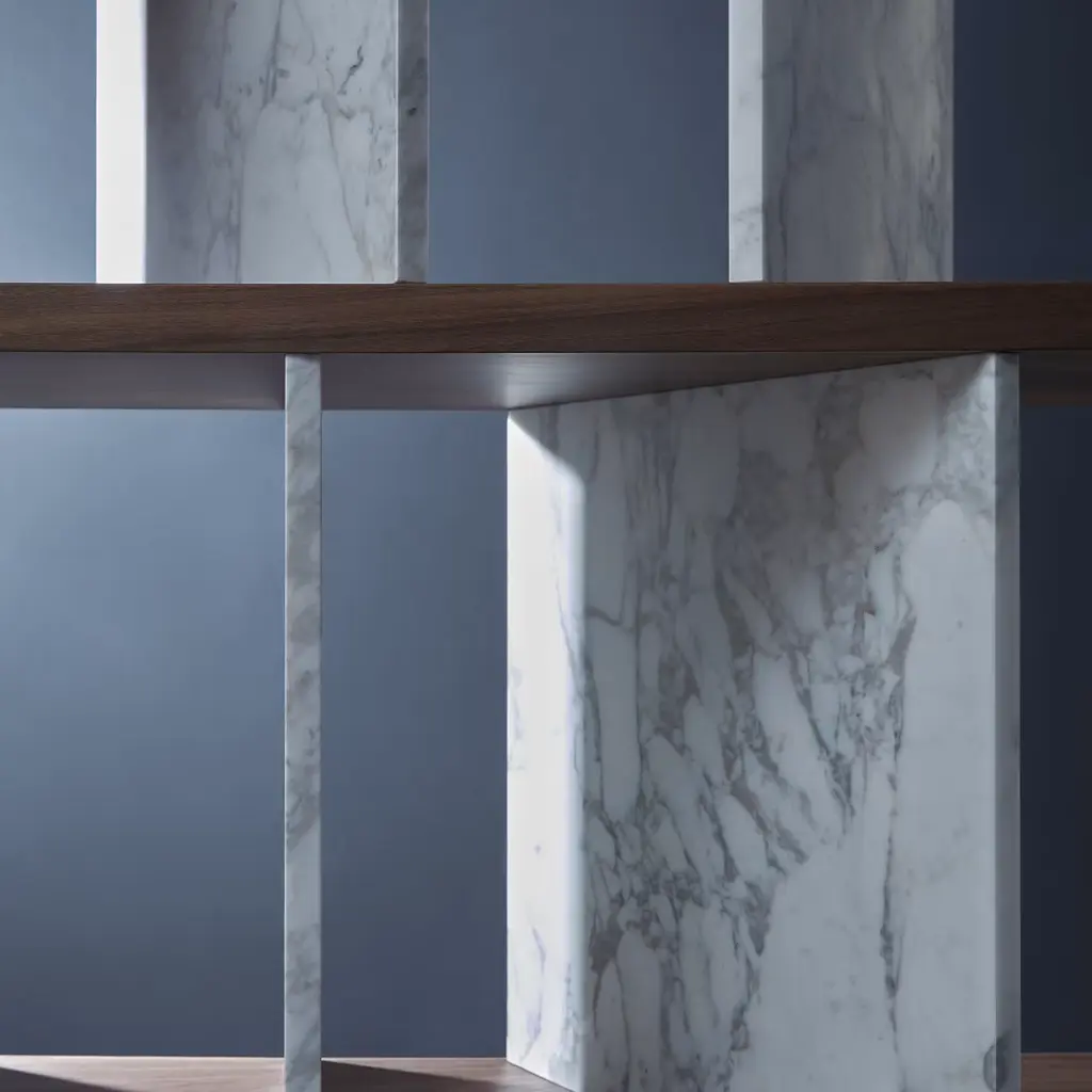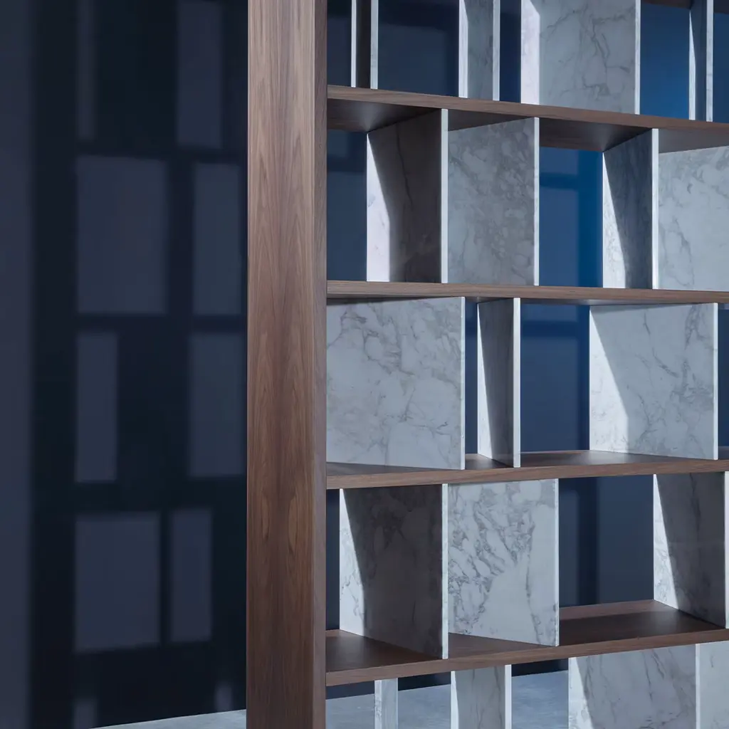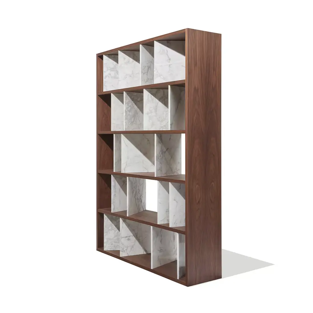 The shape of this bookcase conjures up the ordered volumes and romantic facades of Milan's urban landscape, especially the bustling streets of its famous Moscova district. The shelves of its grid-like silhouette feature unique, slanted dividers that create distinct compartments. This bold design is available in matte, mocha-lacquered ashwood with gray Carnico marble.
