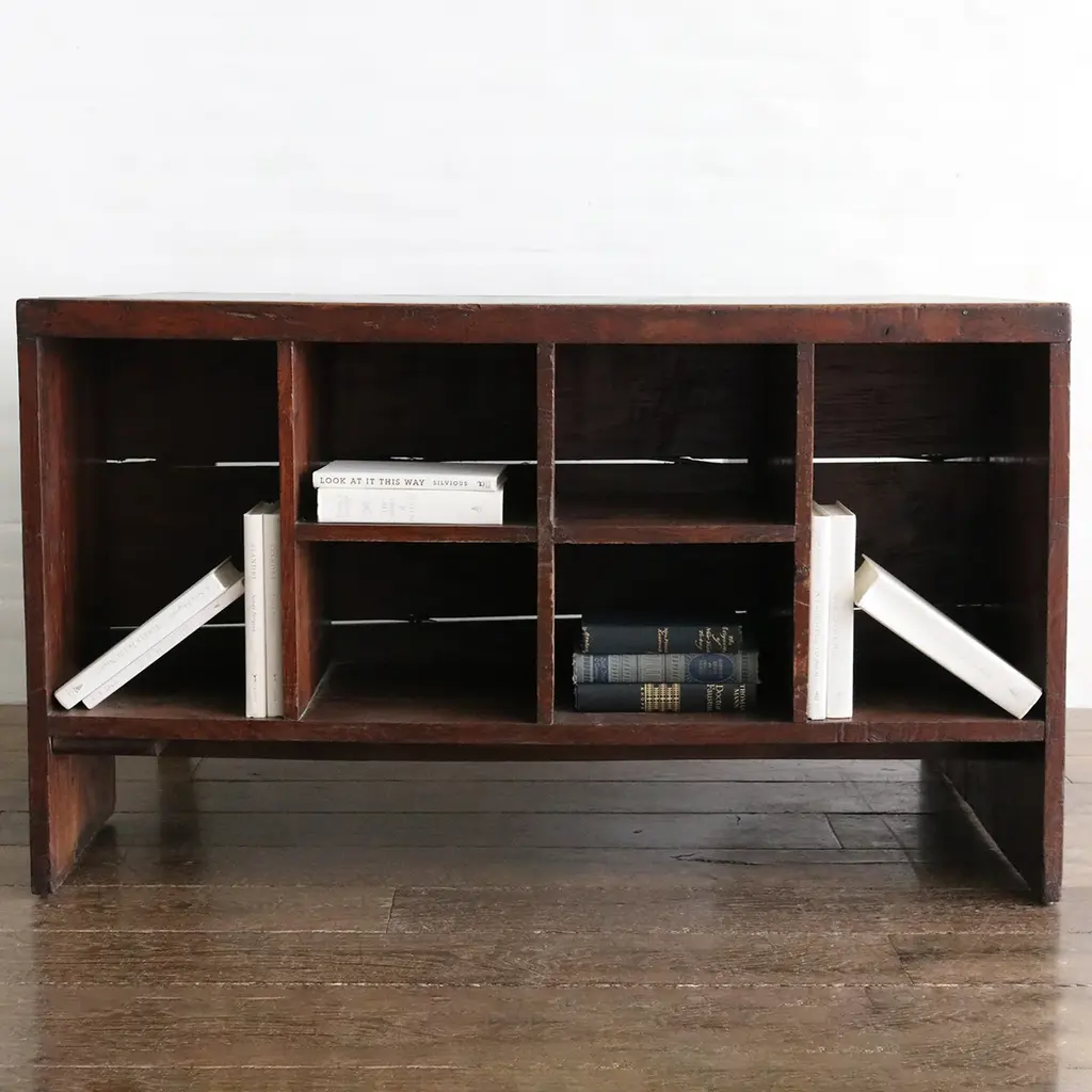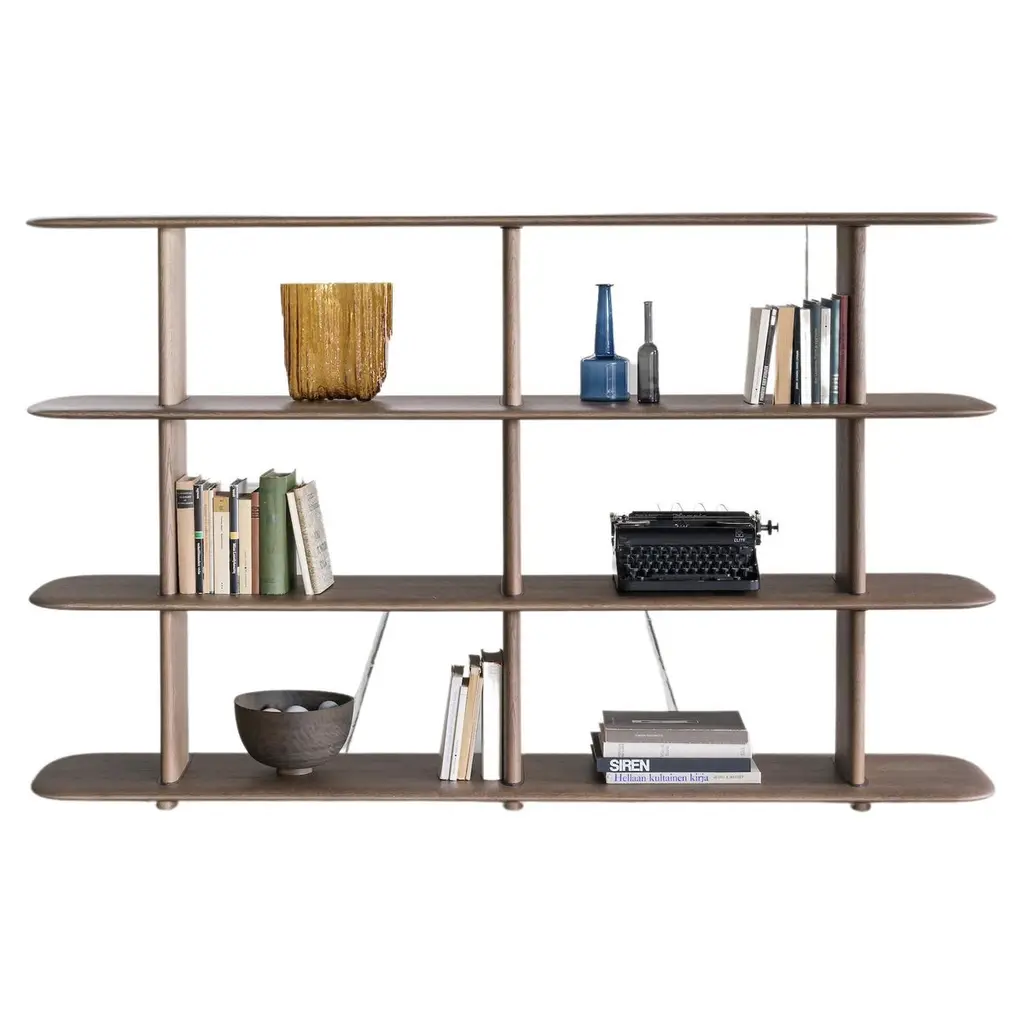 The perfect match to the Wood and Brass Sideboard by designer Michele Bonan, this sublime piece serves both as a console and bookcase thanks to its six open-shelf design. A timeless and versatile design of strong geometric and architectural value, it is handcrafted of black picked durmast wood enriched with a brass base and brass decorative handles, and completed with a petit grant top. Also available in natural durmast upon request to the Concierge.