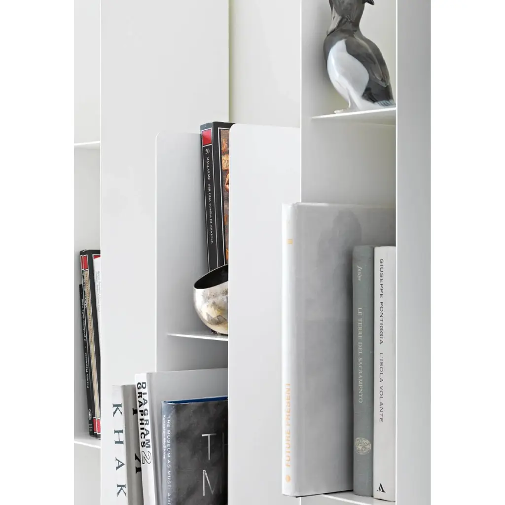 The Multifunctional Metal Bookcase by Lema Koala is decorative and functional elements at the same time, made of lacquered metal, with a rigorous and essential spirit. A container with a plastic expressiveness that is defined in the light almost graphic structure, to be positioned vertically or horizontally, with open compartments designed to organize books, and magazines and to accommodate small objects to be left on display. Koala is conceived as a design object in itself to exploit a small space or freely combining several elements to create even large compositions that give movement to the walls. The quality of the lacquering and details such as the rounded terminal edges are a symbol of the brand's attention to design.
