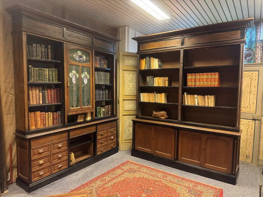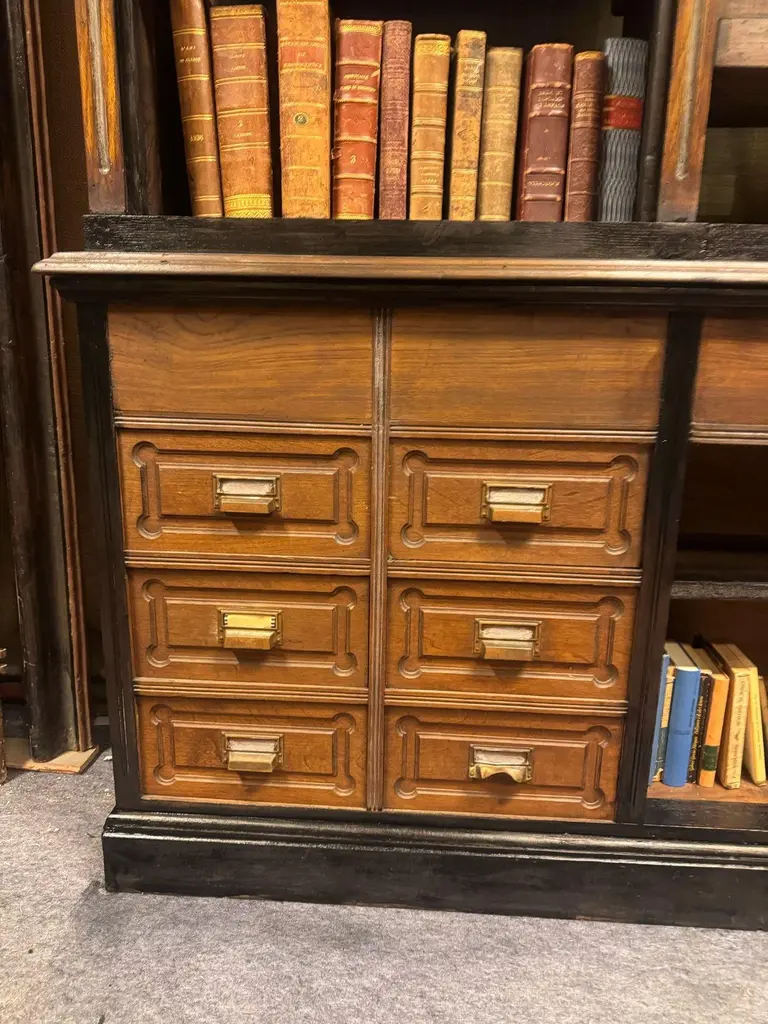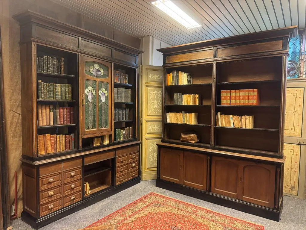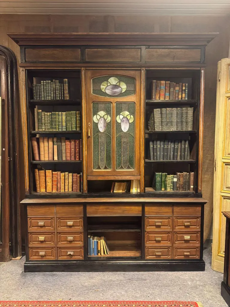 No. 3 art Deco bookcases, Similar bookcases but not identical, come from the same house, they are built in solid oak, decorated with black profiles.They have a shelf with shelves and one bookcase has a colored glass door, Two have a base with drawers, one with sliding doors.Built in the year 1920, for a prestigious notary's office, located in Italy.Maximum measurements each cm w 207 (+ 5 cm hat protrusion on each side) x H 260 x D 40.price for each.