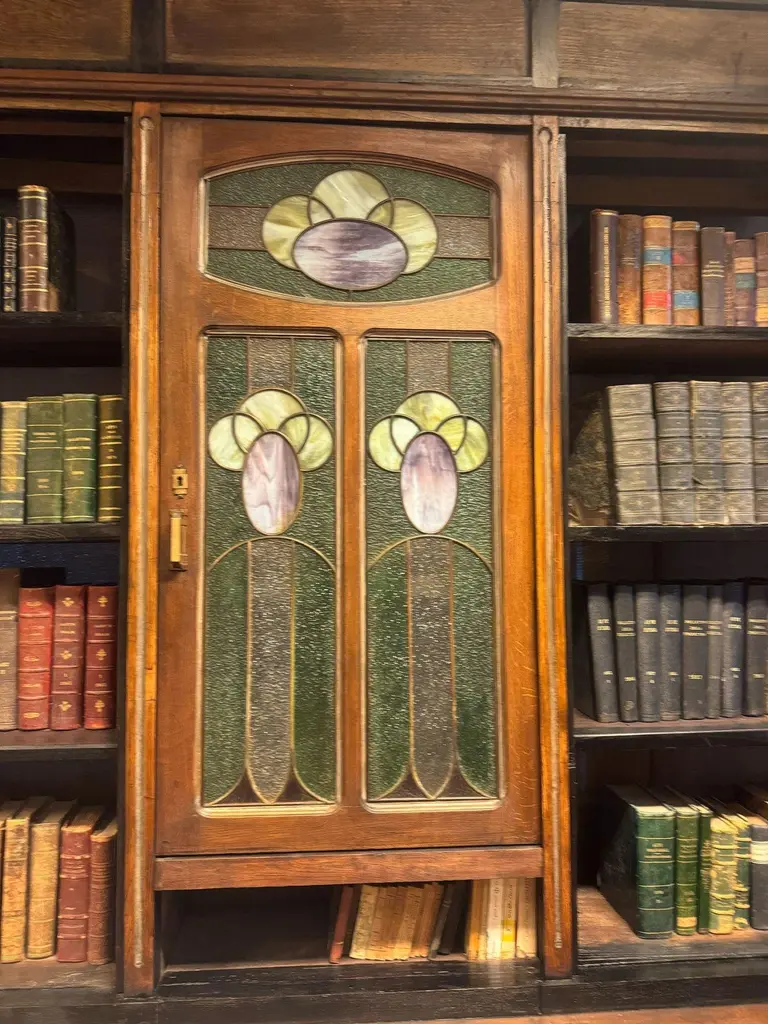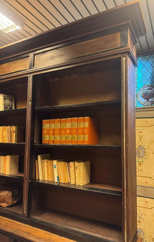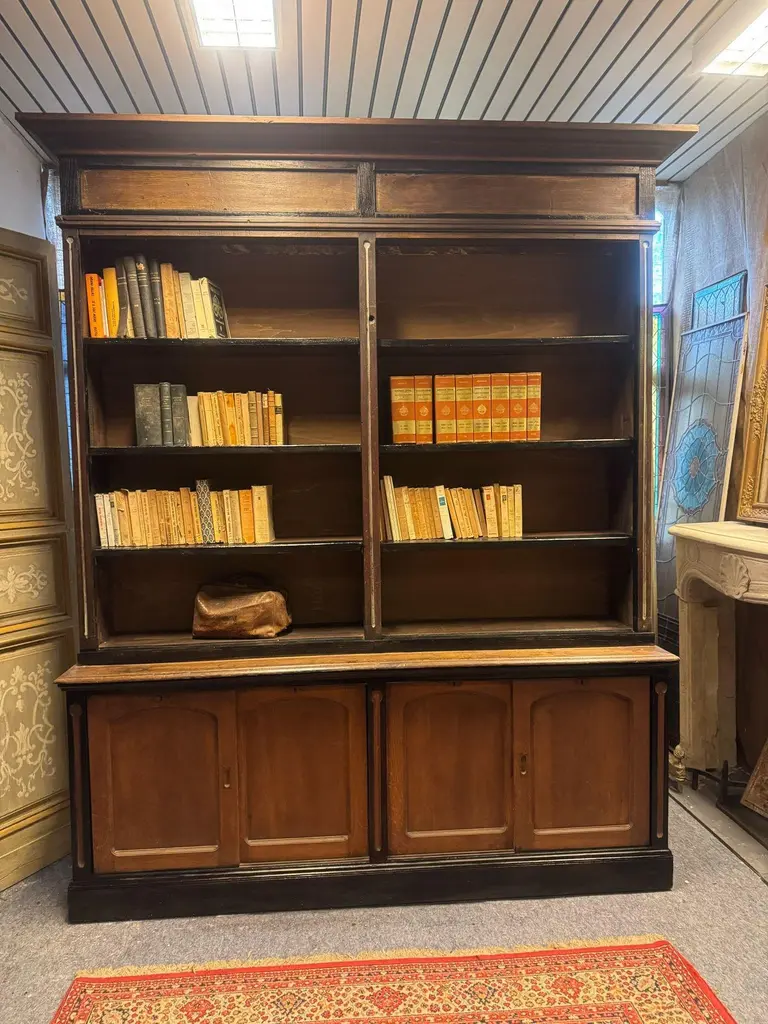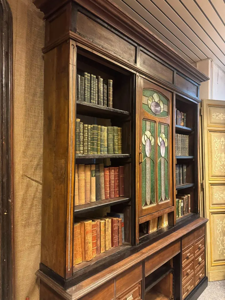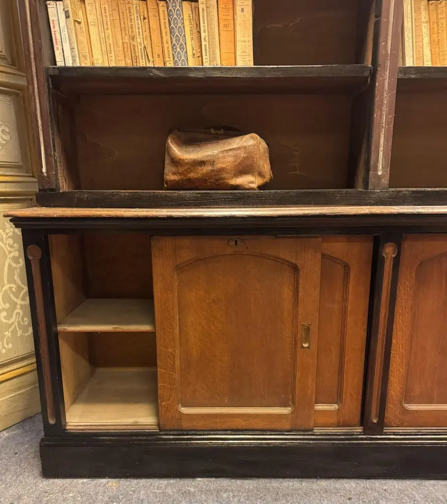 No. 3 art Deco bookcases, Similar bookcases but not identical, come from the same house, they are built in solid oak, decorated with black profiles.They have a shelf with shelves and one bookcase has a colored glass door, Two have a base with drawers, one with sliding doors.Built in the year 1920, for a prestigious notary's office, located in Italy.Maximum measurements each cm w 207 (+ 5 cm hat protrusion on each side) x H 260 x D 40.price for each.