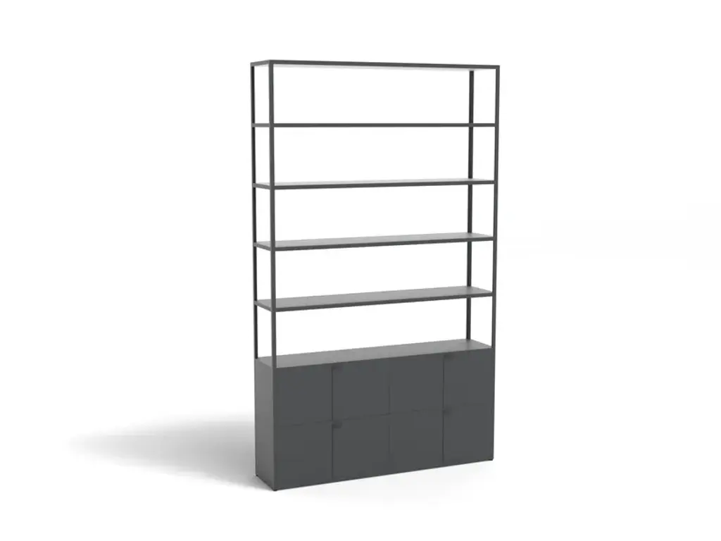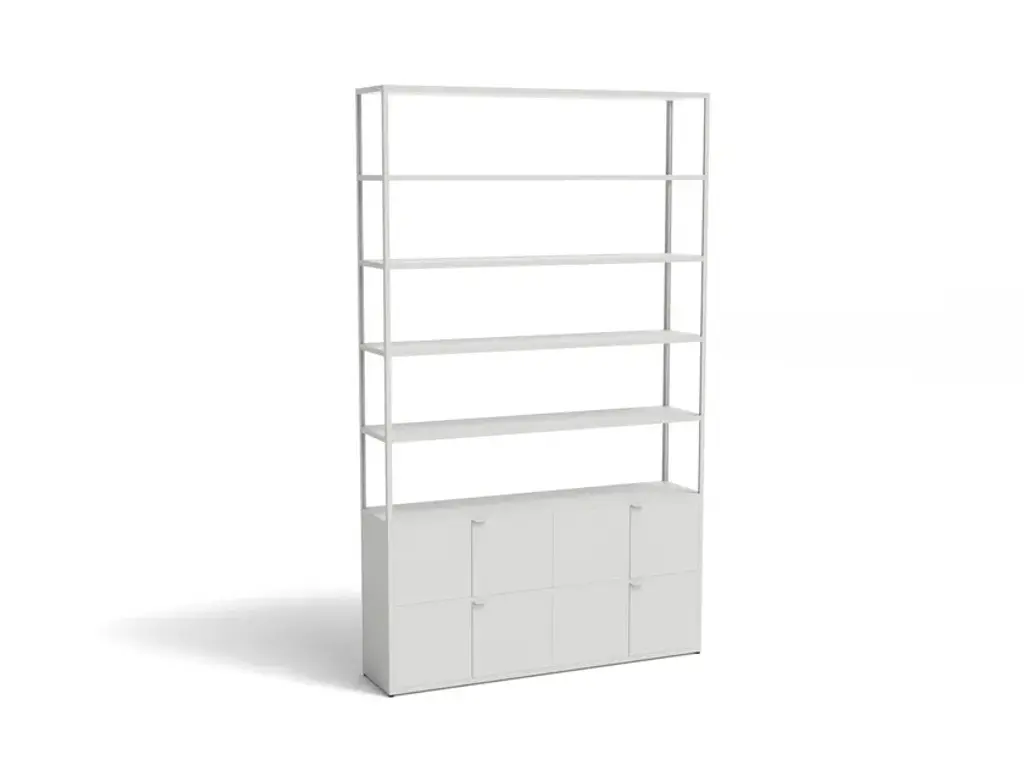 New Order Combination 702 comprises a flexible combination of open shelves and closed storage space, with a modular system providing a functional and aesthetic storage solution. The integrated sliding doors are made of powder coated steel and can be specified to match the colour of the grid to create a seamless, uniform appearance or customised with contrasting colours. The system can be modified with panels, doors, trays and drawers to customize the appearance and functionality, creating infinite combinations and applications.
