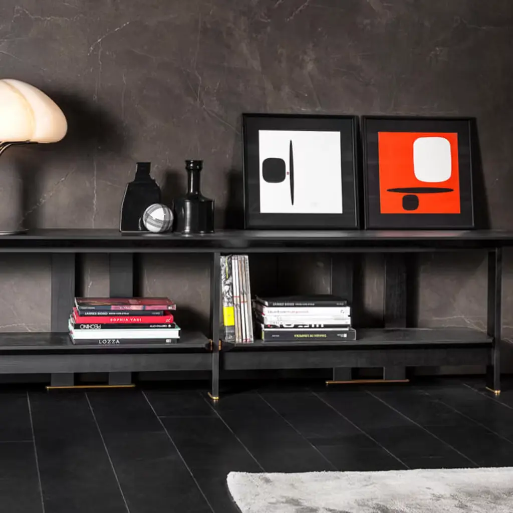 Clean lines intensified by an intense monochromatic look allow this sleek bookcase to effortlessly fit in modern professional and residential interiors, alike. Crafted of larch stained and finished in brushed black, it provides a wide top and two juxtaposed shelves underneath, accented with gold-finished metal fittings and with vertical wooden boards for increased steadiness and visual appeal. A high variant is available upon request to the Concierge.
