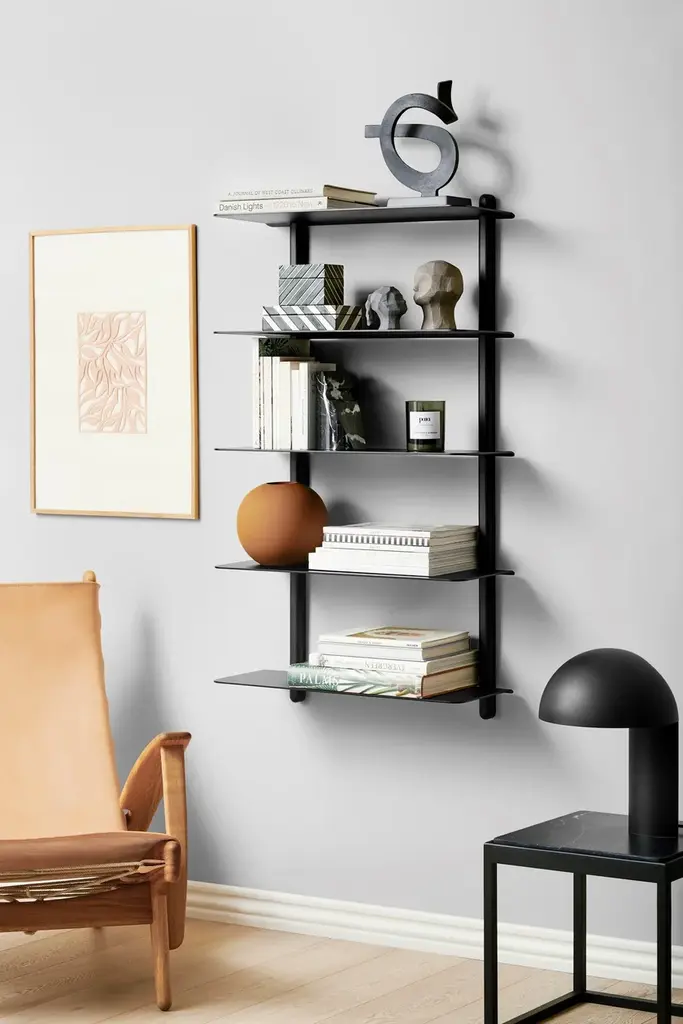 Nivo Large is a minimalistic wall shelf designed by Böttcher & Kayser for Gejst. With no unnecessary details and only clean lines Nivo hangs lightly and elegantly on the wall. Every component has been carefully thought out both in terms of design, form and function. There are no visible screws and the shelves are smoothly plugged in to the wooden poles, that have slits made exactly to fit. Nivo shelf Large has the perfect size to exhibit the bigger things. The shelf is beautiful in every room of the home. Nivo shelf large is available in to different sizes: Nivo Large A, Nivo Large D, Nivo Large E, Nivo Large F, Nivo Large G, Nivo Large H. Both sizes are available in black and white.