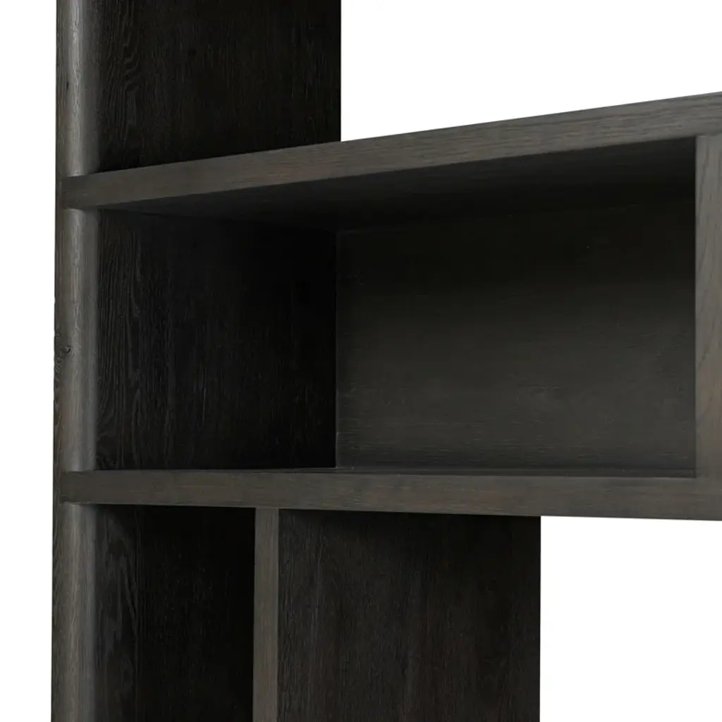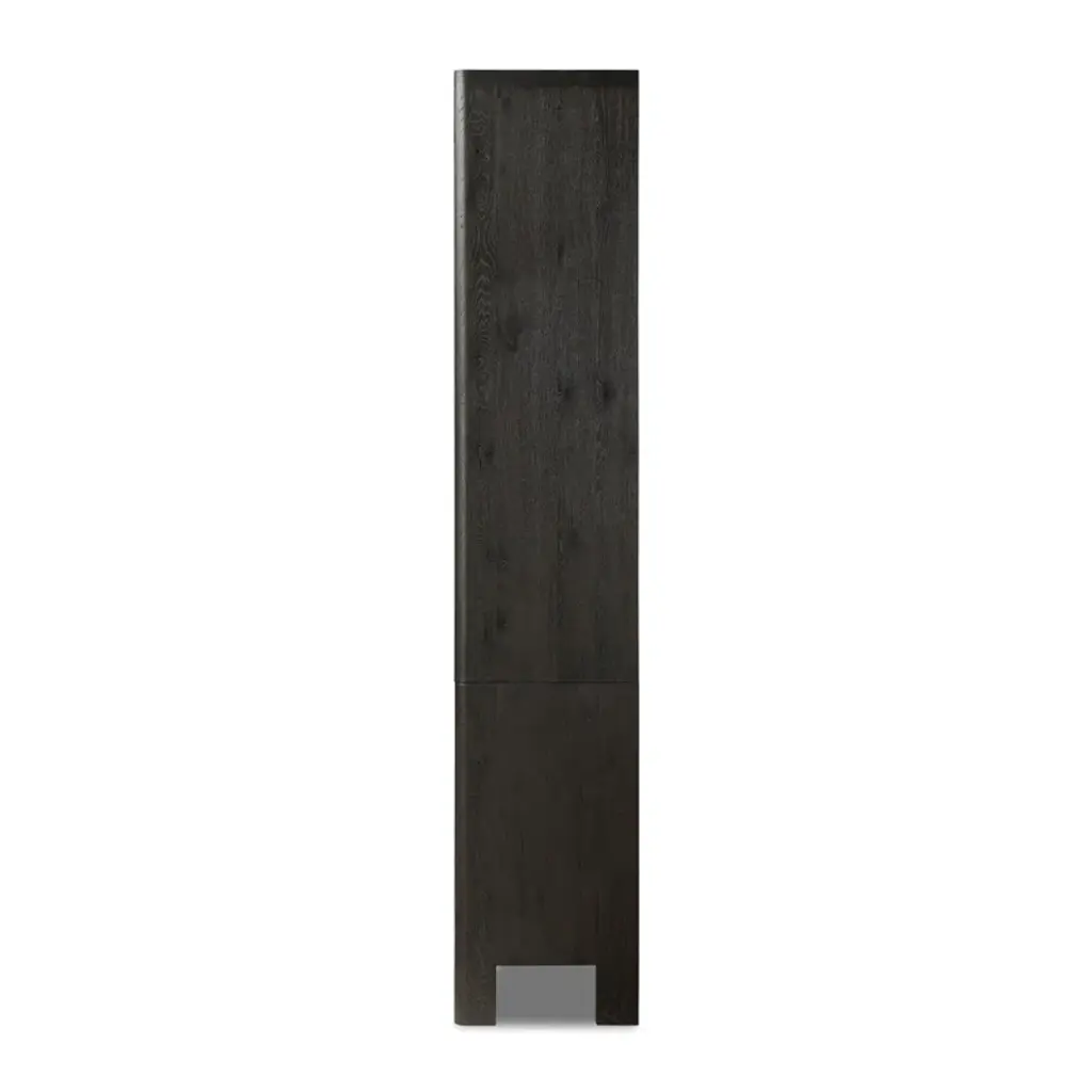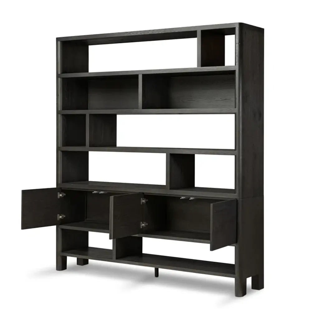 Made from solid oak and oak veneer and finished in a smoked black, a wide bookcase offers open and concealed shelving, for both storage and display. Push-latch doors make for a clean, seamless look, while subtly rounded corners soften up the whole look.
