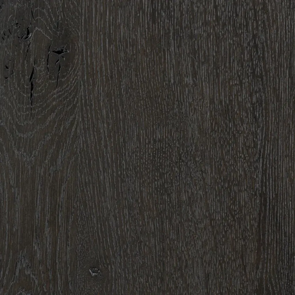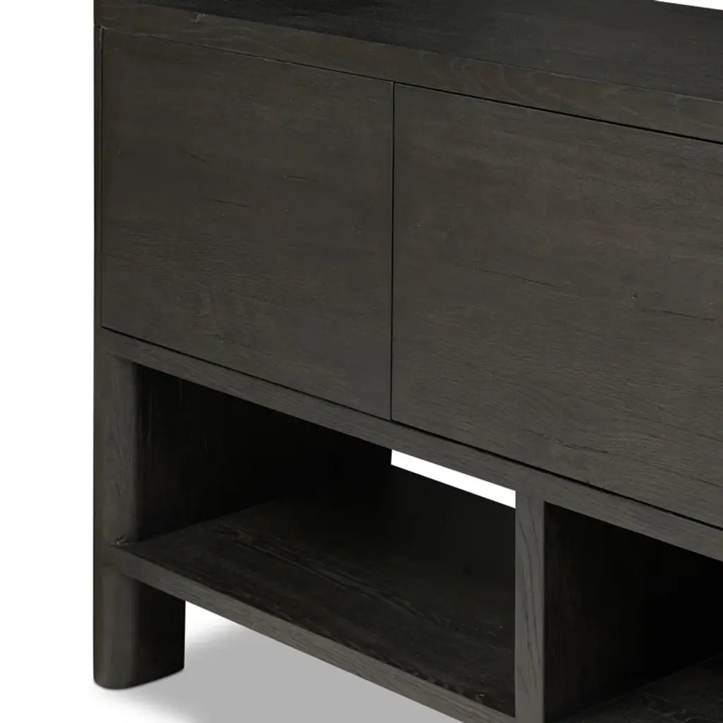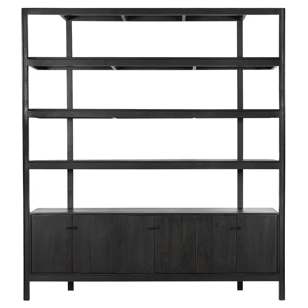 Made from solid oak and oak veneer and finished in a smoked black, a wide bookcase offers open and concealed shelving, for both storage and display. Push-latch doors make for a clean, seamless look, while subtly rounded corners soften up the whole look.