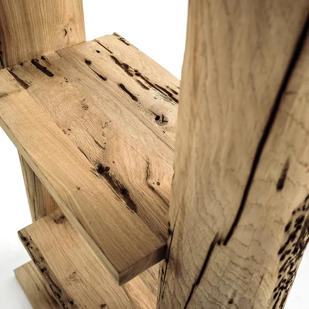 Fashioned of the same wood used to craft the wooden poles dotting the Venetian lagoon, this bookcase results dynamic both to eyes and touch. Its shelves decrease in size progressively towards the base, a captivating choice that further invites one to focus on the peculiarity of the structure's natural holes and fissures. Treated with wax, the piece also comes in a small version.
