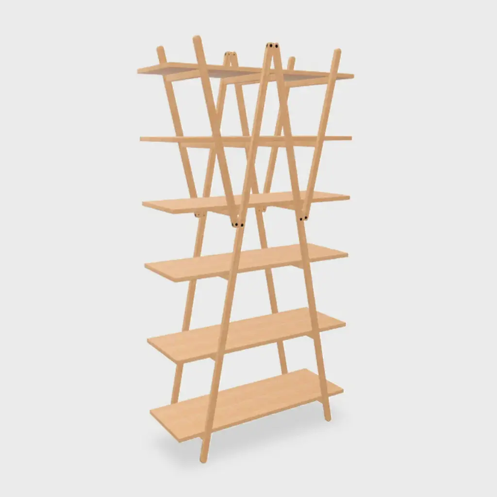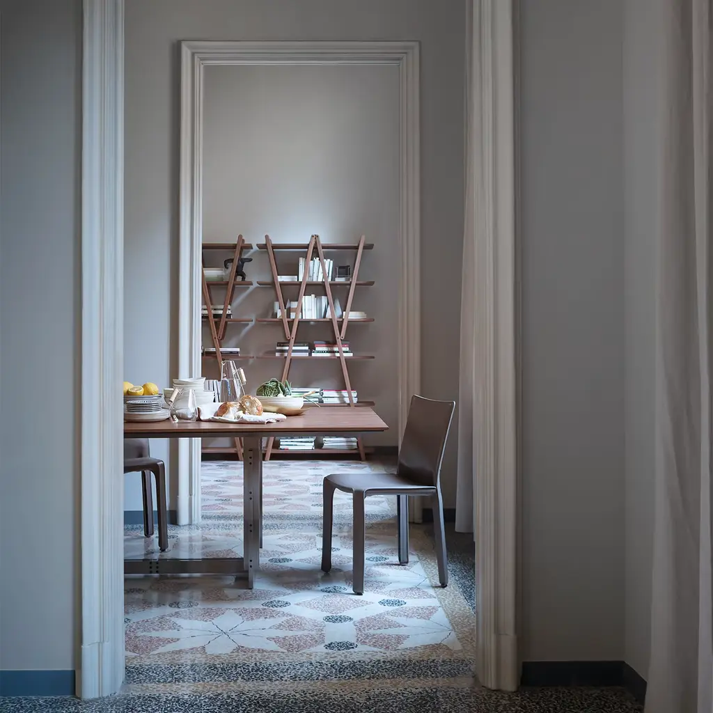 Designed by Vico Magistretti, this bookcase with its simple, clean-cut lines was the outcome of a detailed analysis of the classic model featuring side supports and shelves. The diagonal bracing struts become the support structure, and house the shelves, eliminating the need for side supports. Putting the focus on the hinges and the six shelves, the structure, which can be folded away, can also be used as a room-divider.