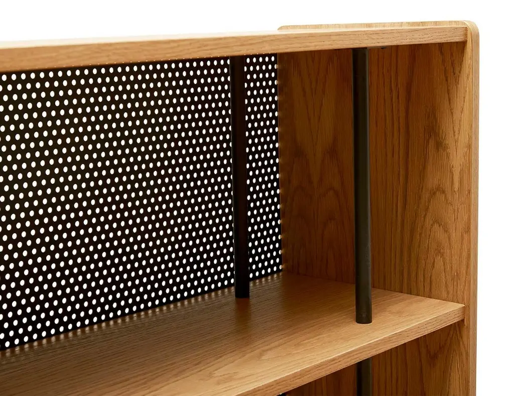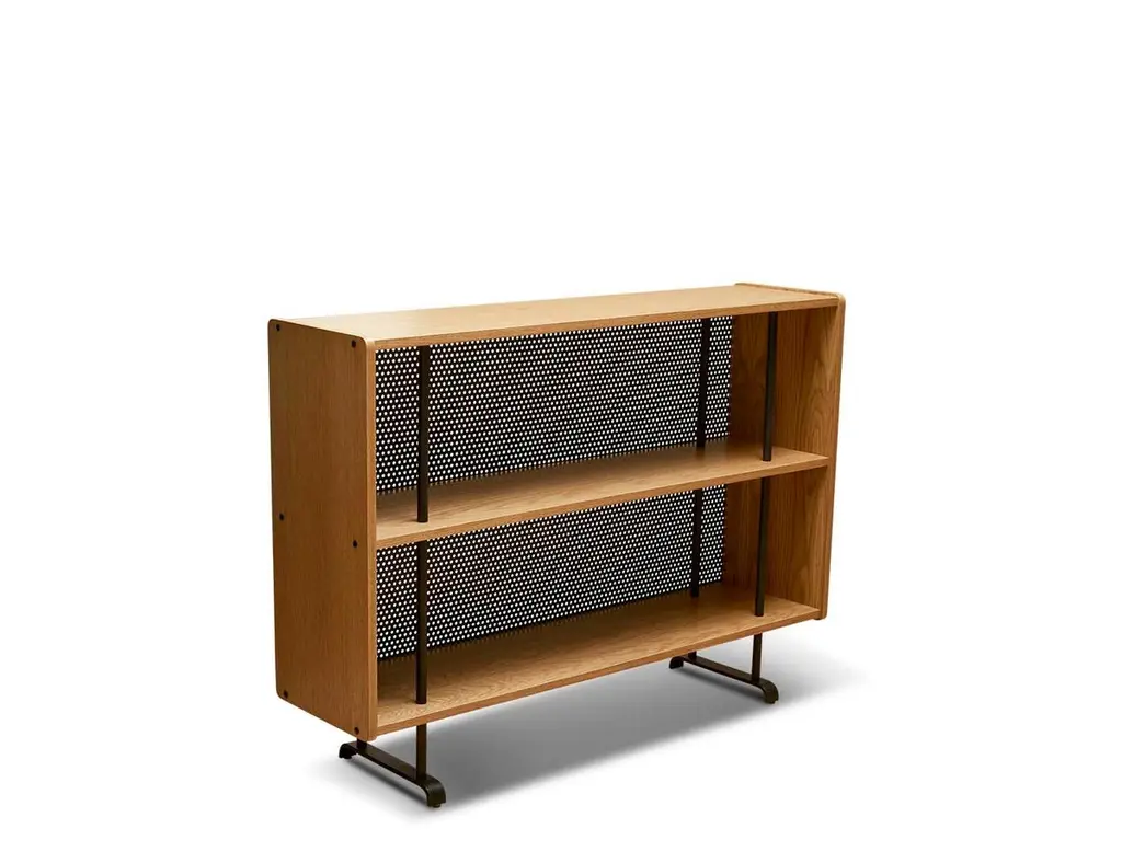 The Maker's bookcase is a freestanding bookcase made of American walnut or white oak. The frame rests on a blackened steel base and features two shelves and a perforated steel detail on the back. The Lawson-Fenning Collection is designed and handmade in Los Angeles, California. Reach out to discover what options are currently in stock.