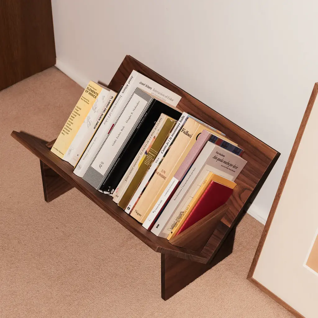 The Bookcase is a compact piece crafted from natural birch or walnut wood. Its minimalist structure features a simple rectangular frame that accommodates everything from small paperbacks to large art books. It can be placed on the floor or on a surface. The flat-pack design ensures easy assembly and transportation, while the wood's natural finish enhances its beauty over time.