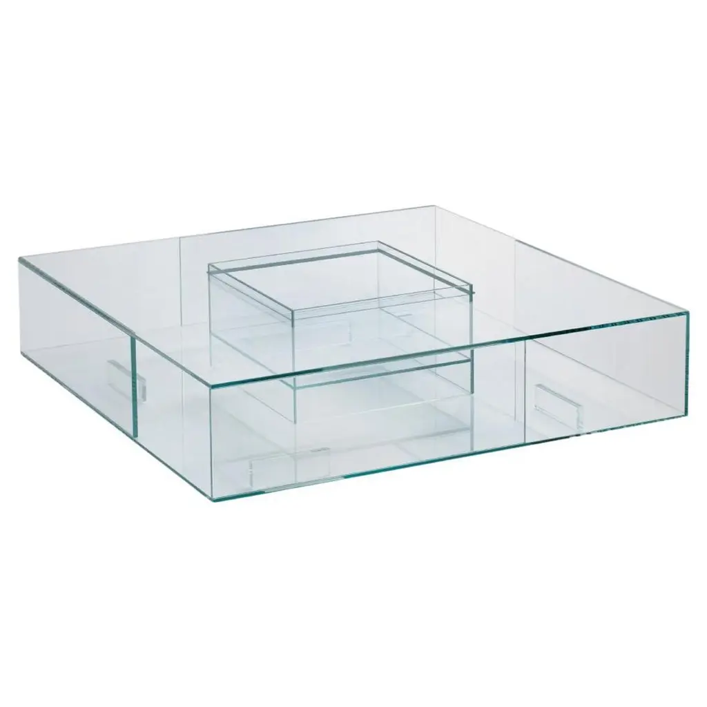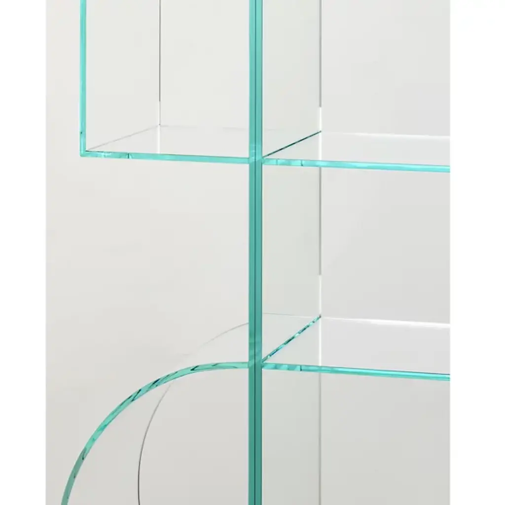 The Ollie Bookcase from Glas Italia lends abstract refinement to its surroundings. A crystalline construction of clear glass, it was designed by Yabu Pushelberg, featuring a removable base with a clear mirror, with swooping, slender shelves featuring joined curving and blocky accents that balance out above, offering equal measures of storage and display space. The mirrored back panel adds depth and reflection, creating a welcome and geometric appeal to its surroundings.
