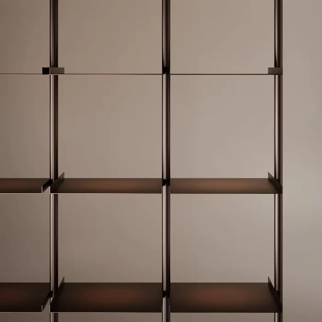 The Open Bookcase is a system characterized by formal precision, created to divide and organize spaces. Its geometric design highlights the clean lines of its blended burnished copper structure, which consists of height-adjustable vertical rods and shelves, softened by meticulous hand finishing. This system expands the possibilities for composition, enabling various modular configurations.