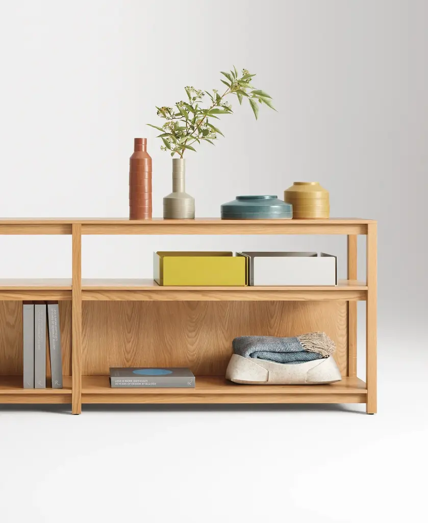 The trick is there is no trick. What you see is all you need. Open Plan is about functional space that celebrates a single material and elevates your materials - reading and otherwise. Back it up against a sofa, use along a wall or float it.