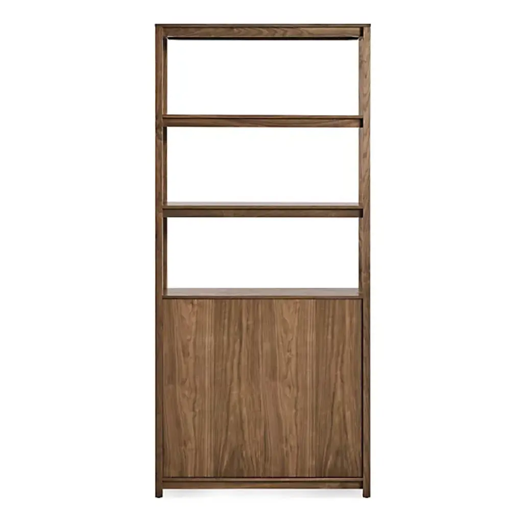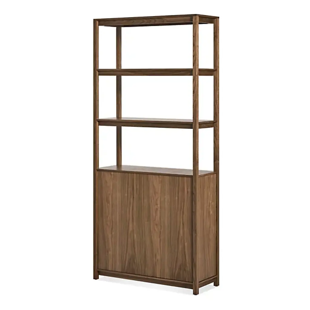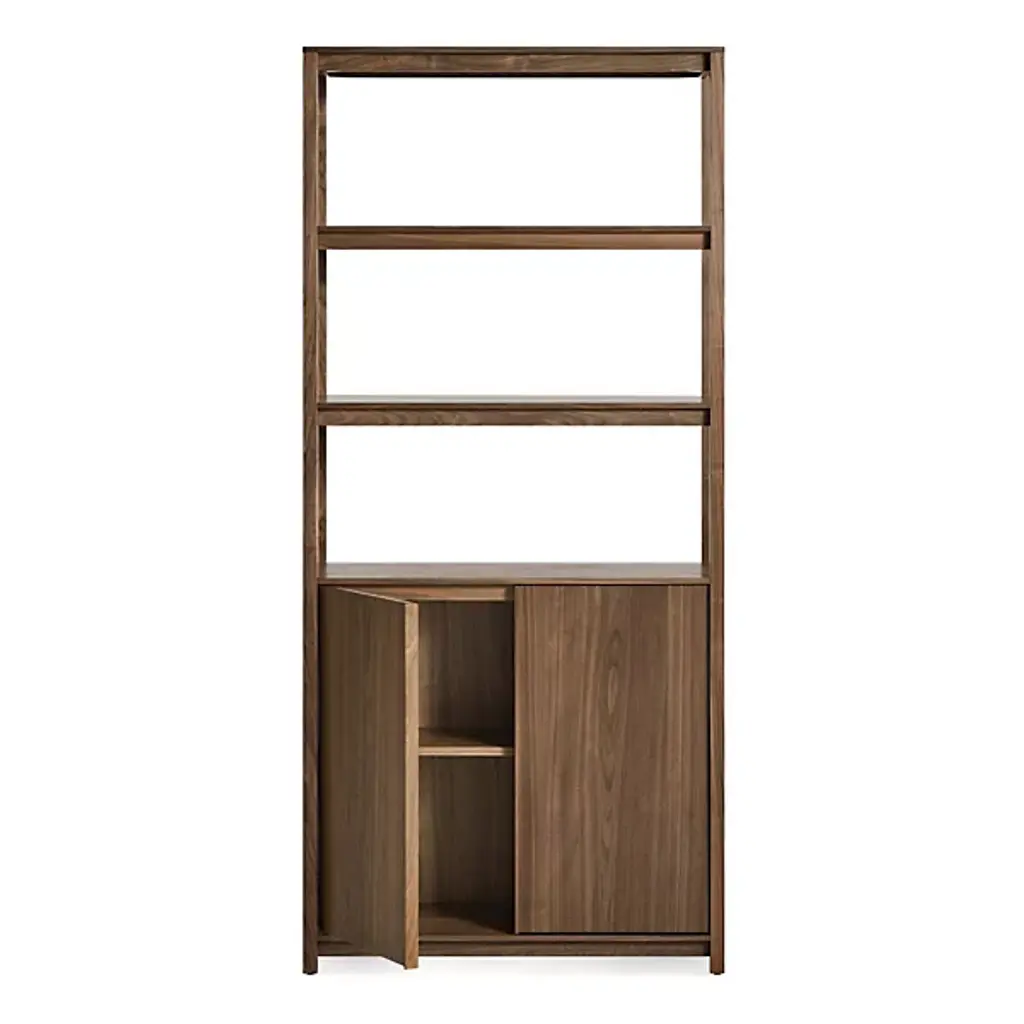 Enhance inside storage options with the Open Plan Tall Bookcase with Storage from Blu Dot. A tall, contemporary construction of smooth wood that has been BIFMA tested for strength and sturdiness, it ascends from an airy platform with four short legs, steadying three layers of open shelving atop a rectangular housing with soft-closing doors fronting inner shelving. The rich wood juxtaposes a rustic sensibility and incorporates intricate details into the smooth design, and the open shelves allow accessory storage and display, while the closable cabinet doors are ideal for concealing clutter.