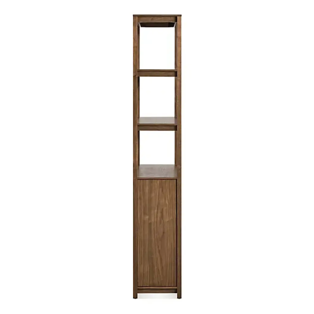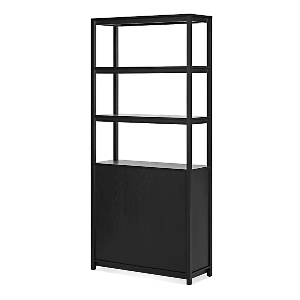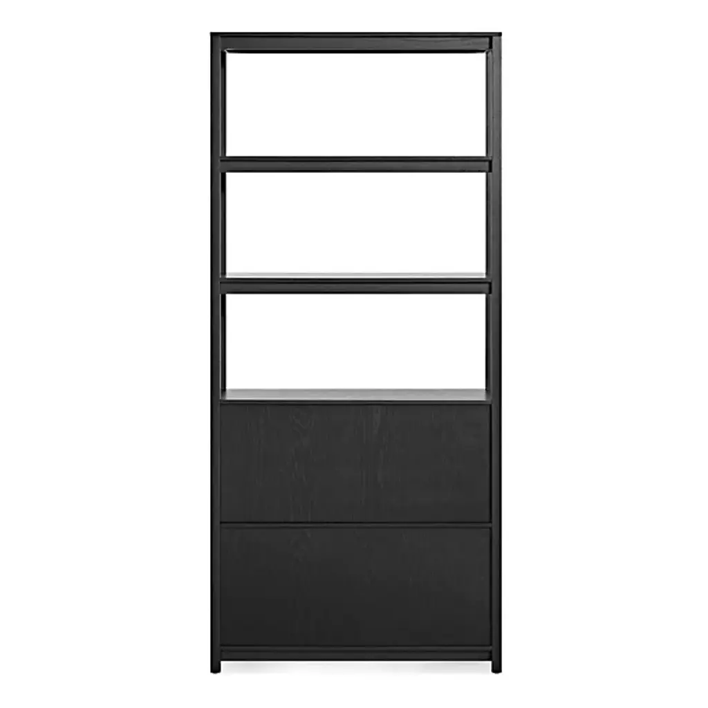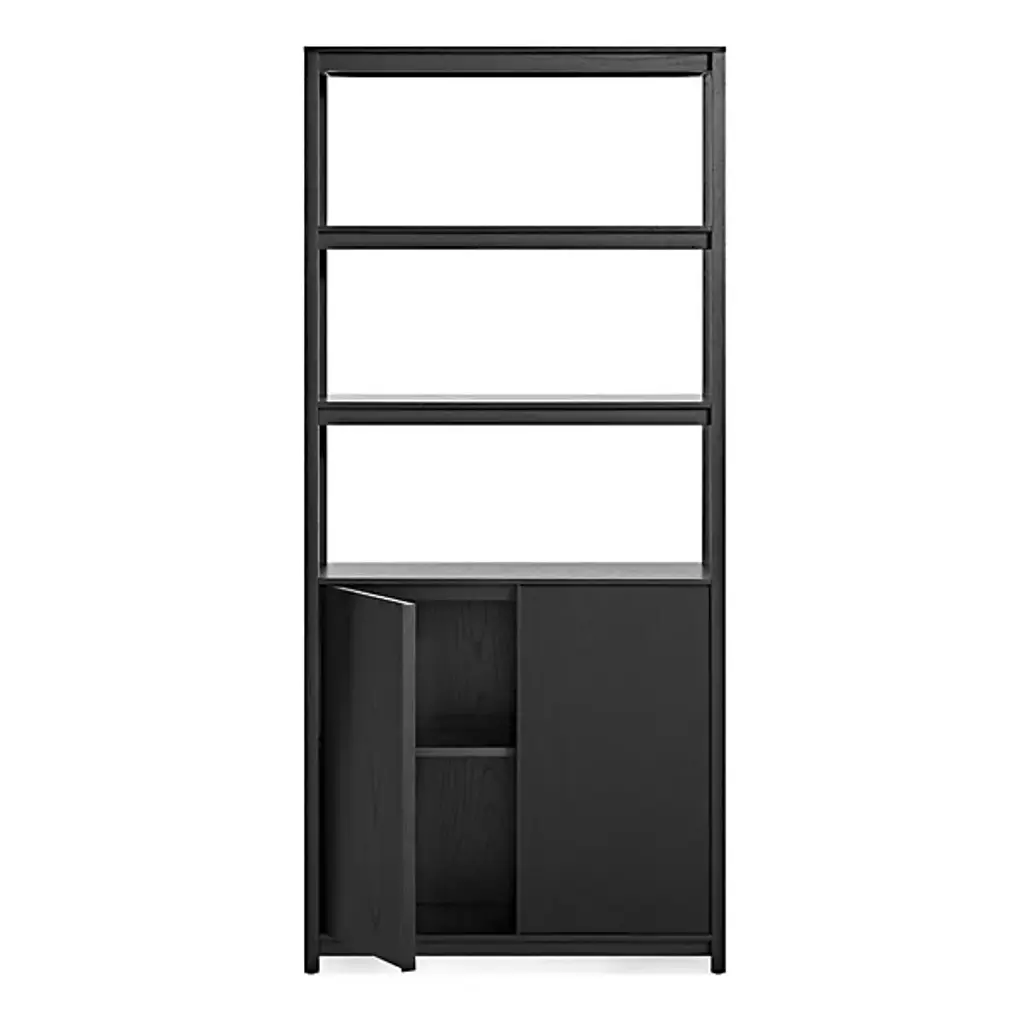 Enhance inside storage options with the Open Plan Tall Bookcase with Storage from Blu Dot. A tall, contemporary construction of smooth wood that has been BIFMA tested for strength and sturdiness, it ascends from an airy platform with four short legs, steadying three layers of open shelving atop a rectangular housing with soft-closing doors fronting inner shelving. The rich wood juxtaposes a rustic sensibility and incorporates intricate details into the smooth design, and the open shelves allow accessory storage and display, while the closable cabinet doors are ideal for concealing clutter.