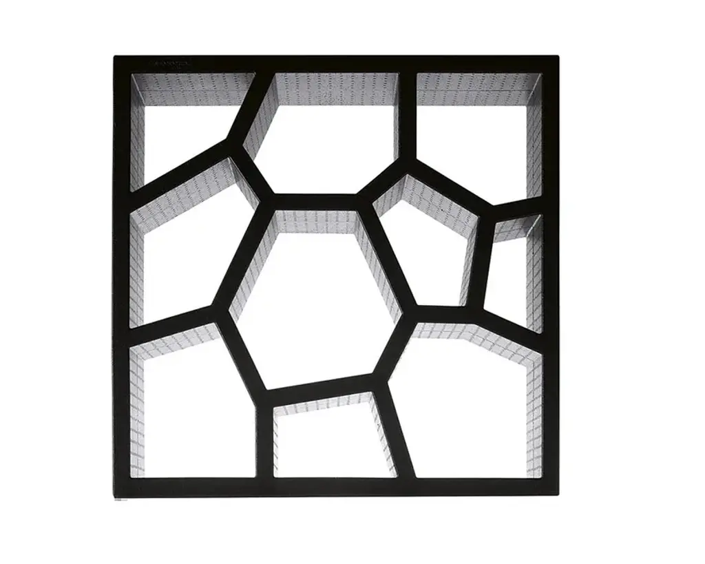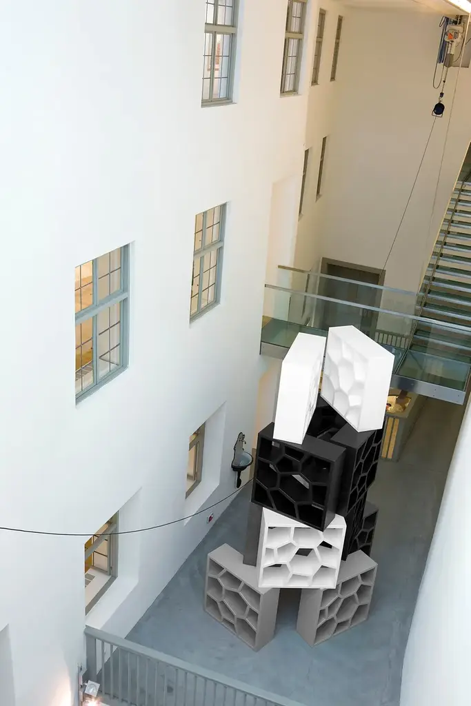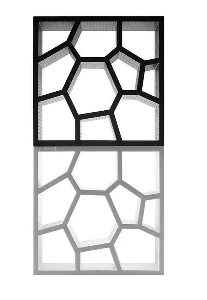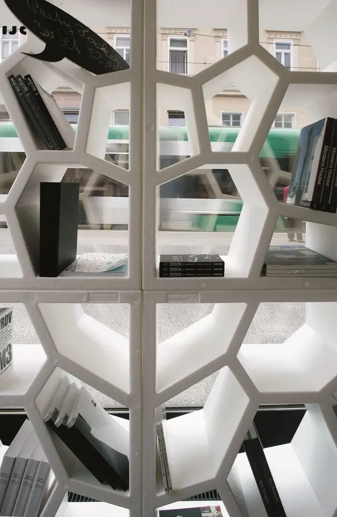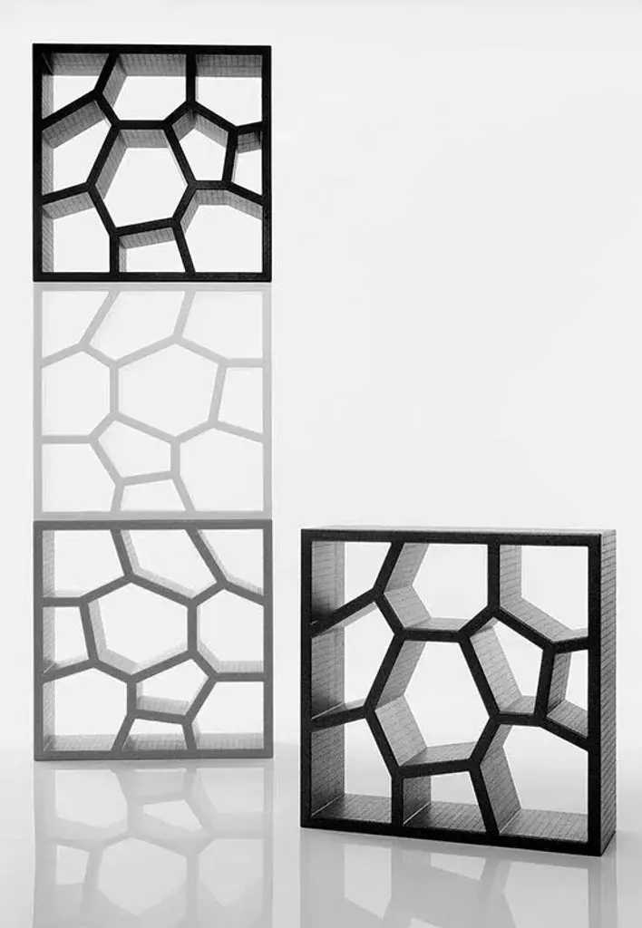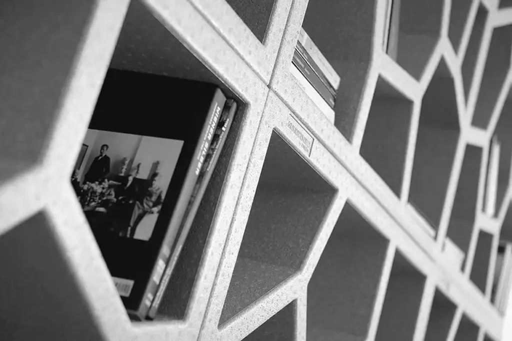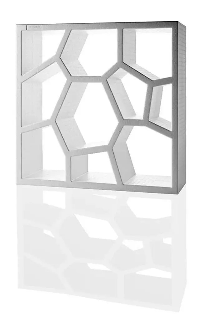 Flexible and light bookshelf or display cabinet in recycable expanded polypropylene, Opus Incertum can be a multi-functional dividing wall if put one close or upon the other. 100% recyclable materials. MATERIALS AND FINISHES Expanded polypropylene. Carryng capacity: 50 Kg (1 Opus); 25 Kg (2 Opus stacked)