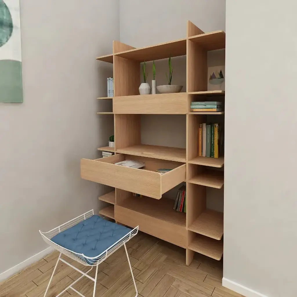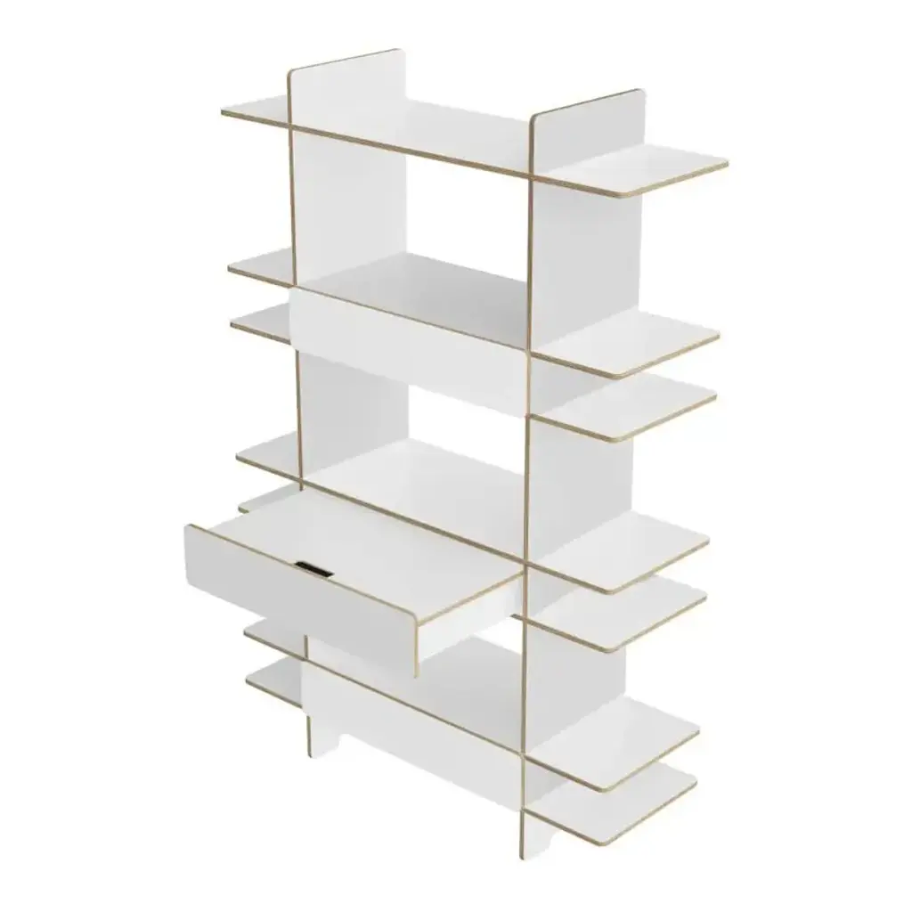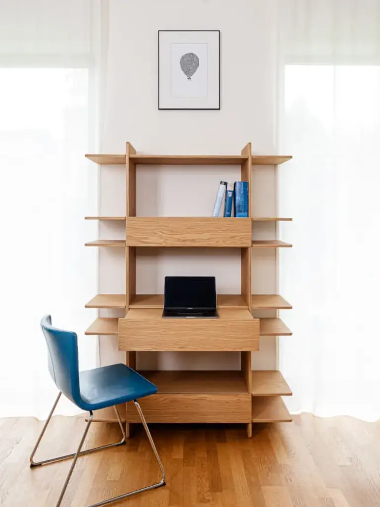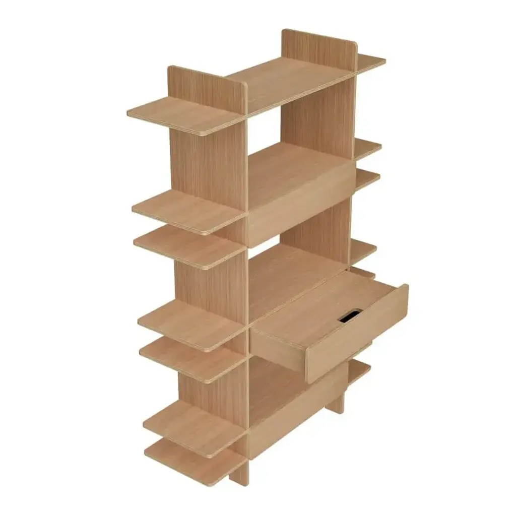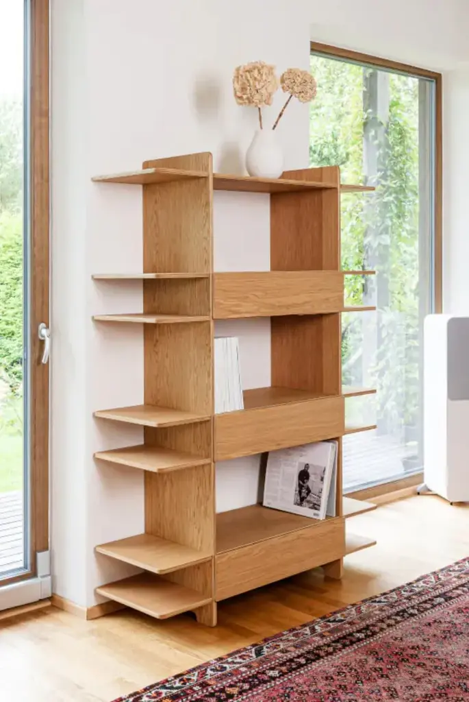 Our Pagoda shelf is like a furniture version of the famous Japanese house. It looks as if it is spreading its wings to rise to new heights. And that is exactly what it is doing – taking the standard of what a stunning shelf should look like to a new height.With plenty of shelf space and a unique design, it will be a crown jewel in any room. The heights of the shelf spaces are 14 and 34 cm.Soft-closing fully opening hidden drawer rails open three spacious drawers with a width of 66 cm, depth of 32.5 cm, height of 10.5 cm. There is also a work surface on top of the middle drawer, which can be used as a pull-out desk for the home office – height 78 cm. If desired, the removable work surface can also be used as a computer stand outside the shelf – for example, while sitting on the sofa, etc.Made of Koskisen 13 mm white durable high-pressure laminate (HPL) plywood and 16 mm oak veneered plywood, oil-waxed.