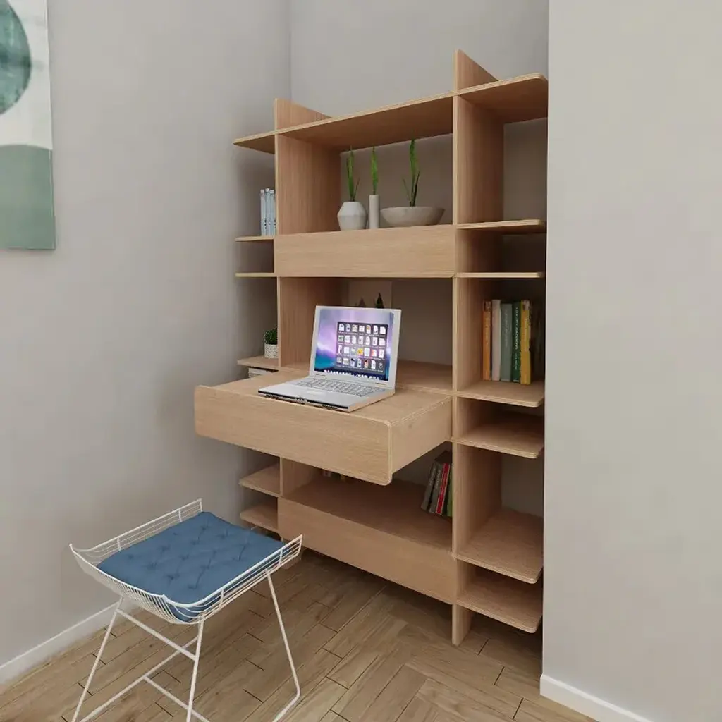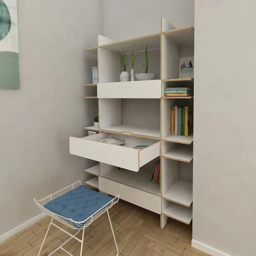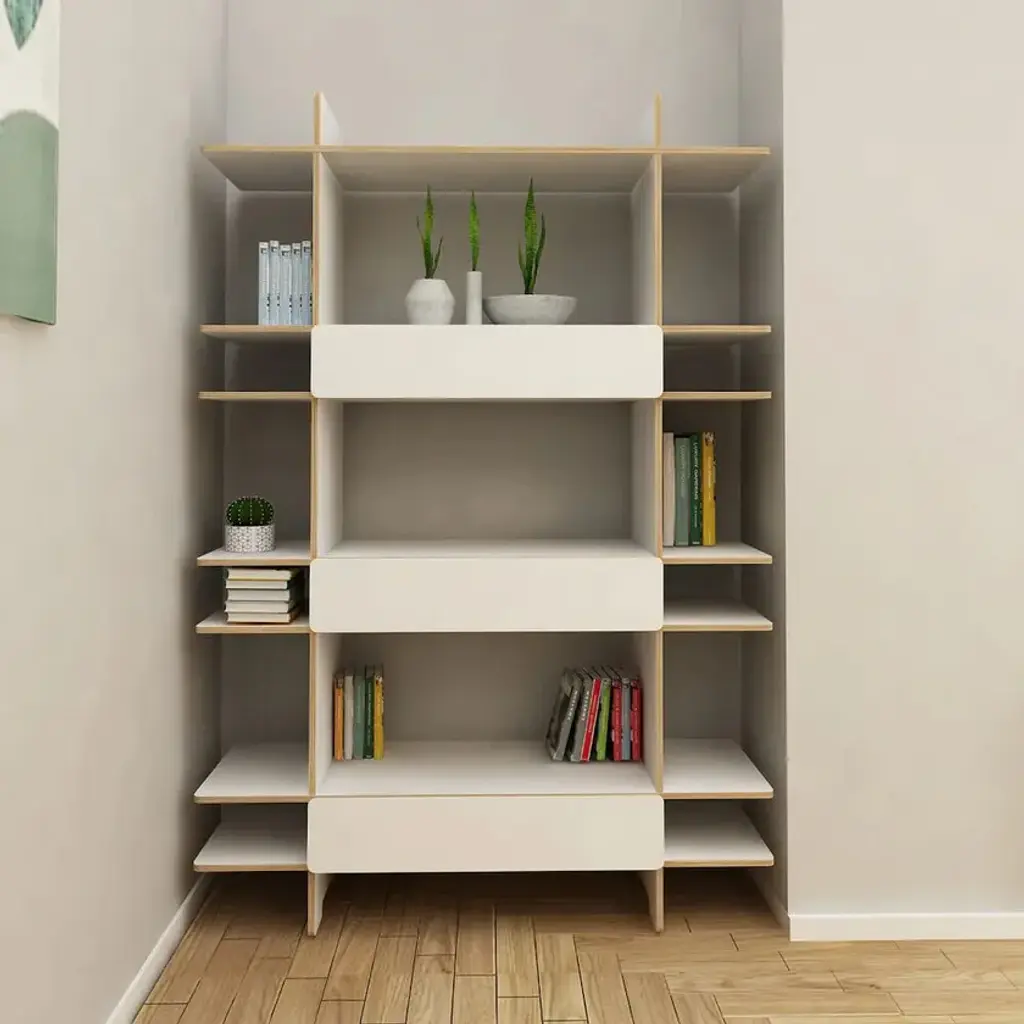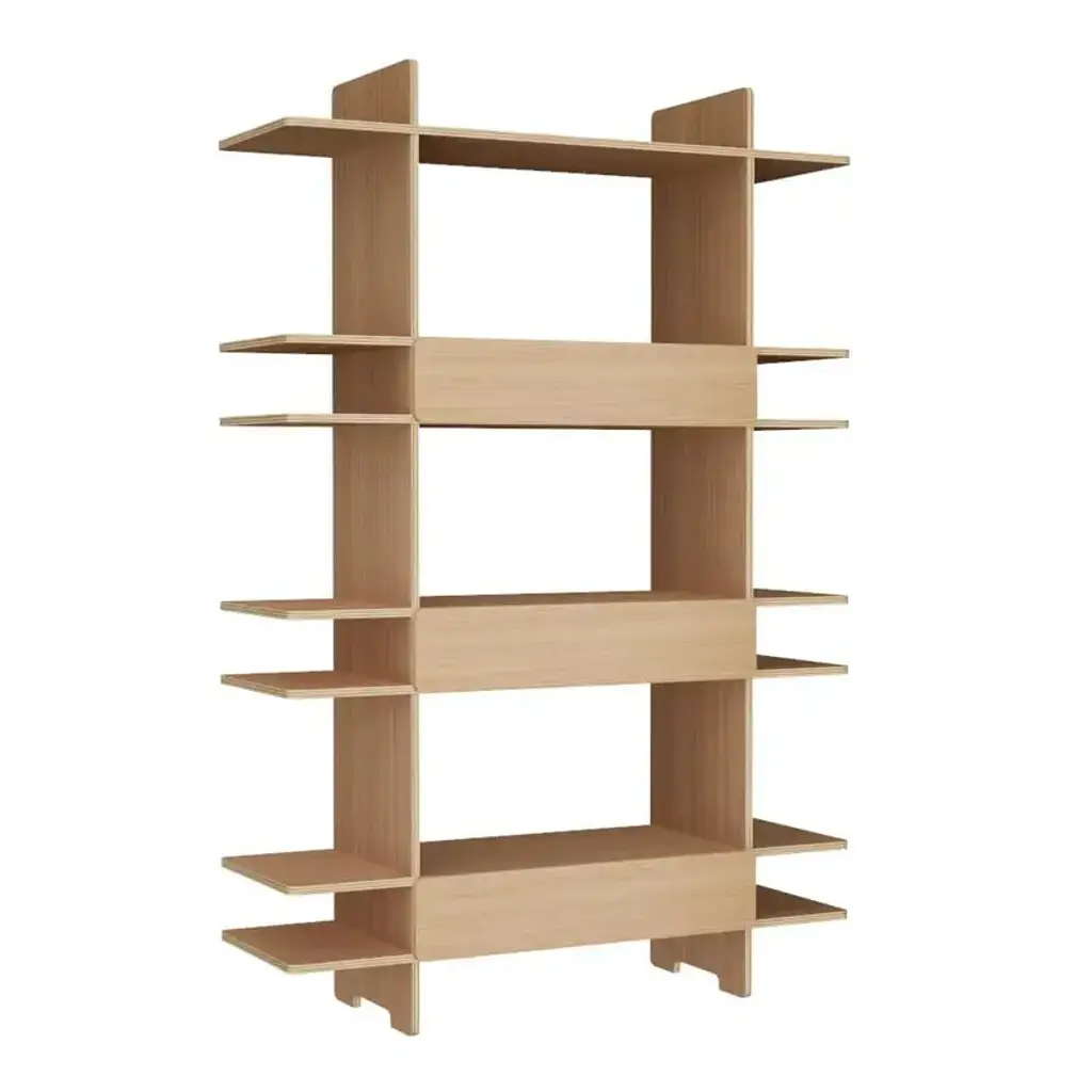 Our Pagoda shelf is like a furniture version of the famous Japanese house. It looks as if it is spreading its wings to rise to new heights. And that is exactly what it is doing – taking the standard of what a stunning shelf should look like to a new height.With plenty of shelf space and a unique design, it will be a crown jewel in any room. The heights of the shelf spaces are 14 and 34 cm.Soft-closing fully opening hidden drawer rails open three spacious drawers with a width of 66 cm, depth of 32.5 cm, height of 10.5 cm. There is also a work surface on top of the middle drawer, which can be used as a pull-out desk for the home office – height 78 cm. If desired, the removable work surface can also be used as a computer stand outside the shelf – for example, while sitting on the sofa, etc.Made of Koskisen 13 mm white durable high-pressure laminate (HPL) plywood and 16 mm oak veneered plywood, oil-waxed.
