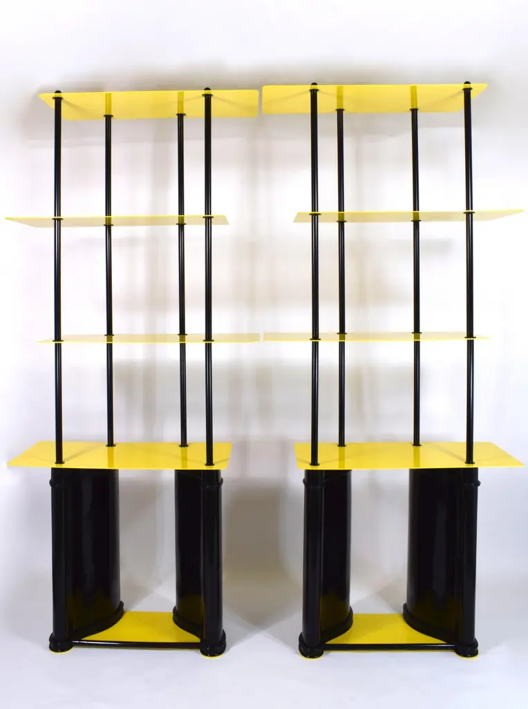 Pair of “DilàDiquà” bookcases from the “Trasformatio” collection,design Michele Iodice exclusively for the Esprit Nouveau gallery.Limited Edition 2/2Movable structures in black and yellow pre-painted iron,bases in shaped and ebonized wood, Italy 1940/2022TRASFORMATIODesign Non ConvenzionaleTRASFORMATIO is a design line born from the collaboration between the artist Michele Iodice and the Esprit Nouveau Gallery in Naples.Alberta Saladino, founder and soul of Esprit Nouveau Gallery, has been proactively involved in ‘900 antique pieces research during the last twenty years and invited Michele Iodice to think of a way to reinterpret some Art Deco complementary design and furnishing pieces, from her private collection.TRASFORMATIO project has a pioneer and artistic soul able to set the connection lines between past, present and future.The whole idea was born with the aim to explore interactions between art and design.TRASFORMATIO traces an historical path in human minds, that starts with the birth of design and reaches our living present, embracing artistic novelties with wisdom.The common thread of the exhibition is dynamism.“Most of the people think a furnishing piece can only be a set of elements that move in the emptiness of space. Nevertheless, for others it can be poetry”.Alexander Calder described his most successful pieces of work with the above words.Michele Iodice, fully interprets his thought through TRASFORMATIO. His art works are fluctuating in a dynamic equilibrium where they are able to break the physical limits of traditional static furniture, attributing them movement and lightness.TRASFORMATIO artistic methods can be applied to every kind of support.It does not reproduce, but it tears the item out of its traditional context to revive it, instead, in a completely different and new environment.The setup personally curated by the Neapolitan artist, combines a collection of pieces that express the close relationship between design and contemporary art, as well as the strong connection between cultural stratification and innovation.Every object signed by Michele Iodice is rigorously realized by local artisans and tells about the attention to detail behind it, in a process that enhances the principles and values of “artigianato cosciente”, in English, “conscious craftsmanship”.The materials used spans from wood, parchment, and Plexiglas, to steel, combined in a fusion that is aimed to reflect the complexity of the research that Iodice has been performing since years.