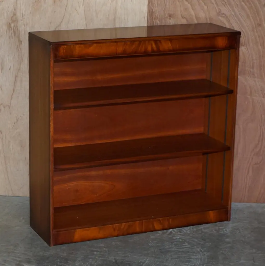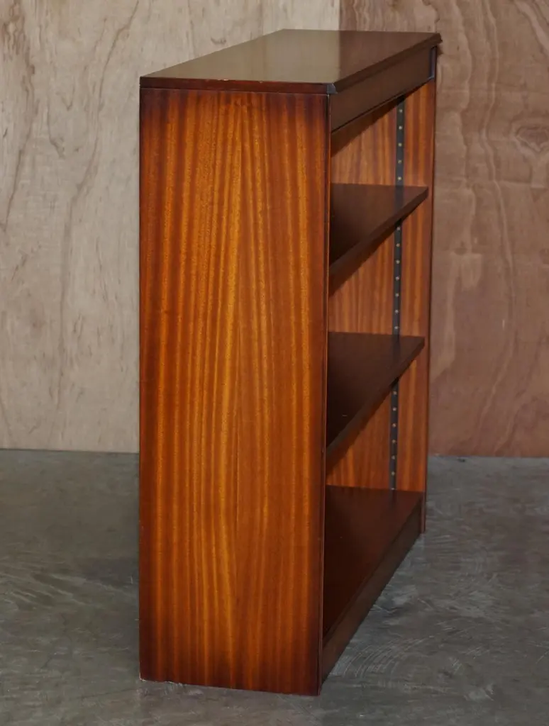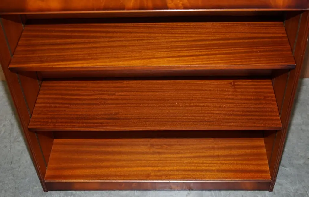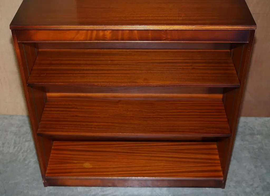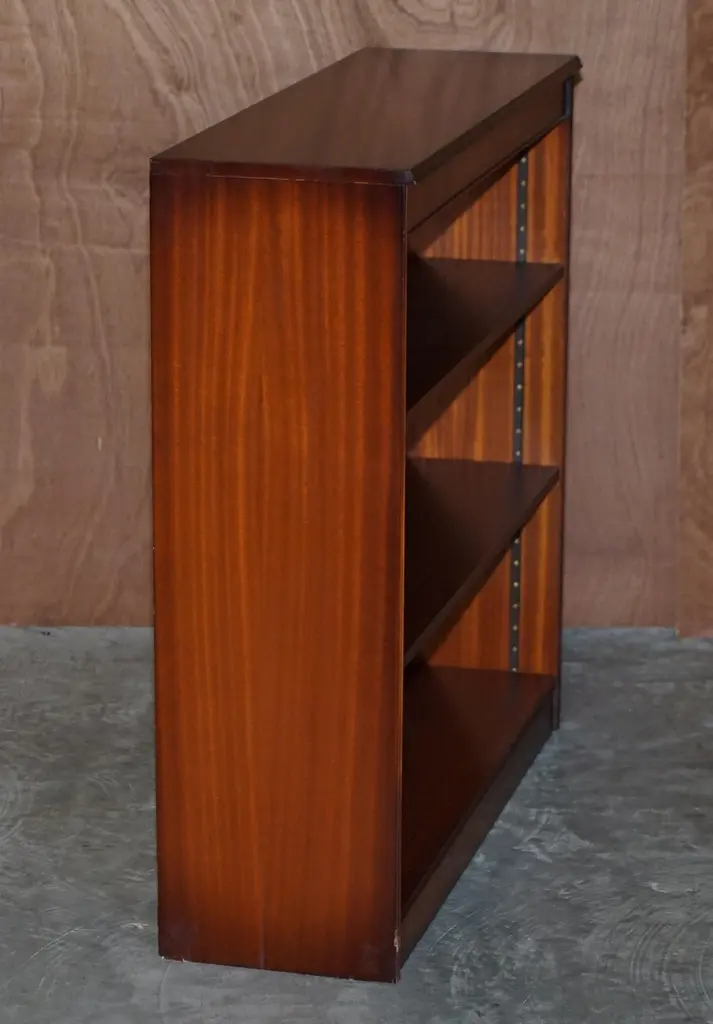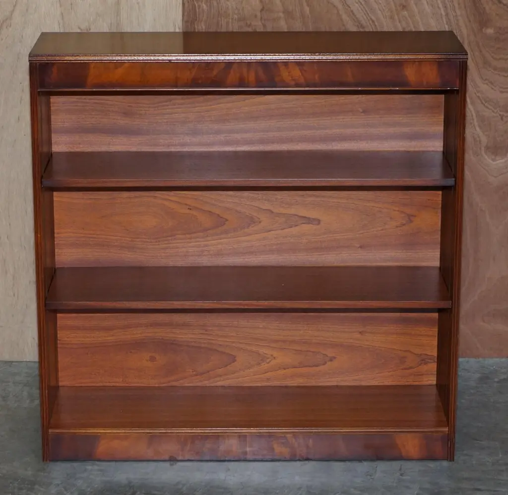 We are delighted to offer this stunning matching pair of Shaws of London dwarf open library bookcases in flamed mahogany which are part of a suiteI have two matching pairs of these bookcases, this pair and another exactly the same but slightly deeper which are listed under my other items. They are modular so can be used individually or side by side. I imagine they can be stacked one on top of the other but I haven’t checked They are good looking and well made pieces, they are luxury flamed mahogany veneer over a hard wood frame, the shelves are removable and height adjustableWe have cleaned waxed and polished them from top to bottom, I can’t see any issues anywhere but most likely there will be the odd bit of patina here or thereDimensionsHeight:- 91.5cmWidth:- 91.5cmDepth:- 29cmPlease note all measurements are taken at the widest point, This item is available for collection from our Pulborough warehouses RH20 1DF.ConditionPlease view the very detailed pictures as they form part of the description pertaining to the condition. Please note vintage period and original items such as leather seating will always have natural patina in the form of creasing and wear, we recommend annual waxing to ensure no moisture is lost, also hand dyed leather is not recommended to sit in direct sunlight for prolonged periods of time as it will dry out and fade.