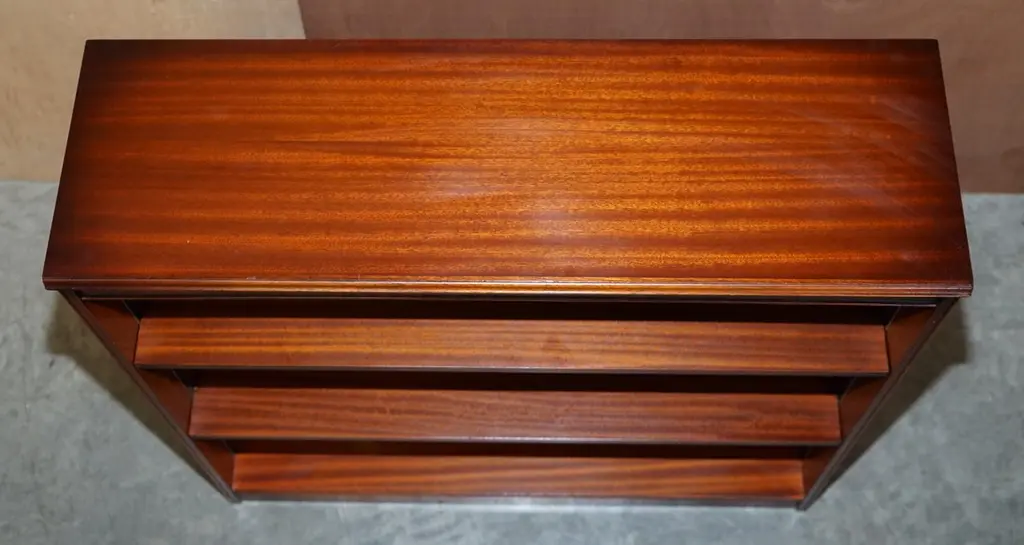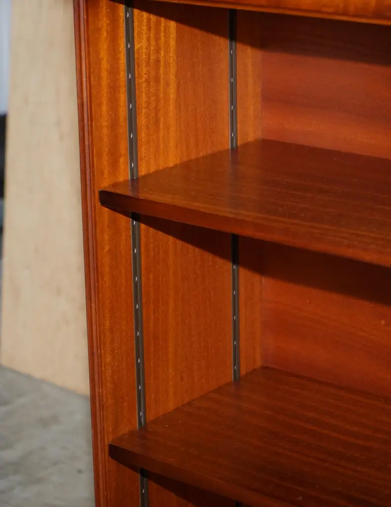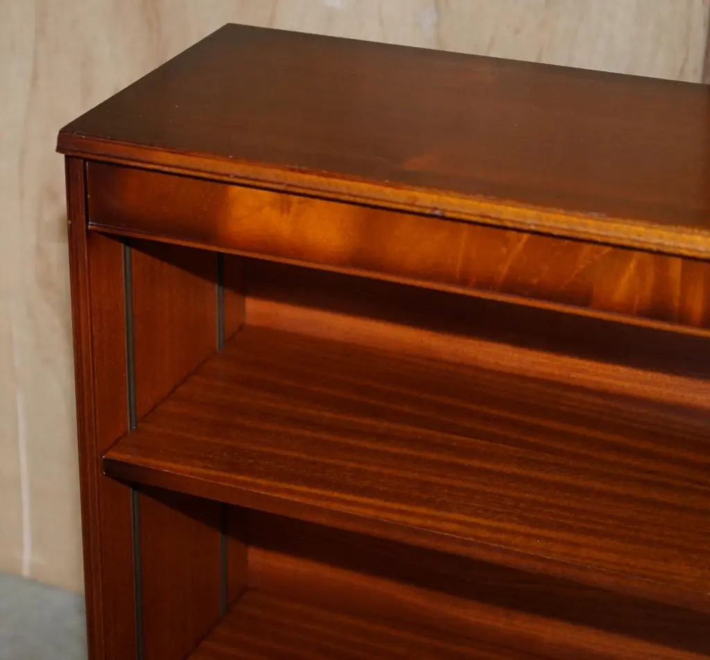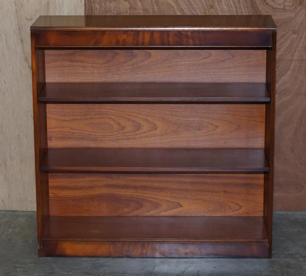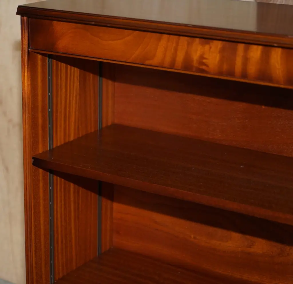 We are delighted to offer this stunning matching pair of Shaws of London dwarf open library bookcases in flamed mahogany which are part of a suiteI have two matching pairs of these bookcases, this pair and another exactly the same but slightly deeper which are listed under my other items. They are modular so can be used individually or side by side. I imagine they can be stacked one on top of the other but I haven’t checked They are good looking and well made pieces, they are luxury flamed mahogany veneer over a hard wood frame, the shelves are removable and height adjustableWe have cleaned waxed and polished them from top to bottom, I can’t see any issues anywhere but most likely there will be the odd bit of patina here or thereDimensionsHeight:- 91.5cmWidth:- 91.5cmDepth:- 29cmPlease note all measurements are taken at the widest point, This item is available for collection from our Pulborough warehouses RH20 1DF.ConditionPlease view the very detailed pictures as they form part of the description pertaining to the condition. Please note vintage period and original items such as leather seating will always have natural patina in the form of creasing and wear, we recommend annual waxing to ensure no moisture is lost, also hand dyed leather is not recommended to sit in direct sunlight for prolonged periods of time as it will dry out and fade.