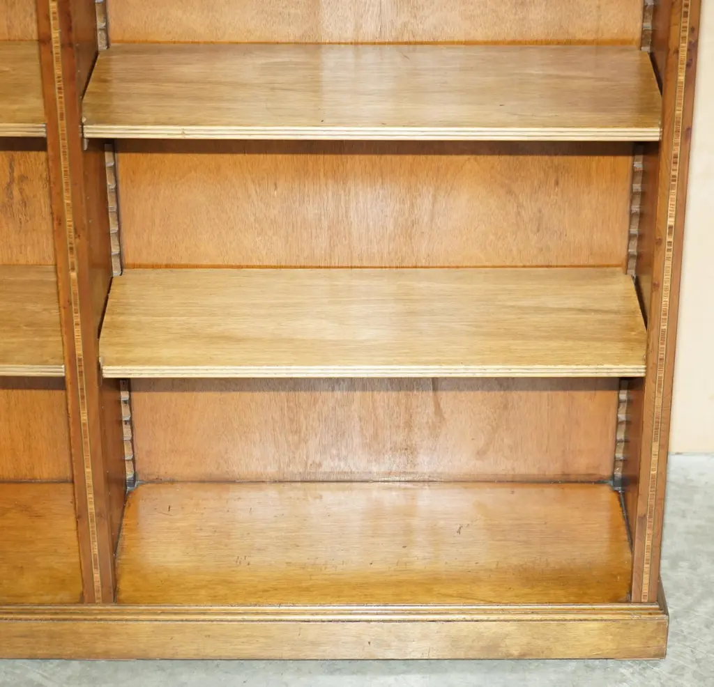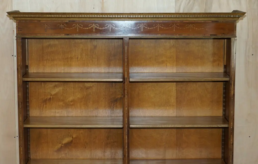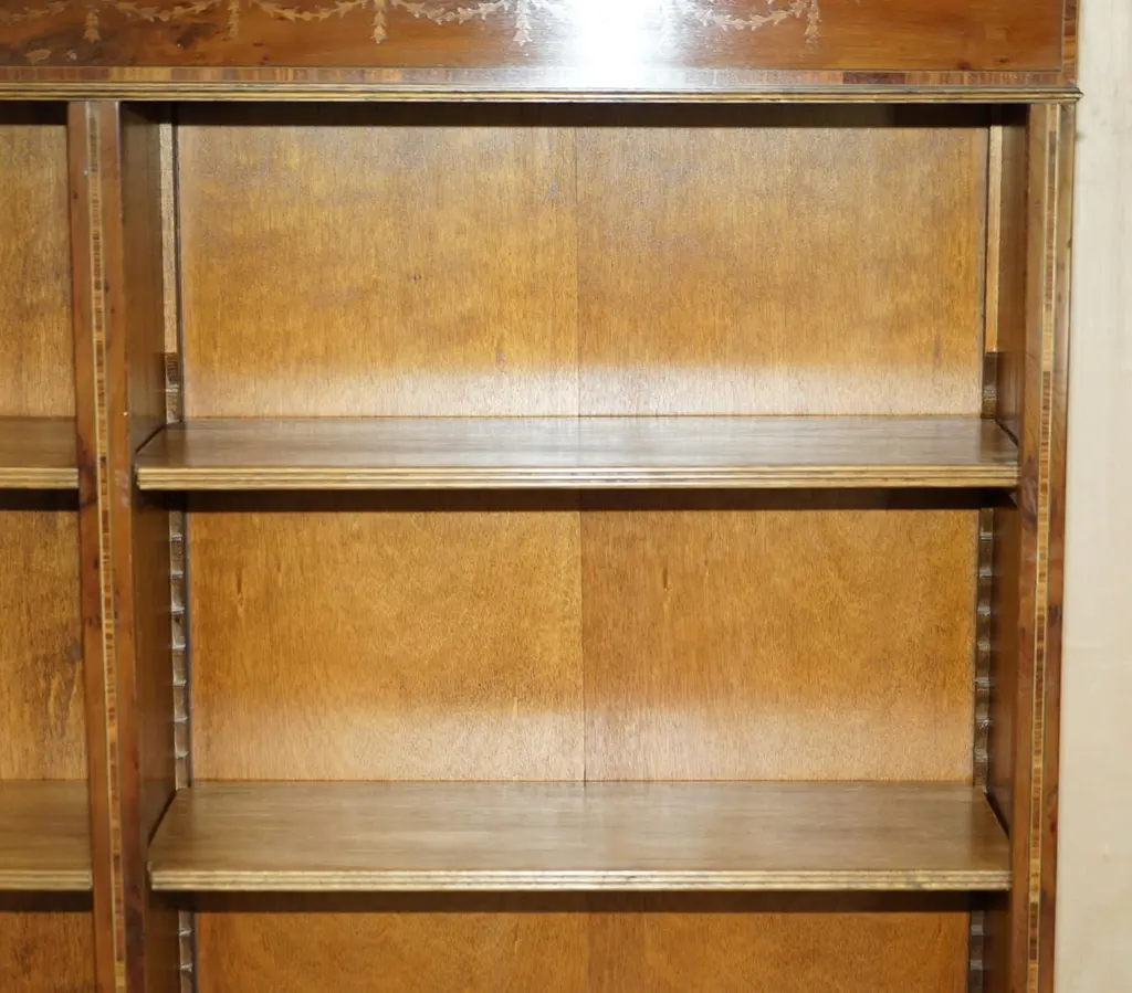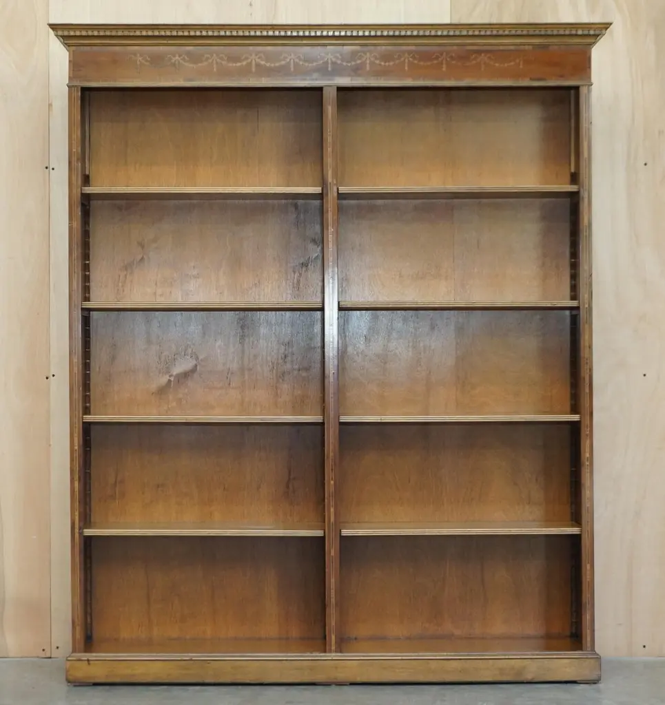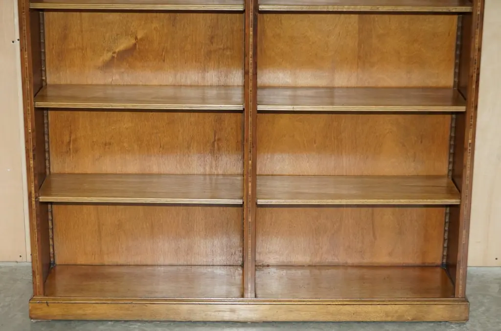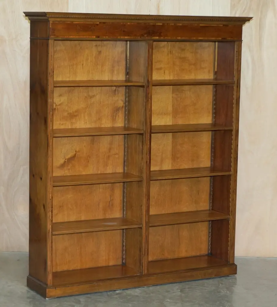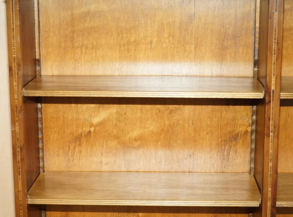 We are delighted to offer for this stunning pair of Sheraton Revival large open library bookcases in light satinwood with burr walnut & yewA very good looking well made and decorative pair, the shelves are all height adjustable and or removable so they can be adjusted to take any size books/ Each piece is in light timbers with lovely walnut Sheraton inlayCondition wise they have been cleaned waxed and polished, they have some light patination marks here or there but mostly they are very fine examplesDimensionsHeight:- 183cmWidth:- 155.5cmDepth:- 35cmPlease note all measurements are taken at the widest pointThis item is available for collection from our Pulborough warehouses ConditionPlease view the very detailed pictures as they form part of the description pertaining to the condition.Please note vintage period and original items such as leather seating will always have natural patina in the form of creasing and wear, we recommend annual waxing to ensure no moisture is lost, also hand dyed leather is not recommended to sit in direct sunlight for prolonged periods of time as it will dry out and fade.