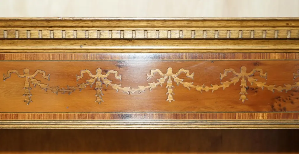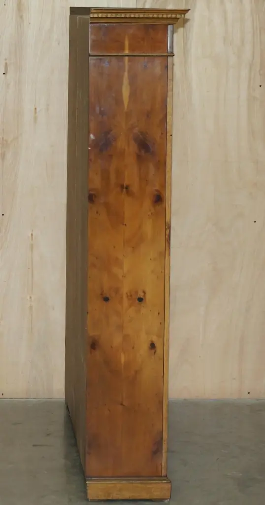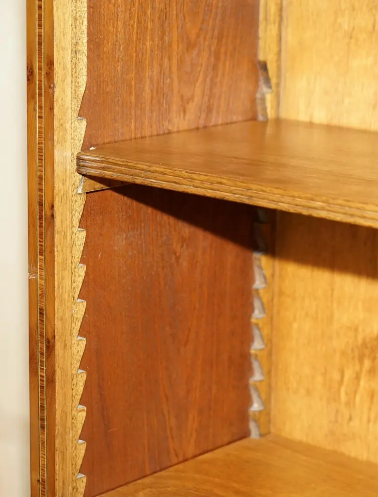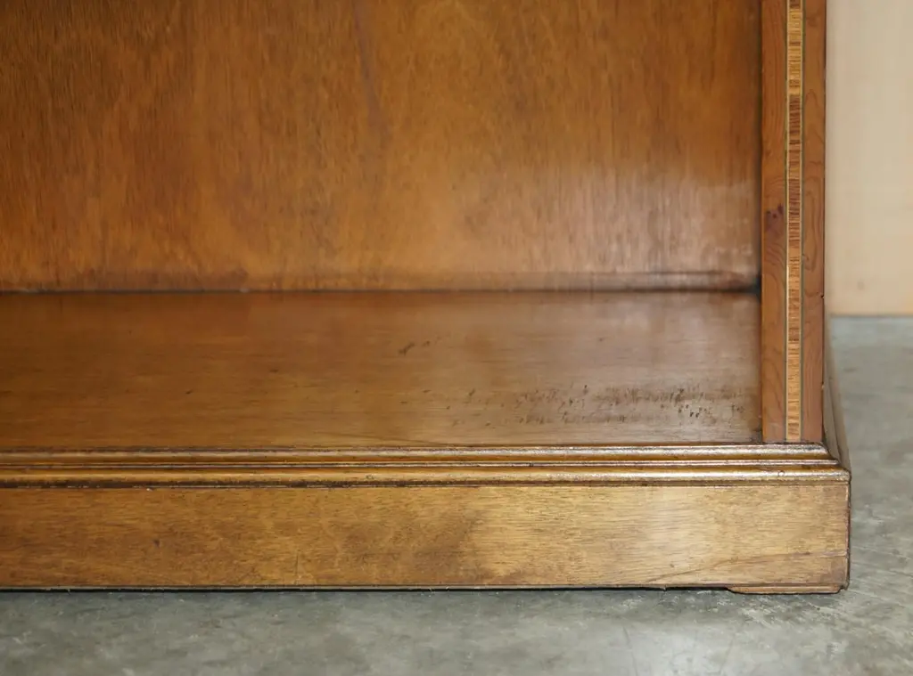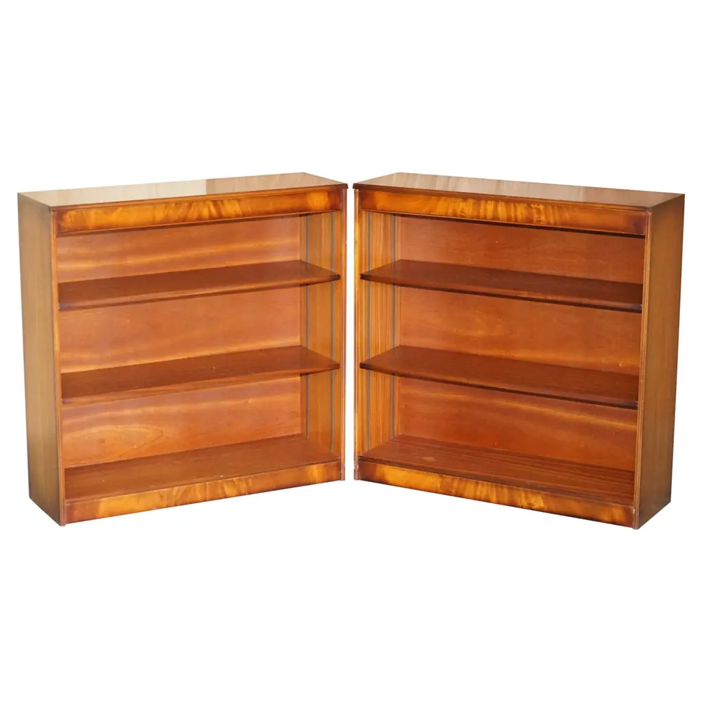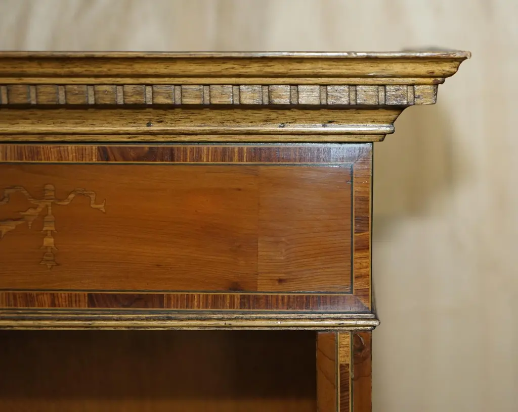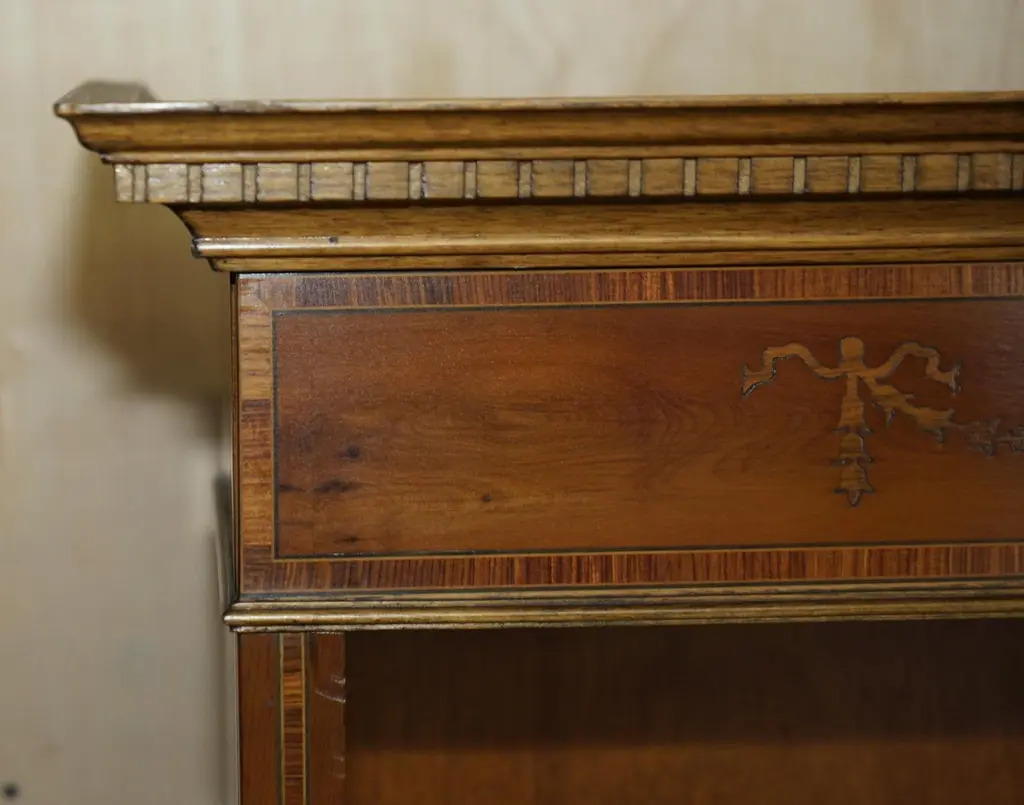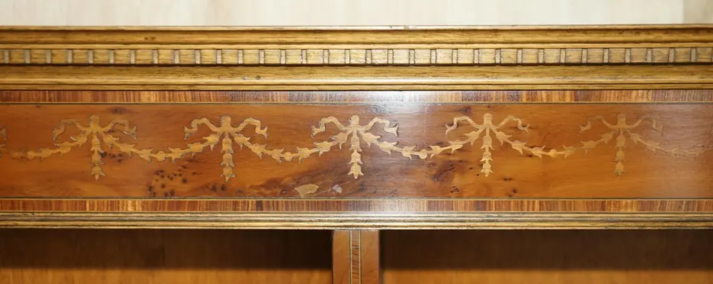 We are delighted to offer for this stunning pair of Sheraton Revival large open library bookcases in light satinwood with burr walnut & yewA very good looking well made and decorative pair, the shelves are all height adjustable and or removable so they can be adjusted to take any size books/ Each piece is in light timbers with lovely walnut Sheraton inlayCondition wise they have been cleaned waxed and polished, they have some light patination marks here or there but mostly they are very fine examplesDimensionsHeight:- 183cmWidth:- 155.5cmDepth:- 35cmPlease note all measurements are taken at the widest pointThis item is available for collection from our Pulborough warehouses ConditionPlease view the very detailed pictures as they form part of the description pertaining to the condition.Please note vintage period and original items such as leather seating will always have natural patina in the form of creasing and wear, we recommend annual waxing to ensure no moisture is lost, also hand dyed leather is not recommended to sit in direct sunlight for prolonged periods of time as it will dry out and fade.